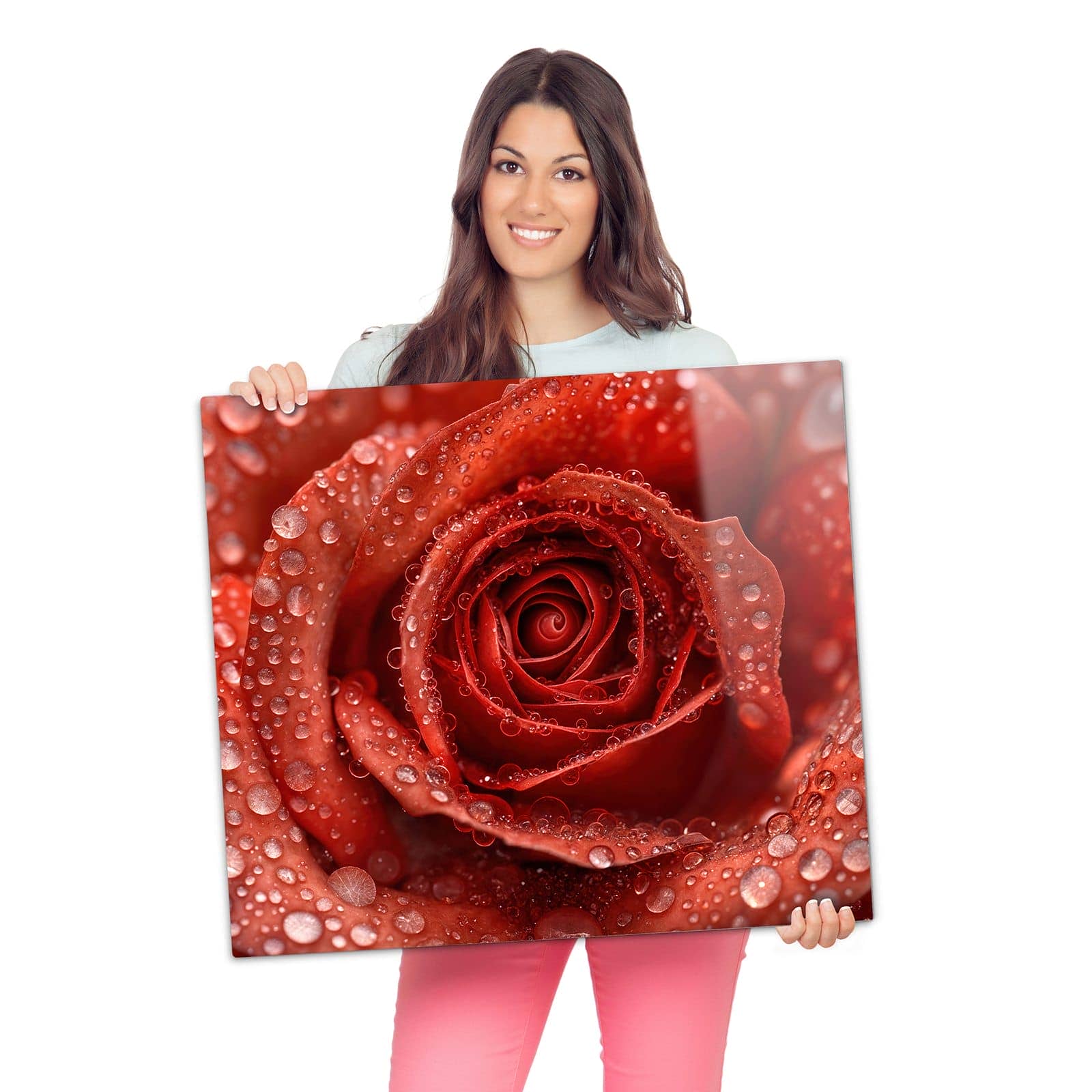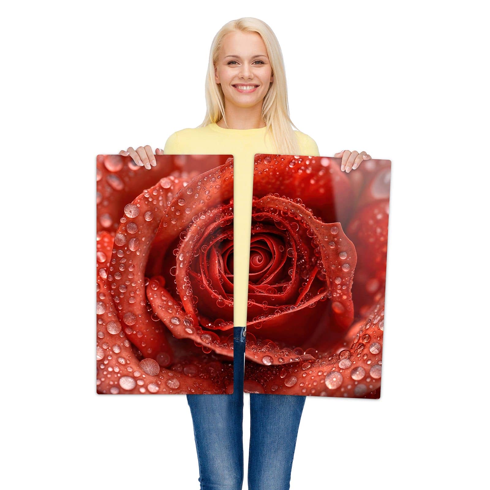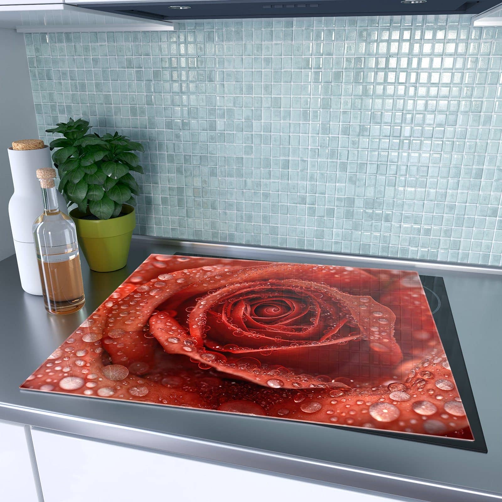 Mit einer Dicke von 4 mm besteht die Platte aus gehärtetem Glas, das sich durch seine robuste Beschaffenheit auszeichnet. Dies macht sie widerstandsfähig gegen Schnitte, Kratzer und Stöße. Die Oberfläche der Abdeckplatte ist zudem mit einer speziellen Folie versehen, die für beeindruckende Farbbrillanz und Farbtiefe sorgt. Das Motiv Wassertropfen Rose wird detailreich auf das Glas gedruckt.