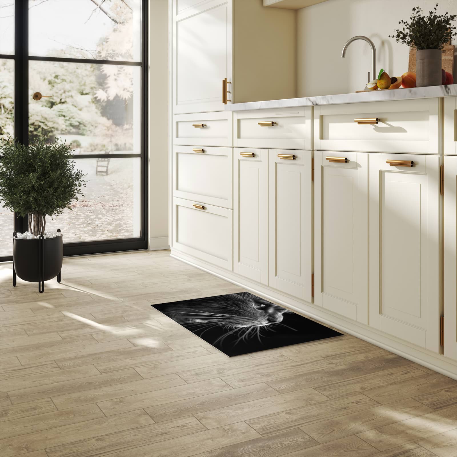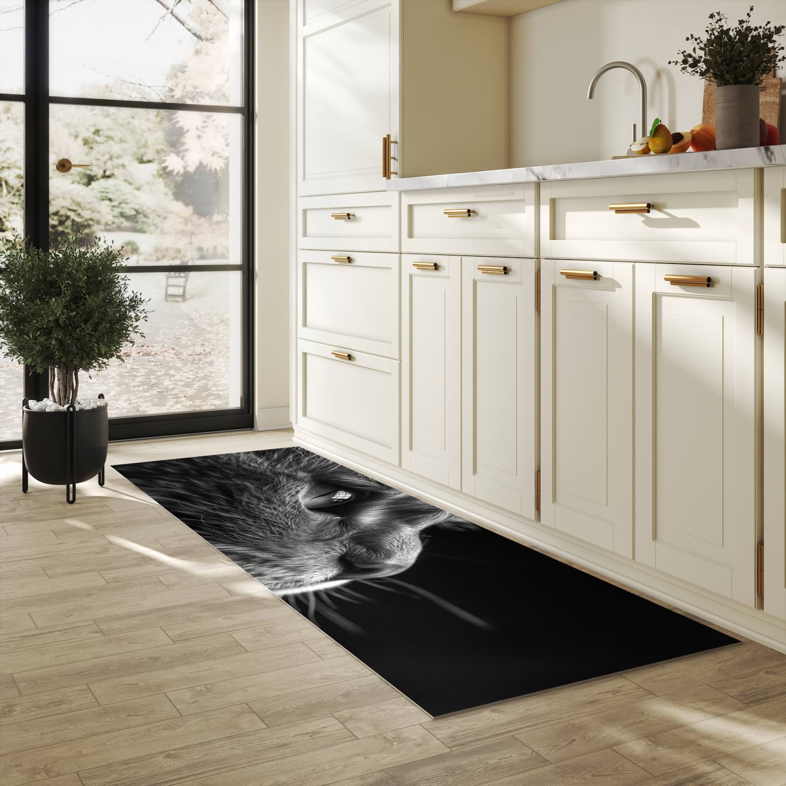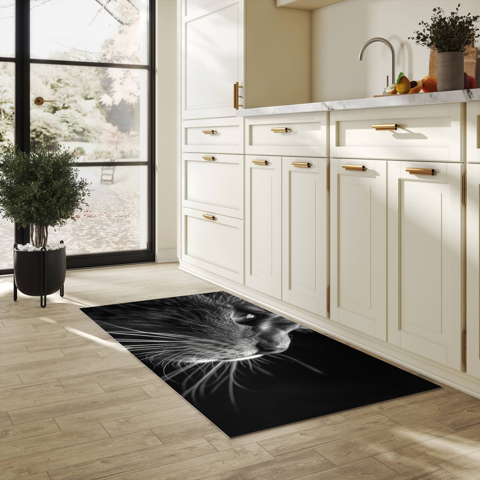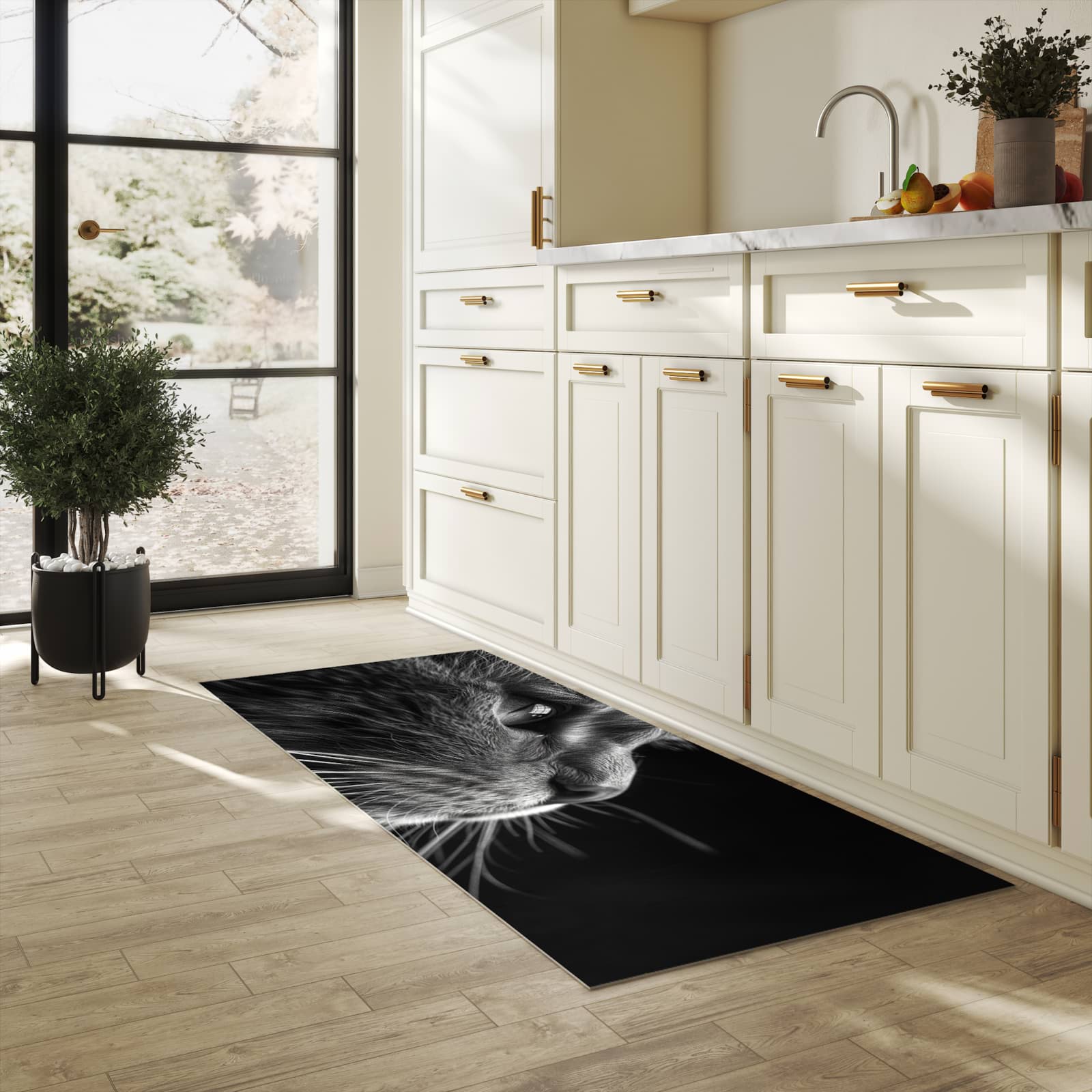 Für Tierliebhaber und Katzenfreunde – die elegante Profilansicht einer Katze in kontrastreichen Schwarz-Weiß-Tönen verleiht diesem Teppich für die Küche eine majestätische und zeitlose Ausstrahlung. Die detailreiche Darstellung des samtigen Fells erzeugt eine ruhige, nachdenkliche Atmosphäre und passt perfekt zu modernen sowie minimalistischen Einrichtungsstilen. Dieser stilvolle Küchenläufer bringt die geheimnisvolle Anmut und Eleganz von Katzen in Ihr Zuhause und wird zum echten Blickfang in jeder Küche.