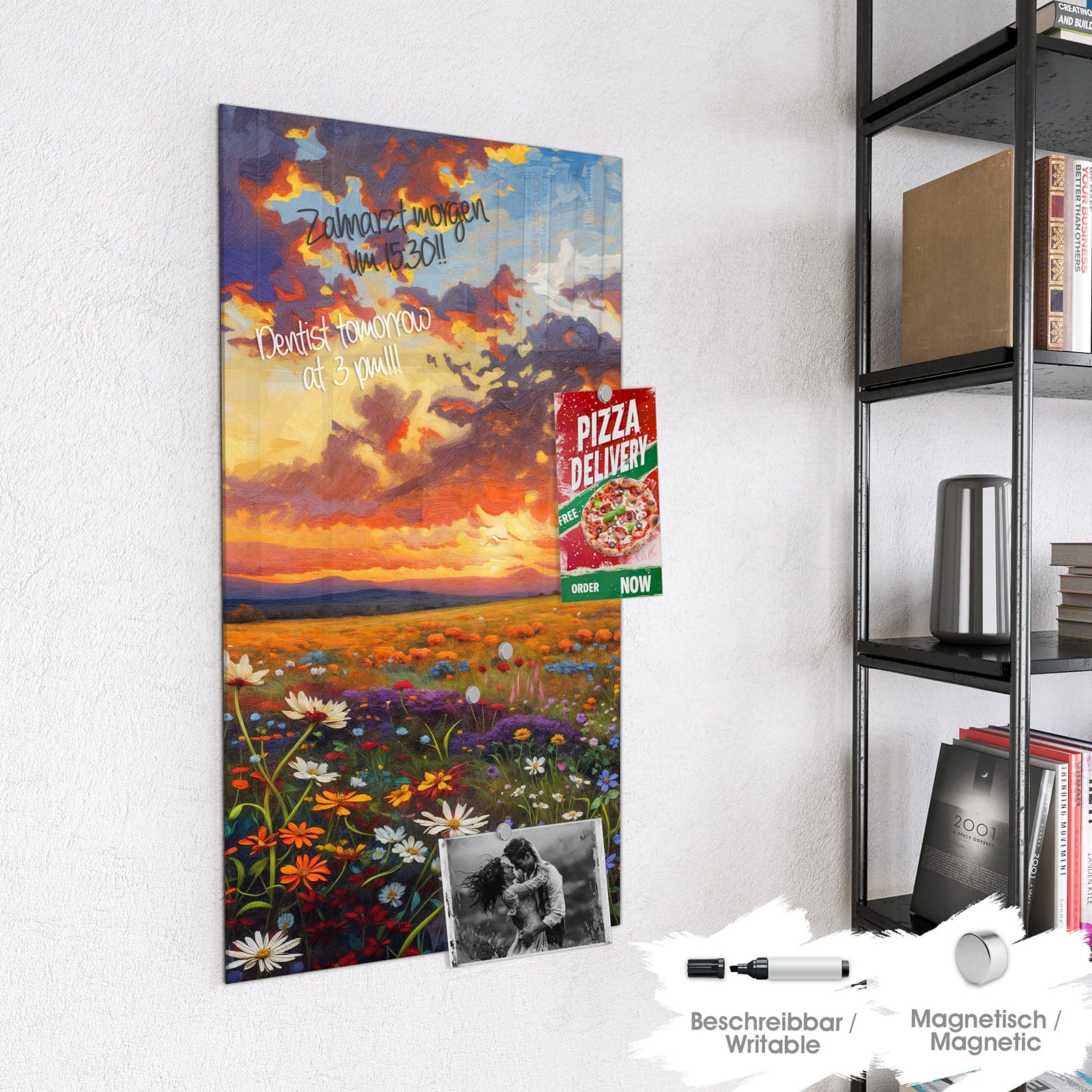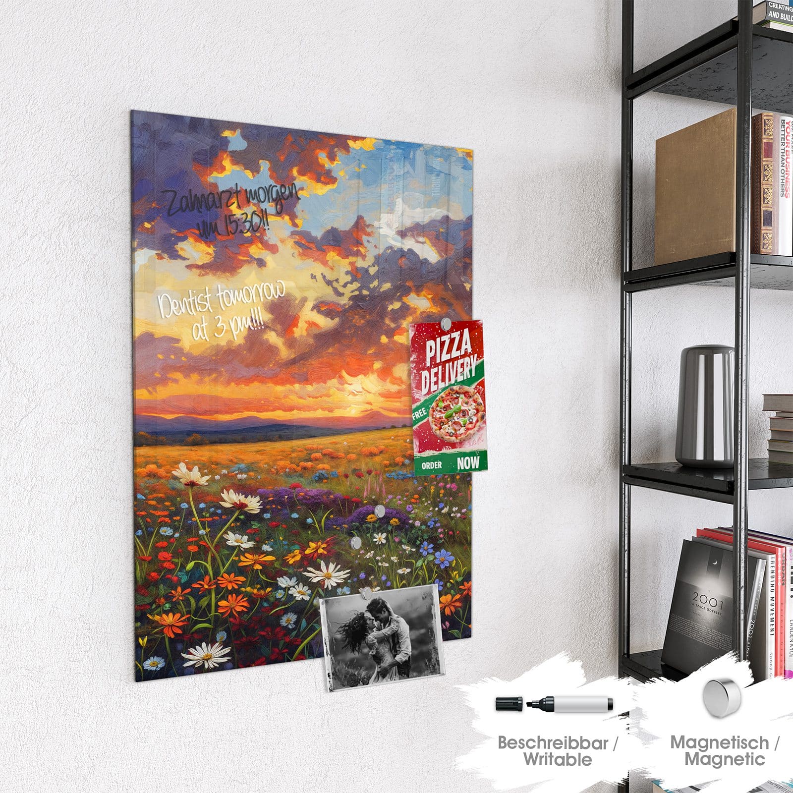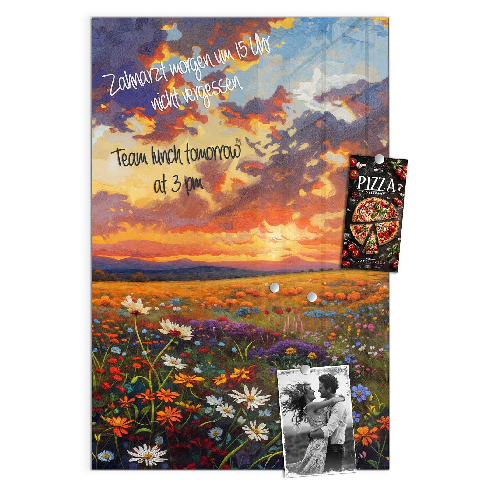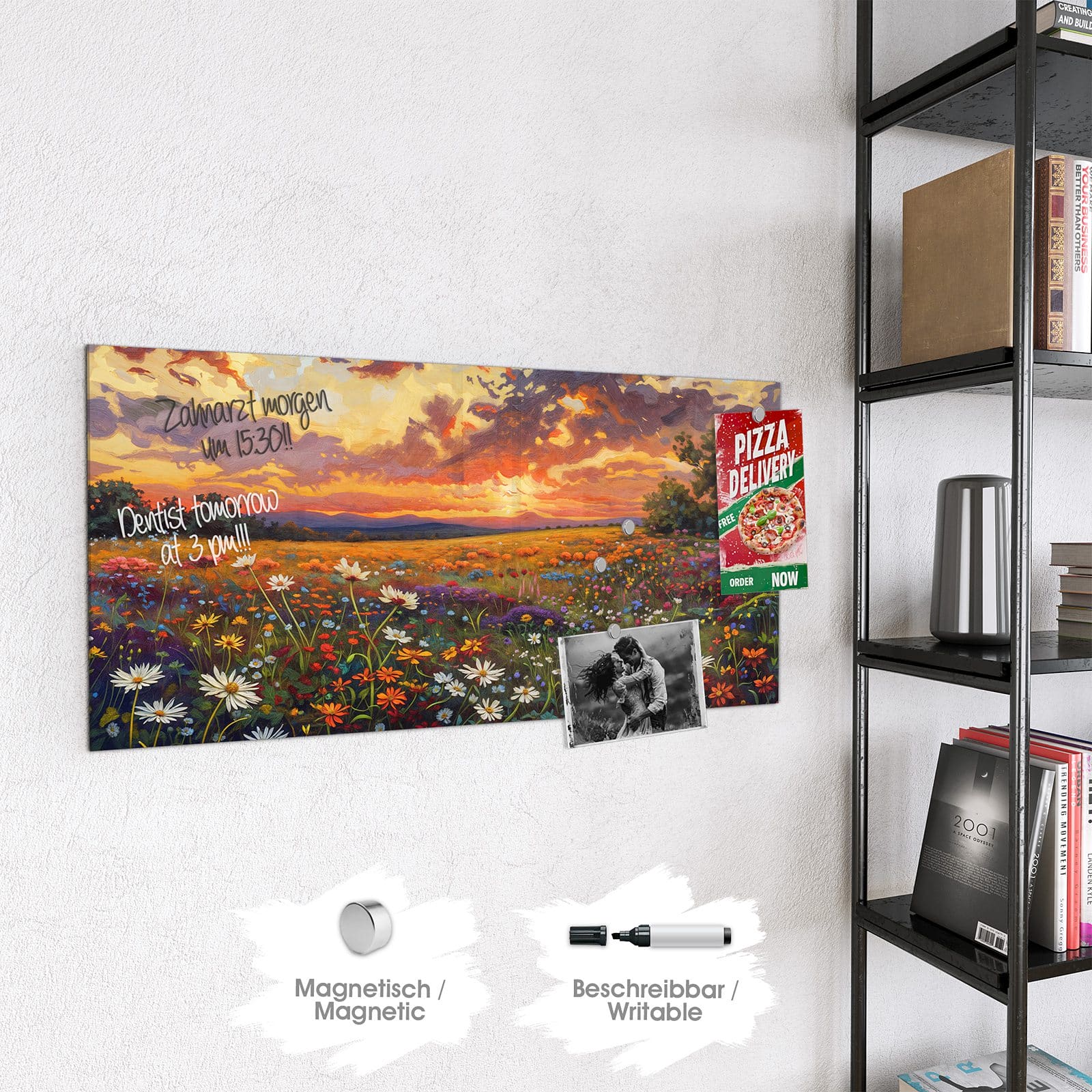 Stilvolle Glas-Magnettafel für Ihr Zuhause - Motiv Blumenwiese Sonnenuntergang