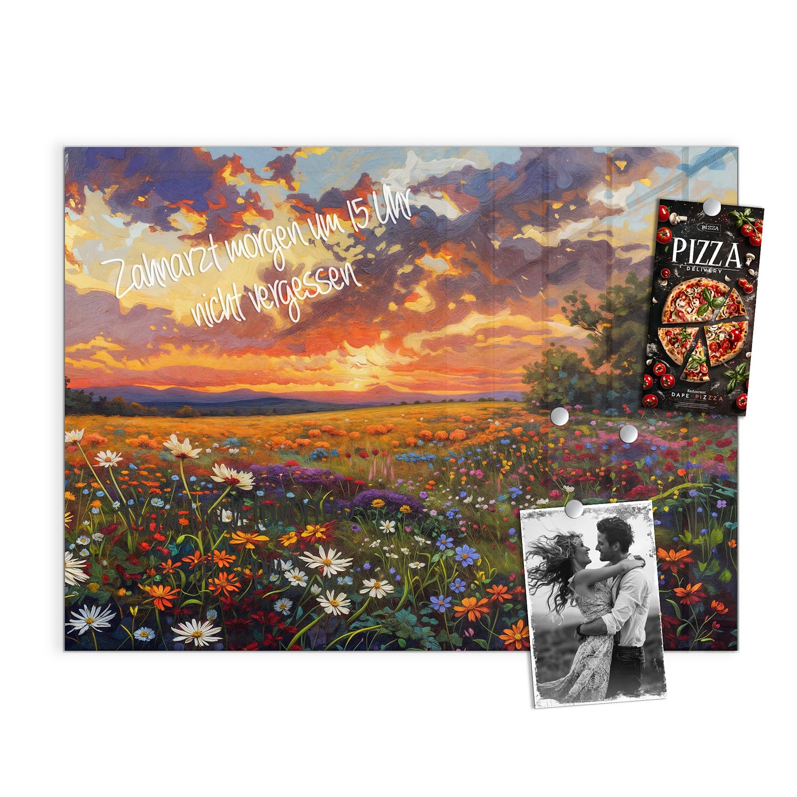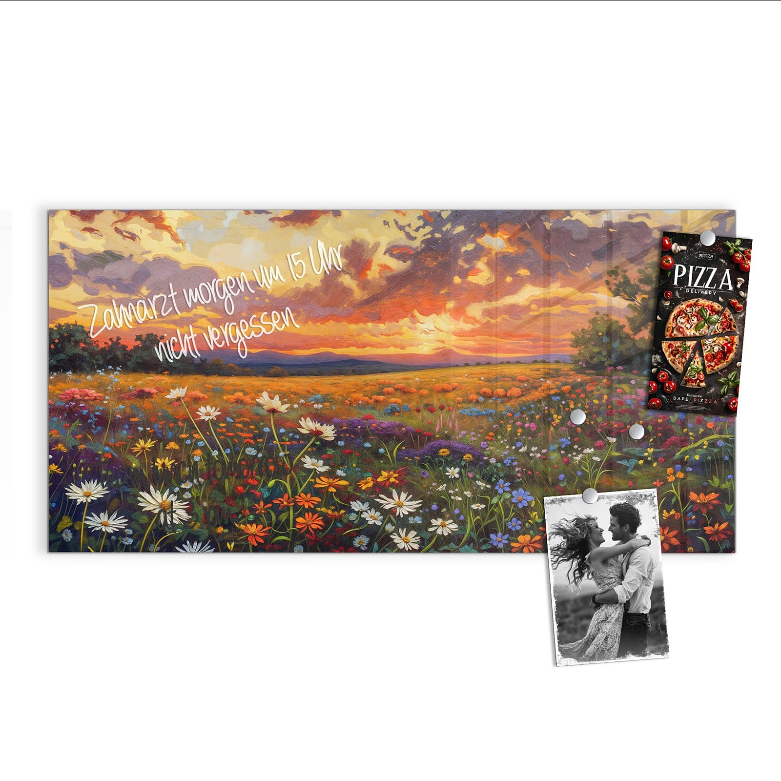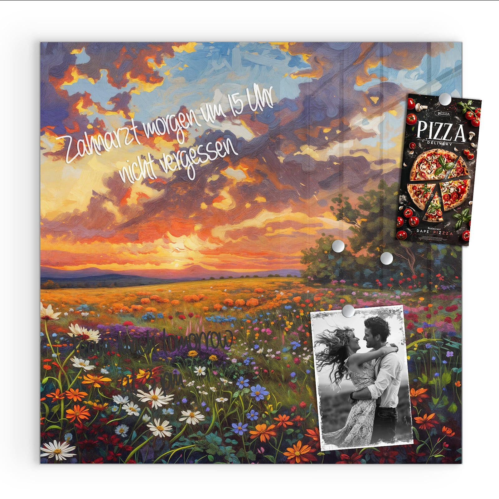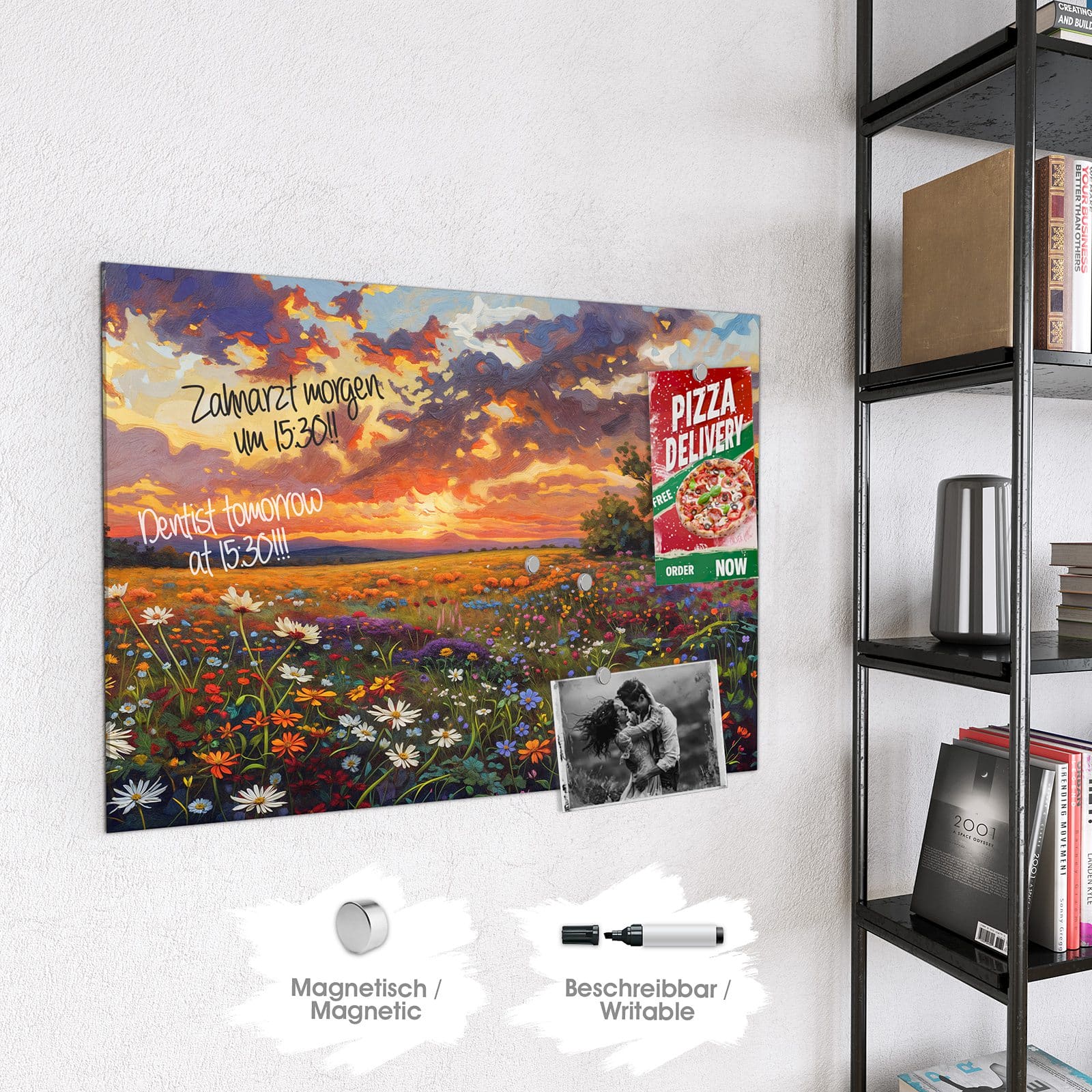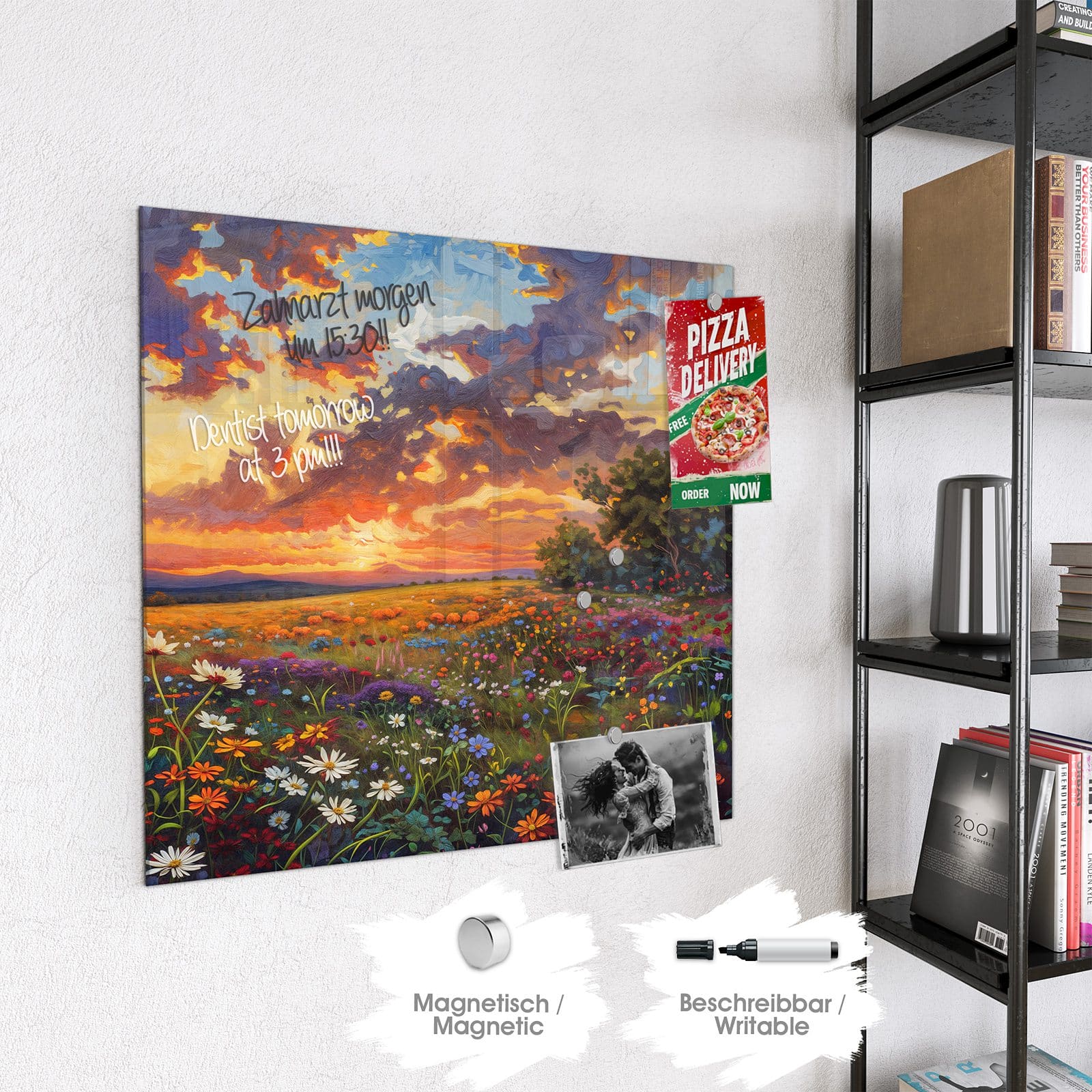 Stilvolle Glas-Magnettafel für Ihr Zuhause - Motiv Blumenwiese Sonnenuntergang