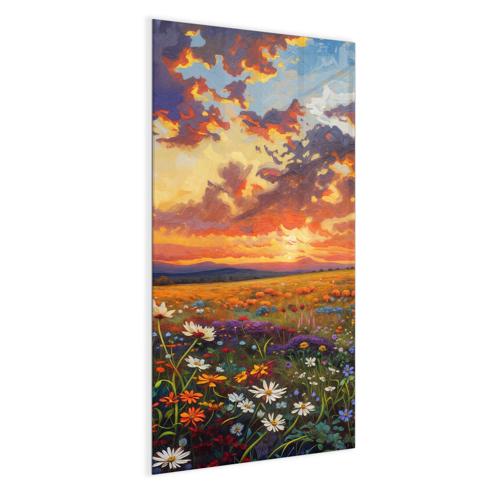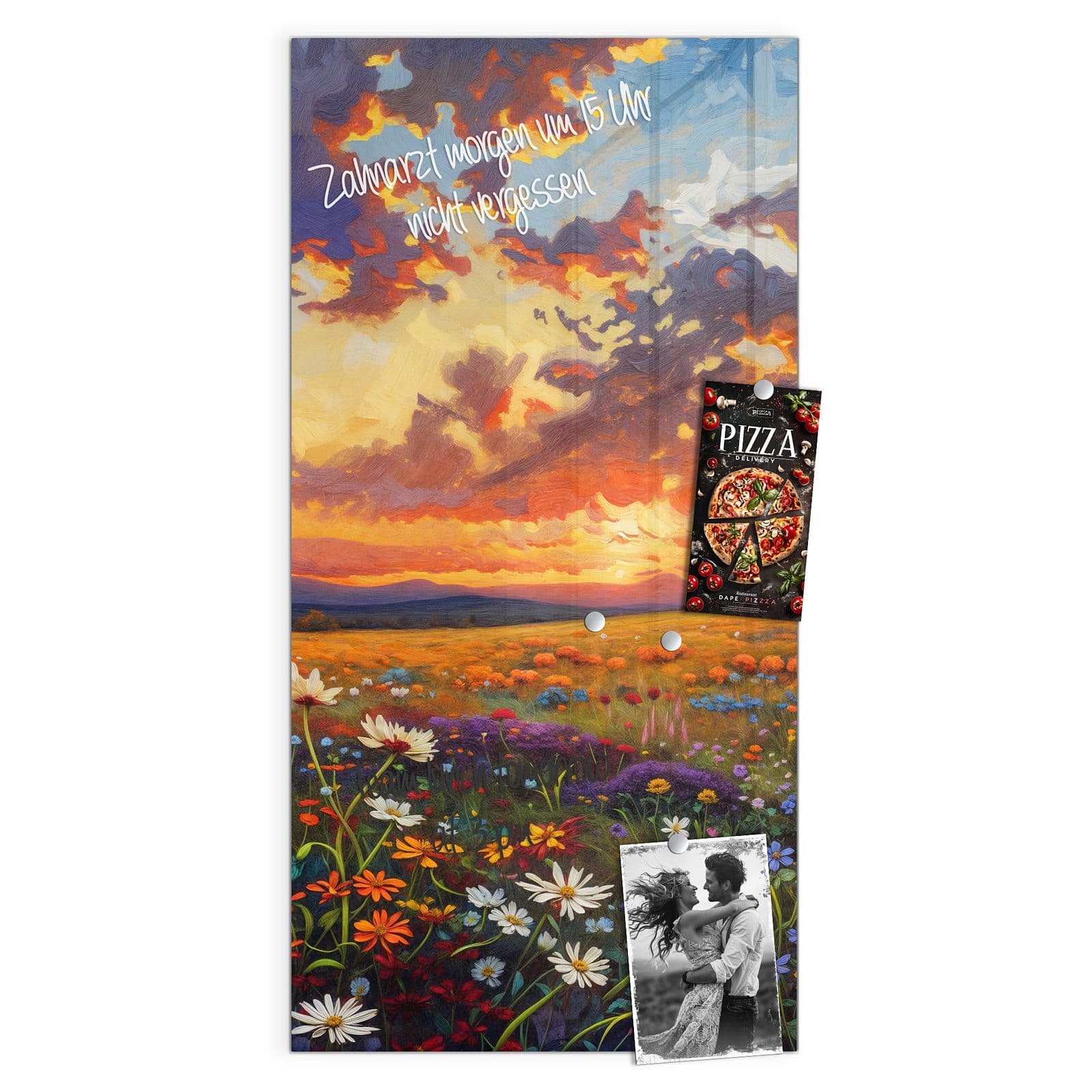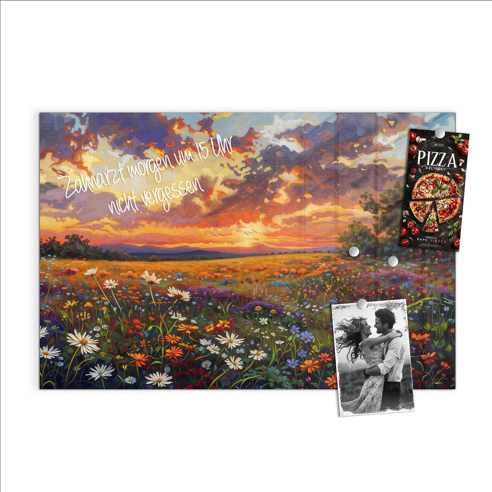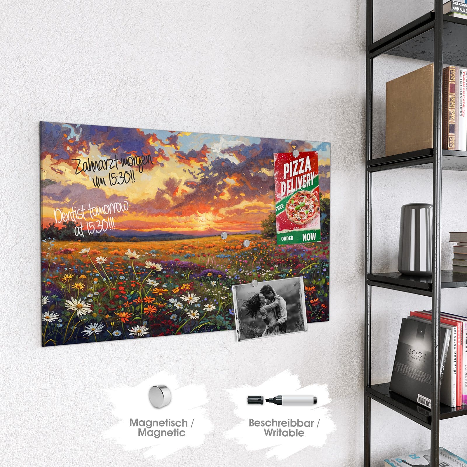 Stilvolle Glas-Magnettafel für Ihr Zuhause - Motiv Blumenwiese Sonnenuntergang