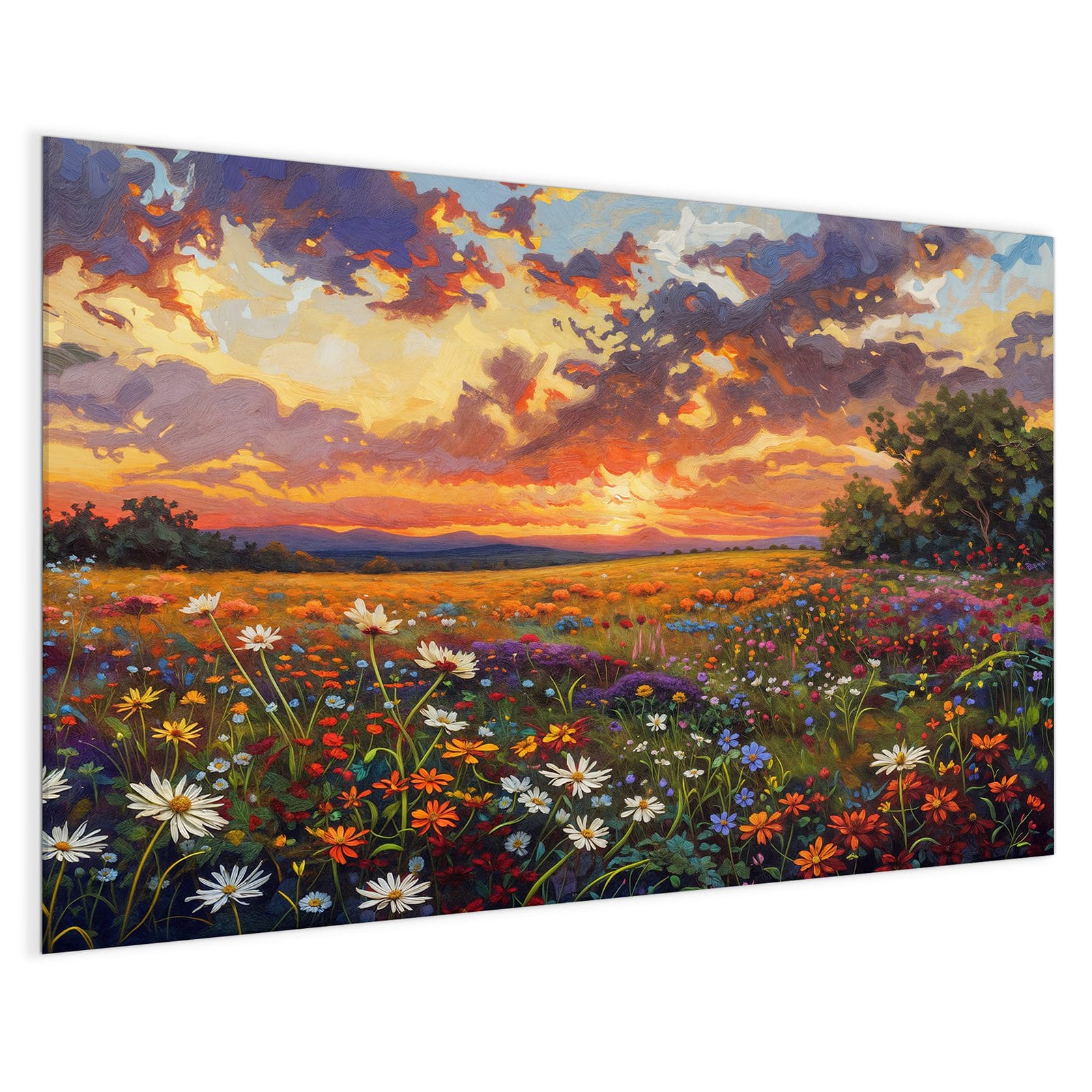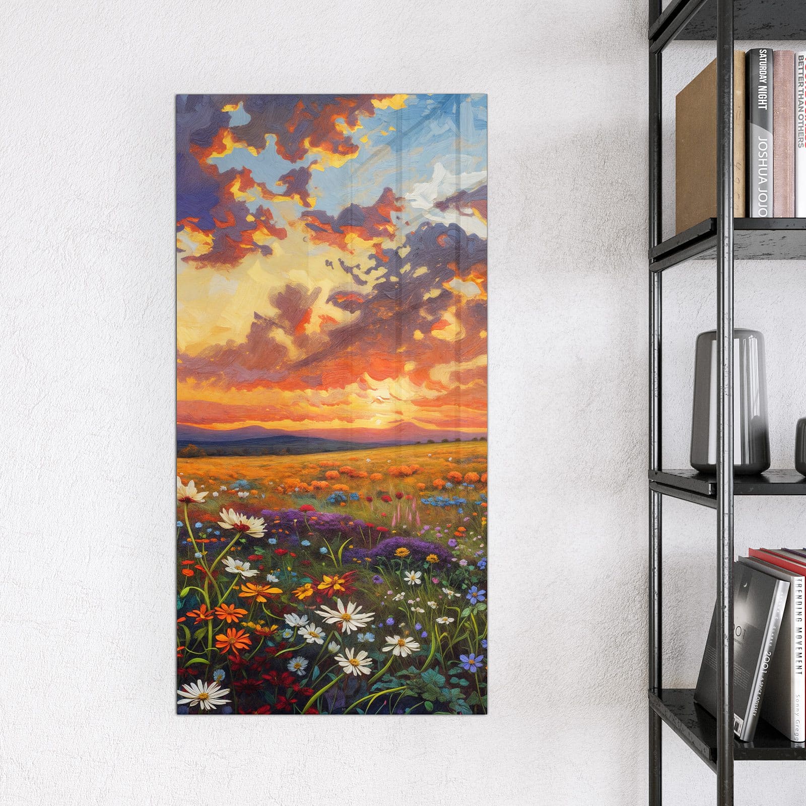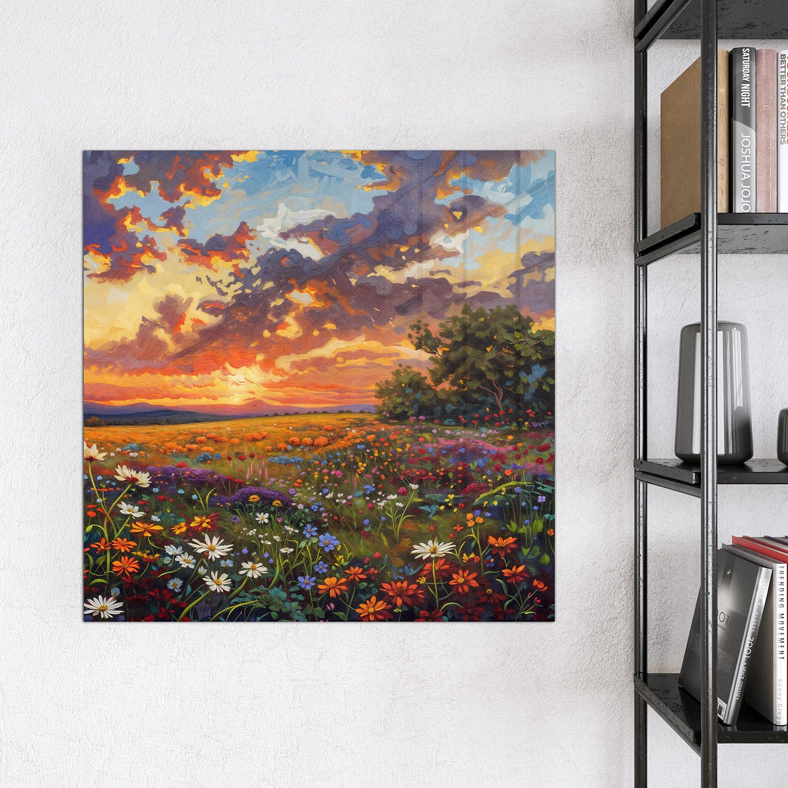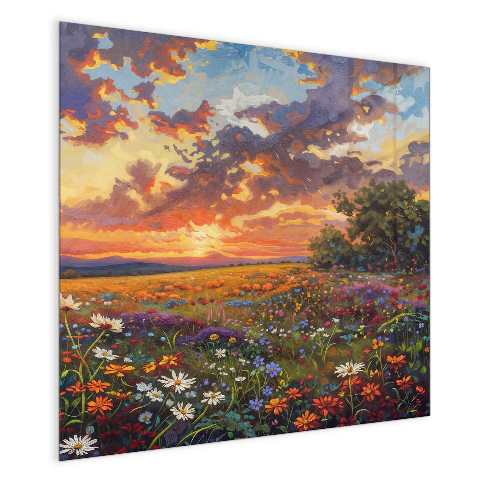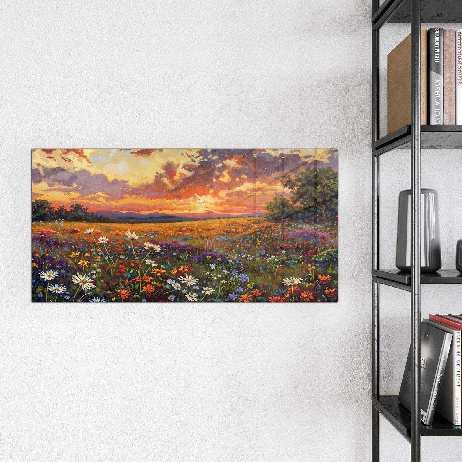 Stilvolle Glas-Magnettafel für Ihr Zuhause - Motiv Blumenwiese Sonnenuntergang