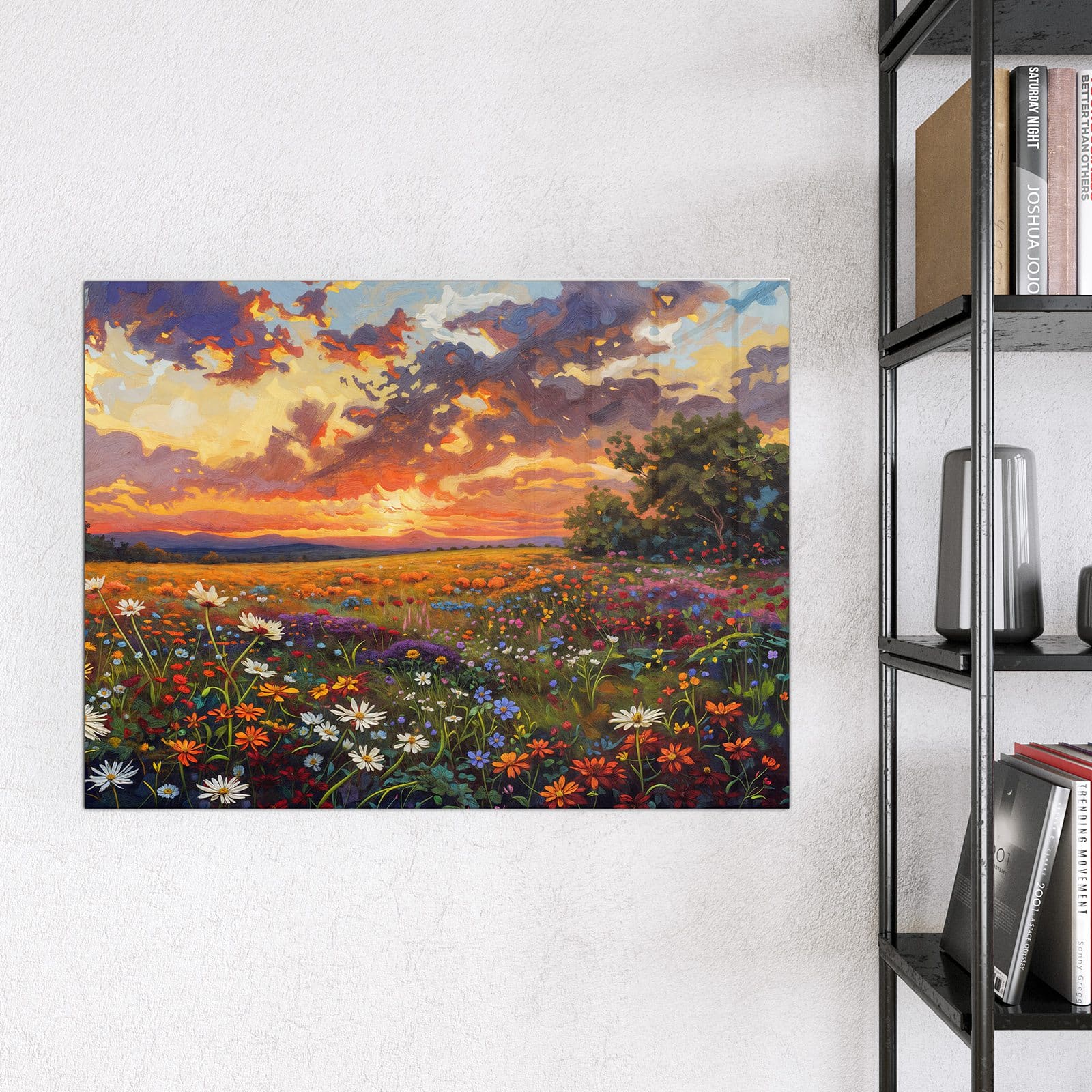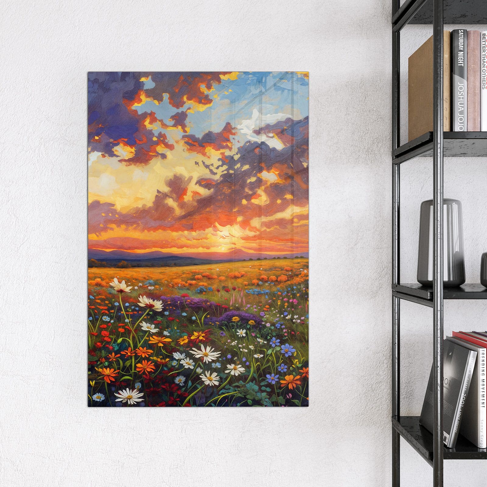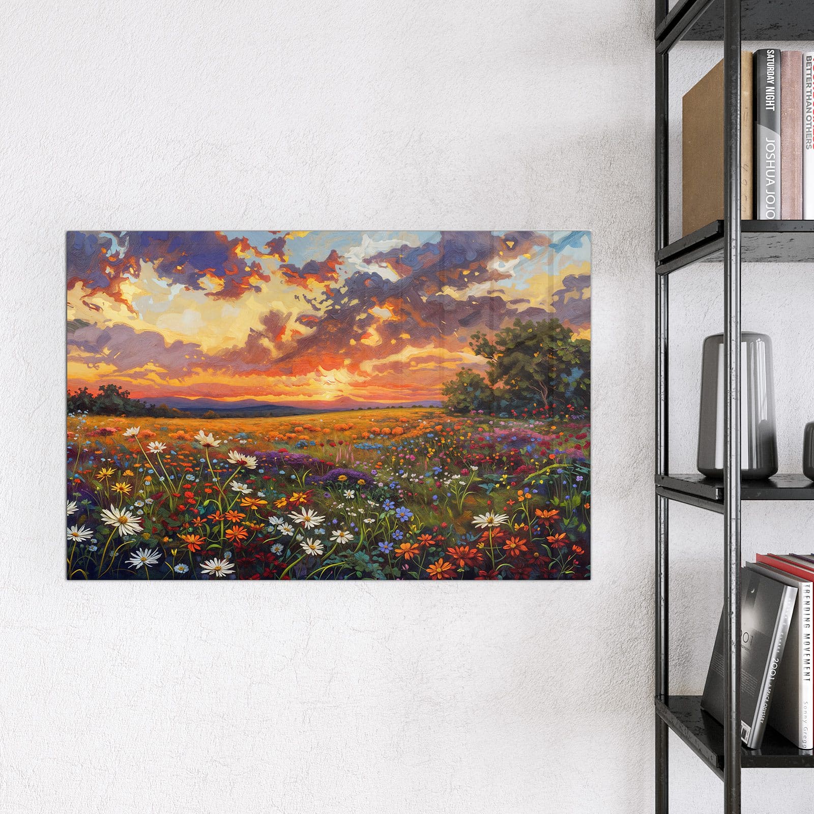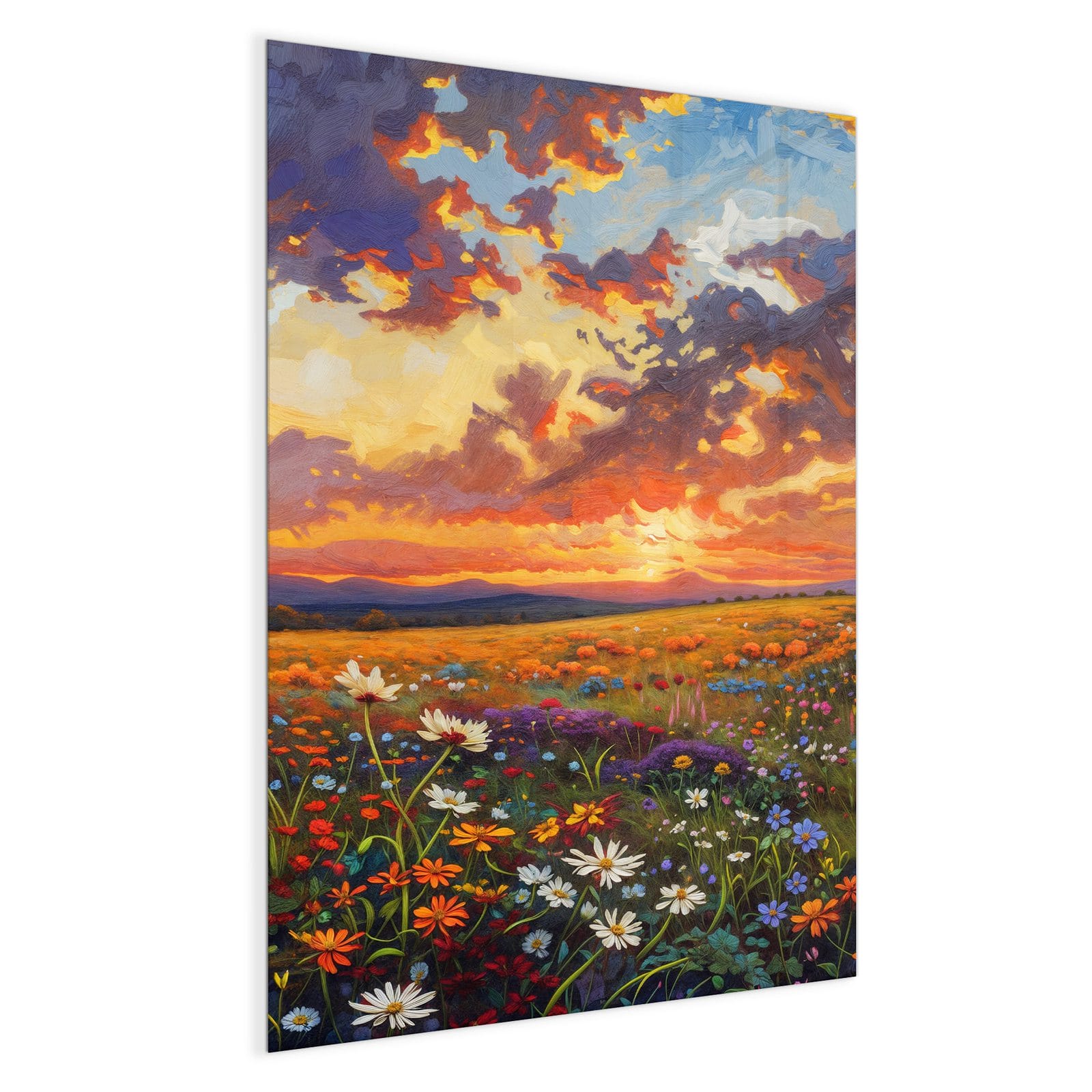Stilvolle Glas-Magnettafel für Ihr Zuhause - Motiv Blumenwiese Sonnenuntergang