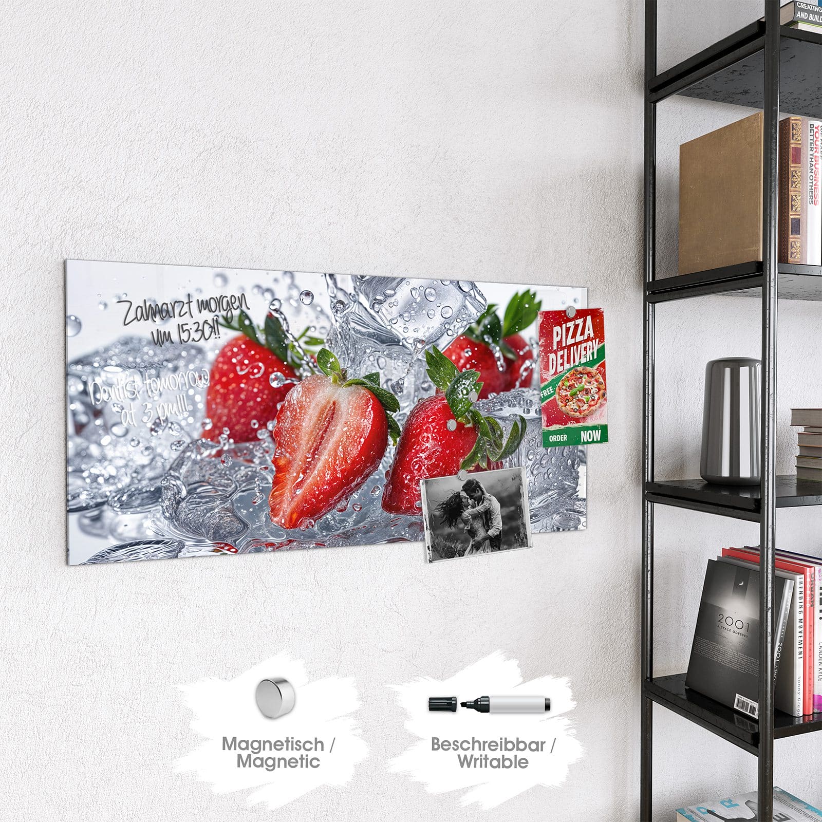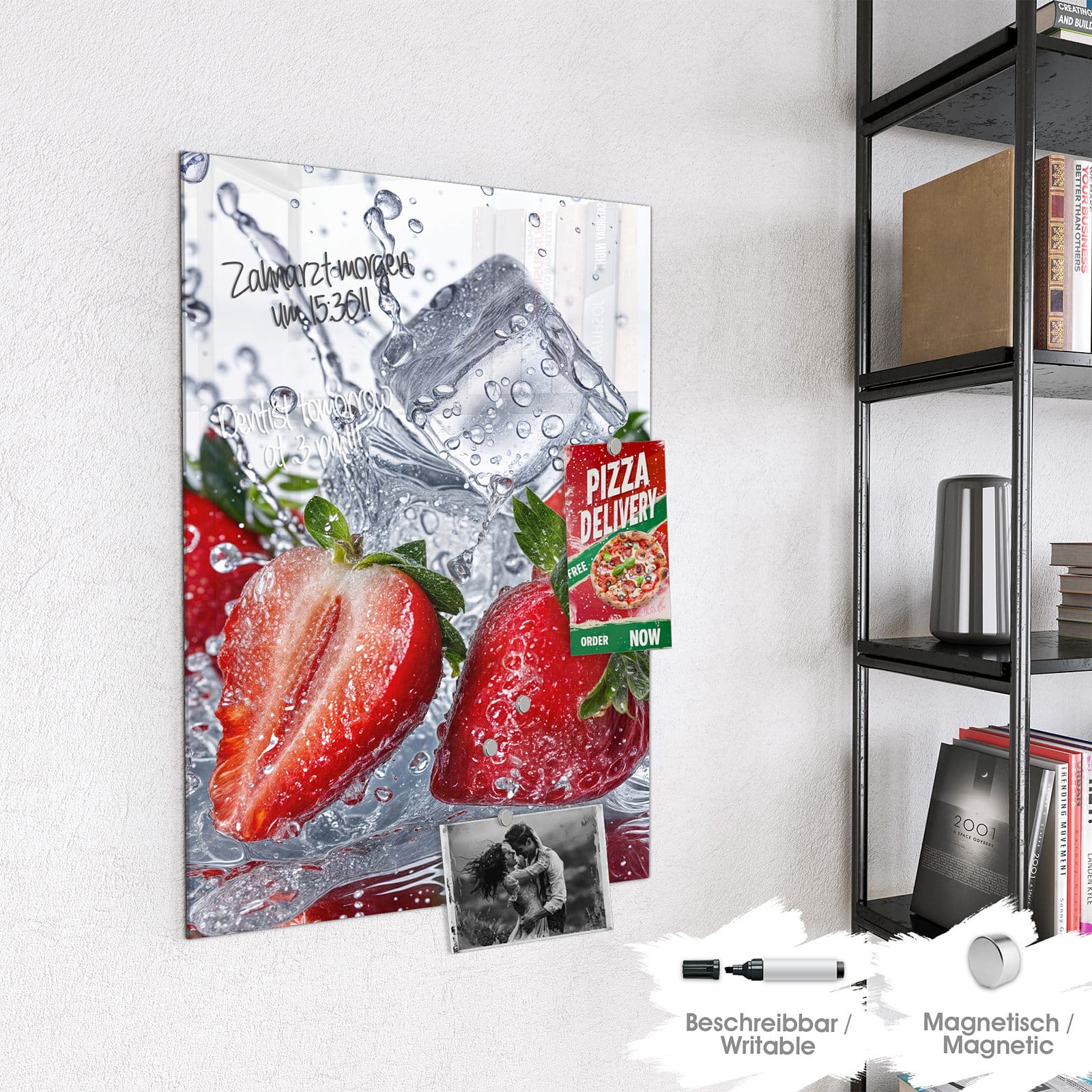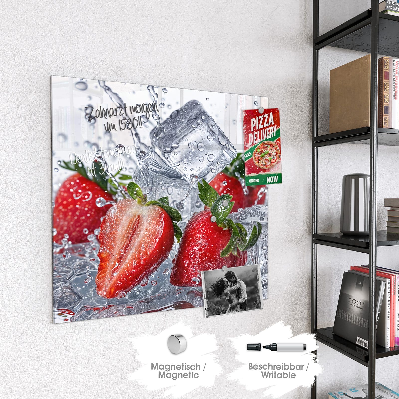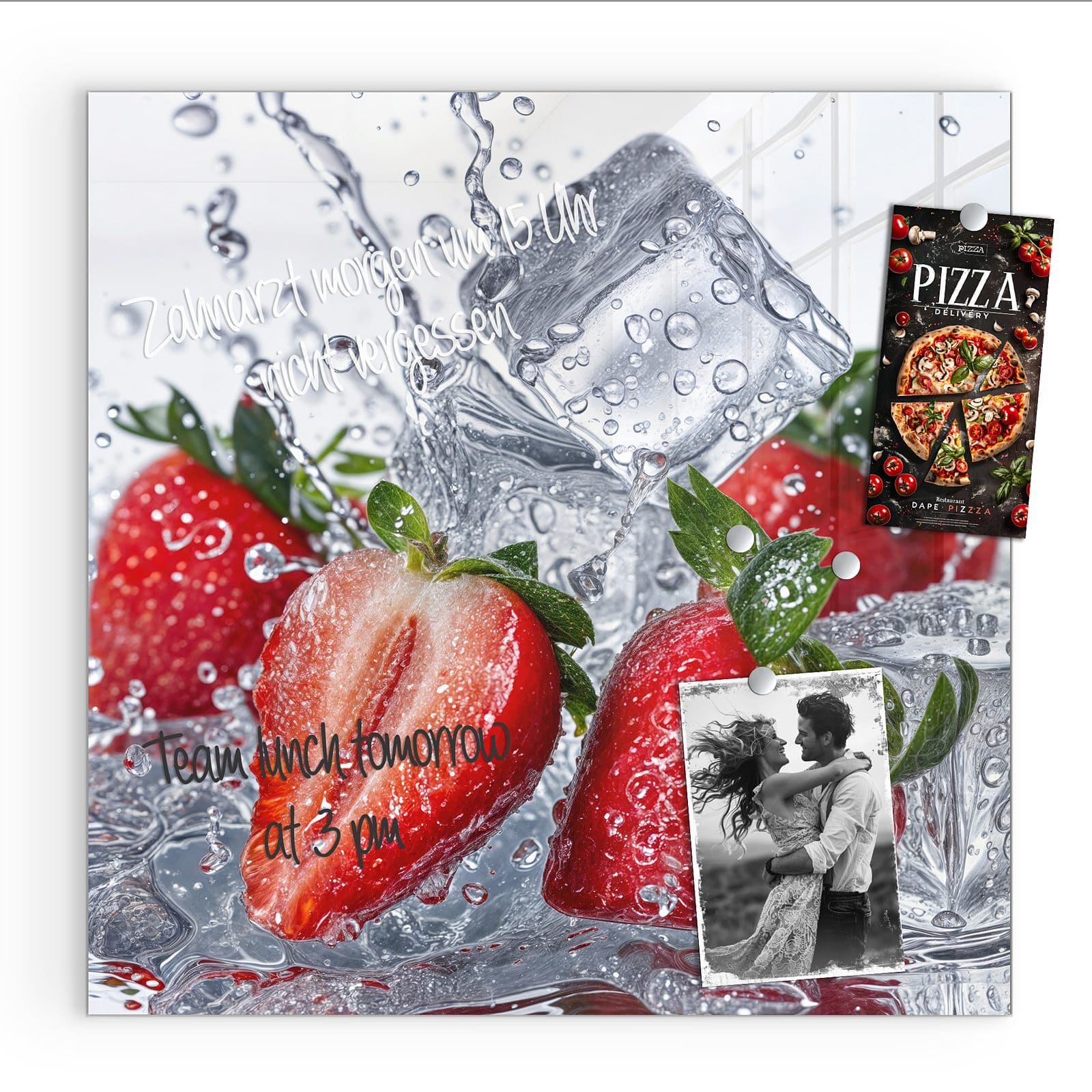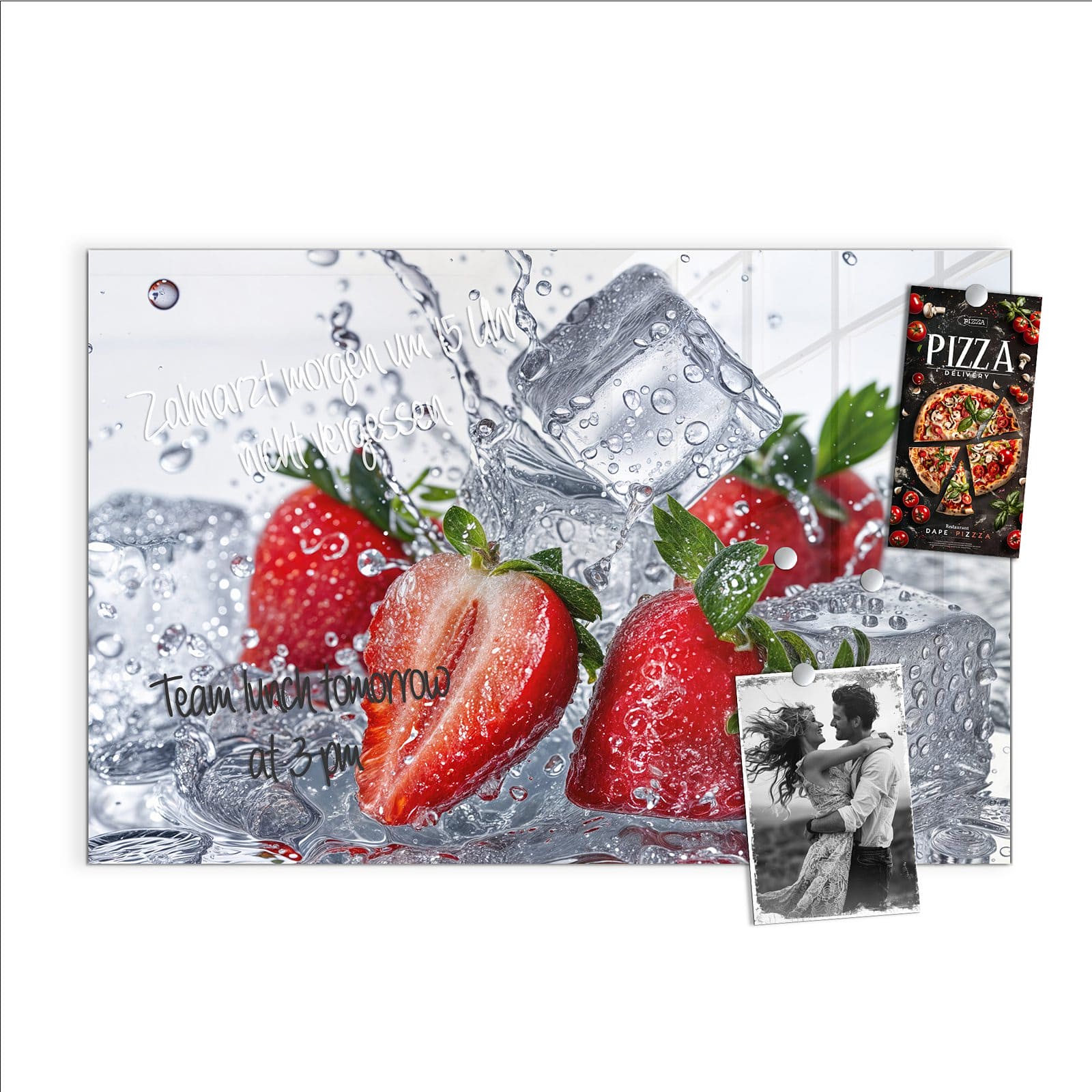 Stilvolle Glas-Magnettafel für Ihr Zuhause - Motiv Erdbeeren im Wasser
