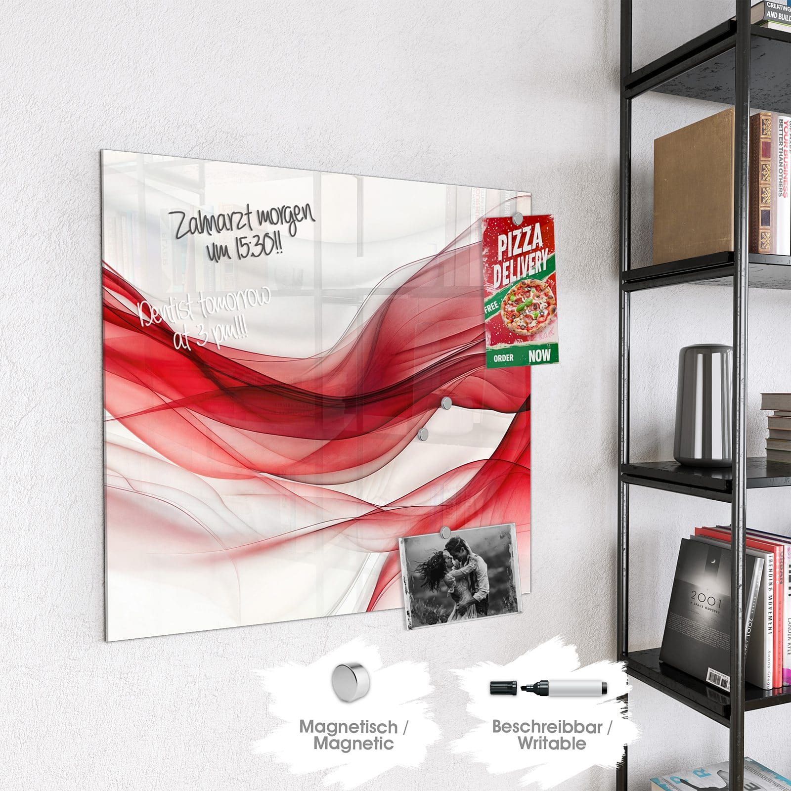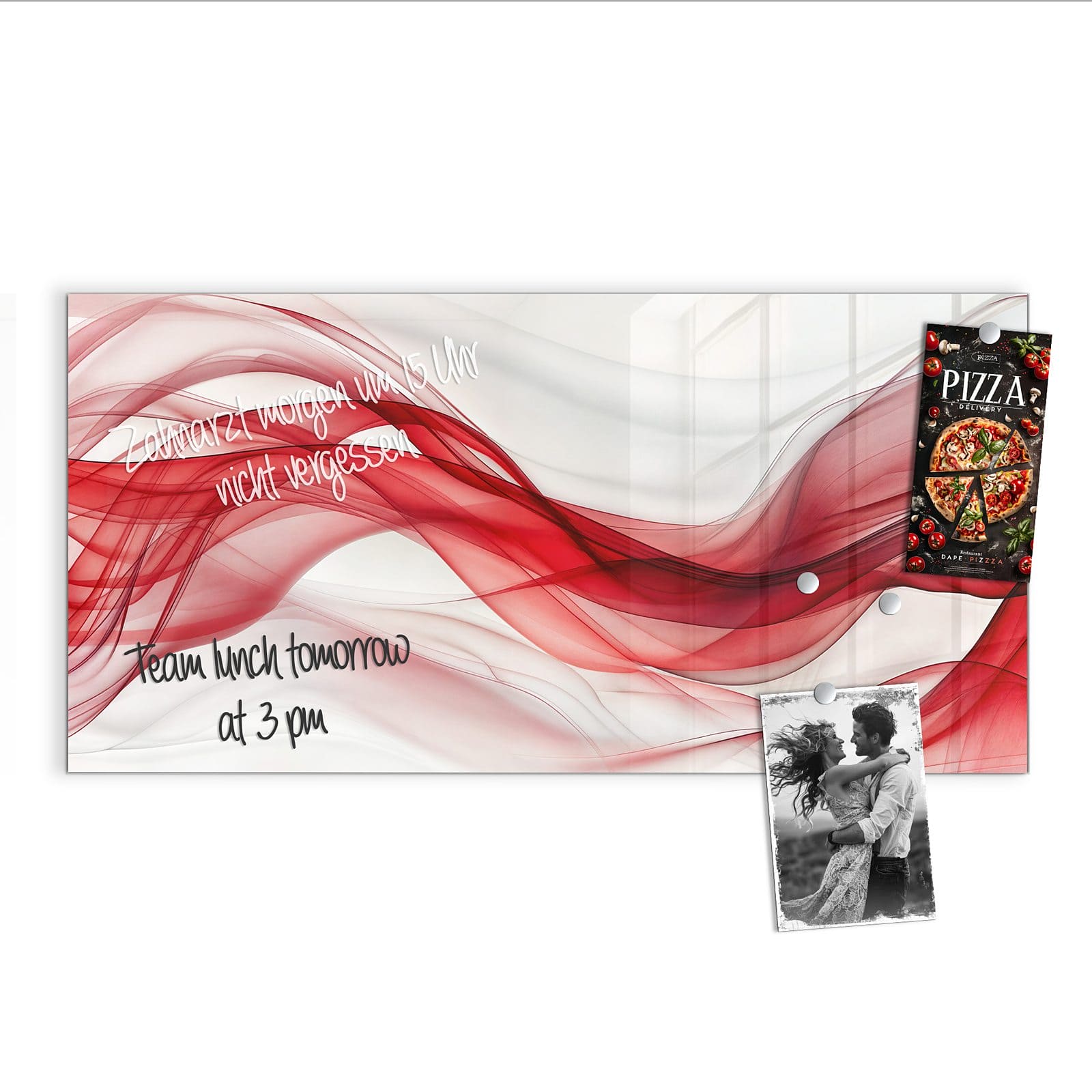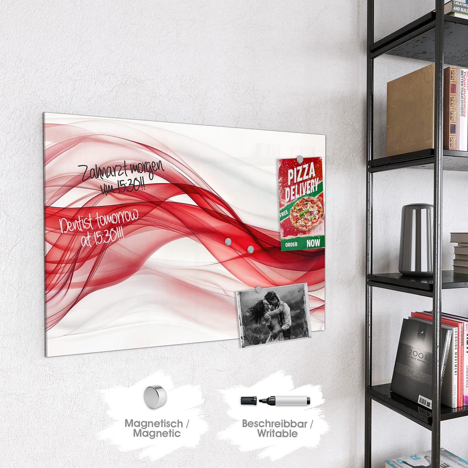 Hinweis: An dieser Glas-Magnettafel haften ausschließlich starke Magnete wie die mitgelieferten Neodym-Magnete. Gewöhnliche Kühlschrankmagnete sind nicht ausreichend stark.