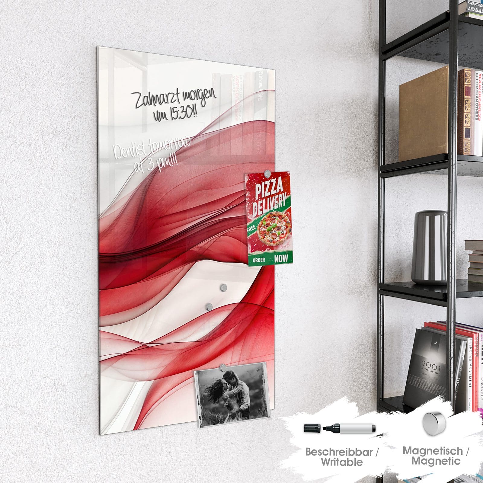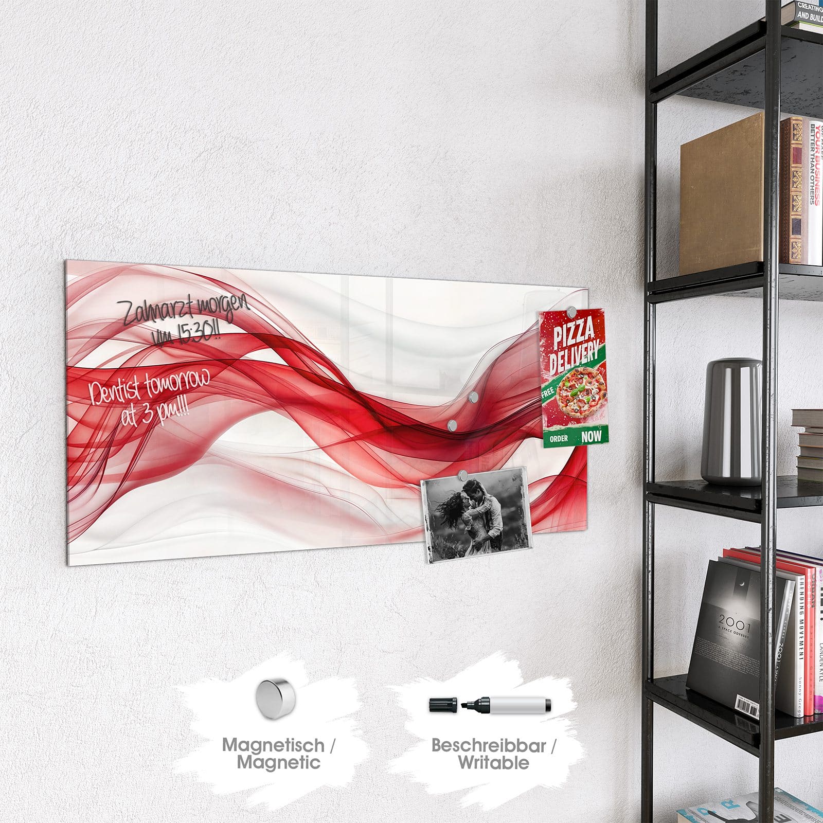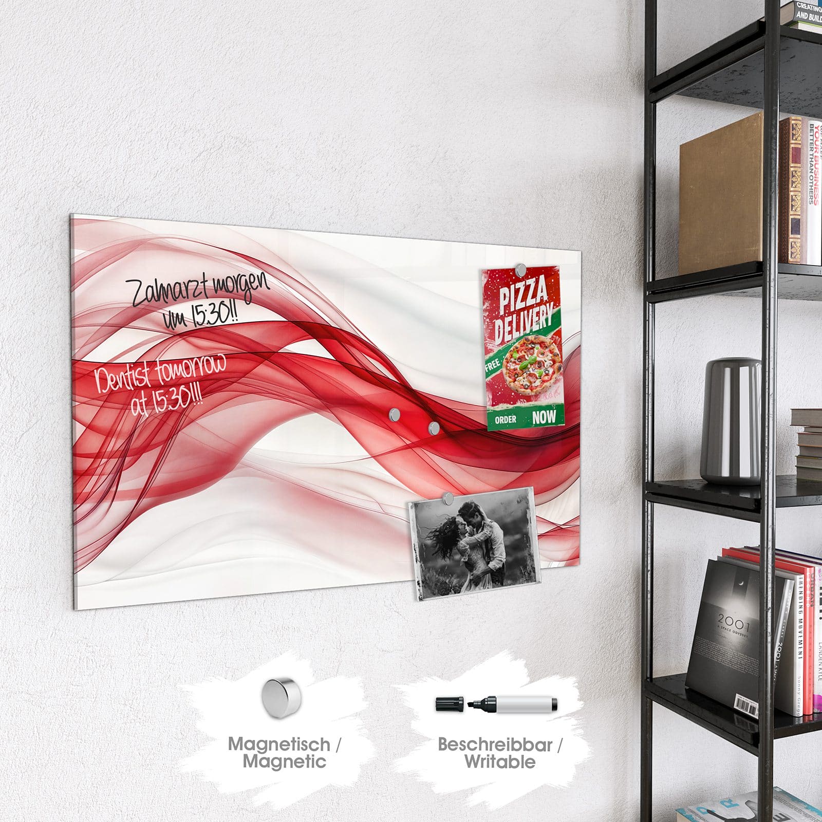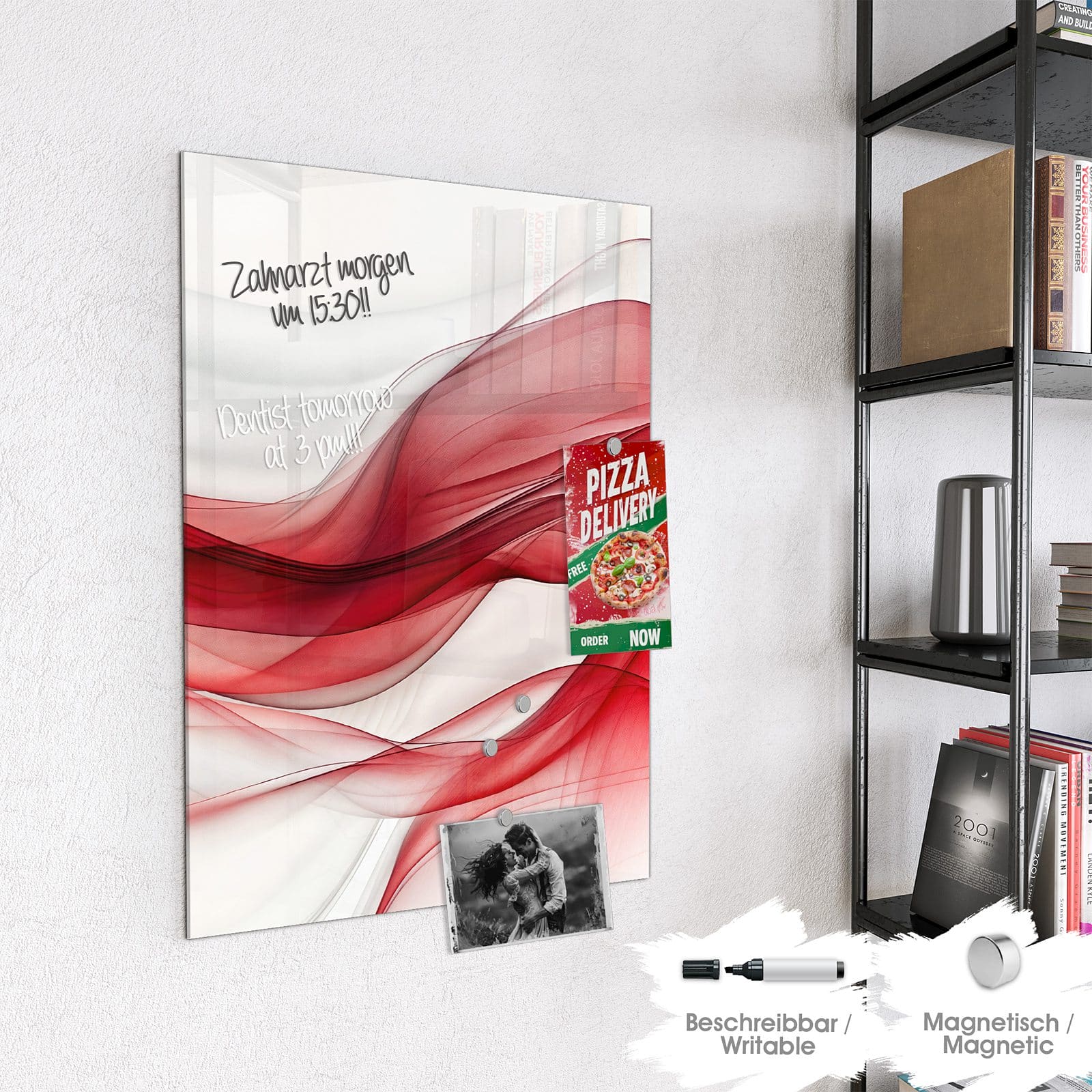 Hinweis: An dieser Glas-Magnettafel haften ausschließlich starke Magnete wie die mitgelieferten Neodym-Magnete. Gewöhnliche Kühlschrankmagnete sind nicht ausreichend stark.