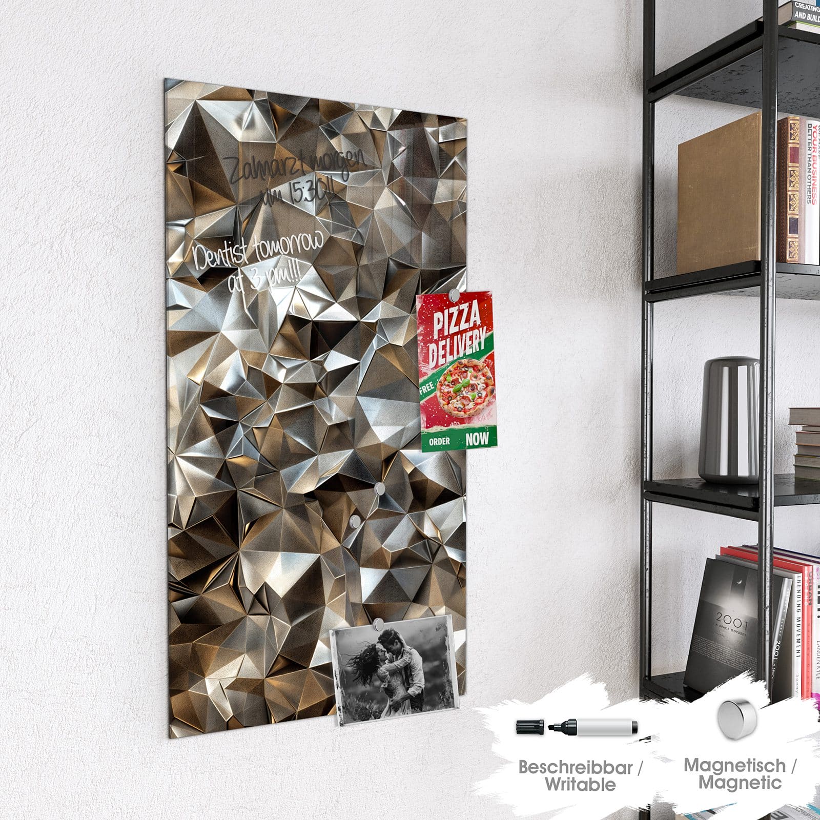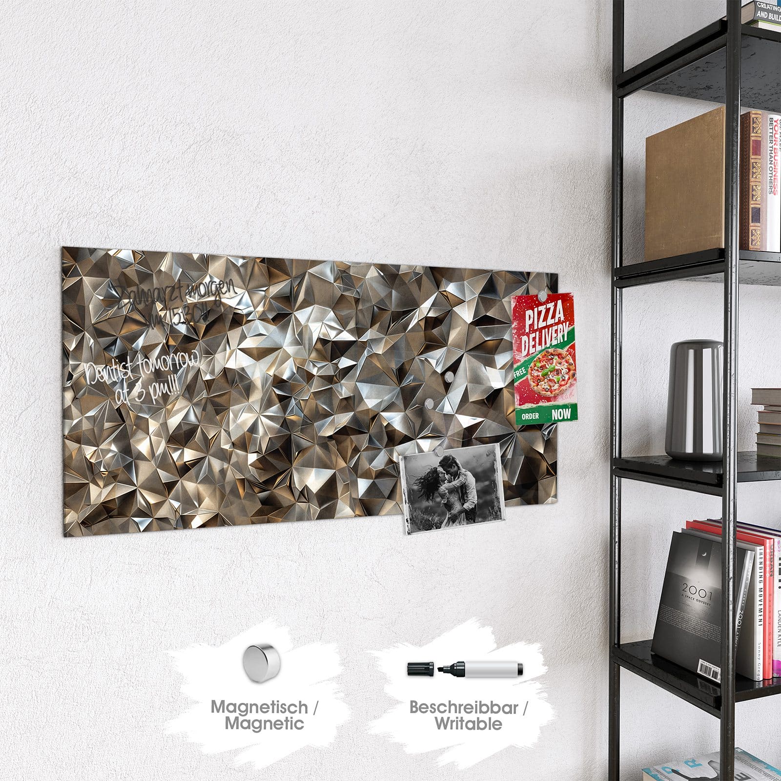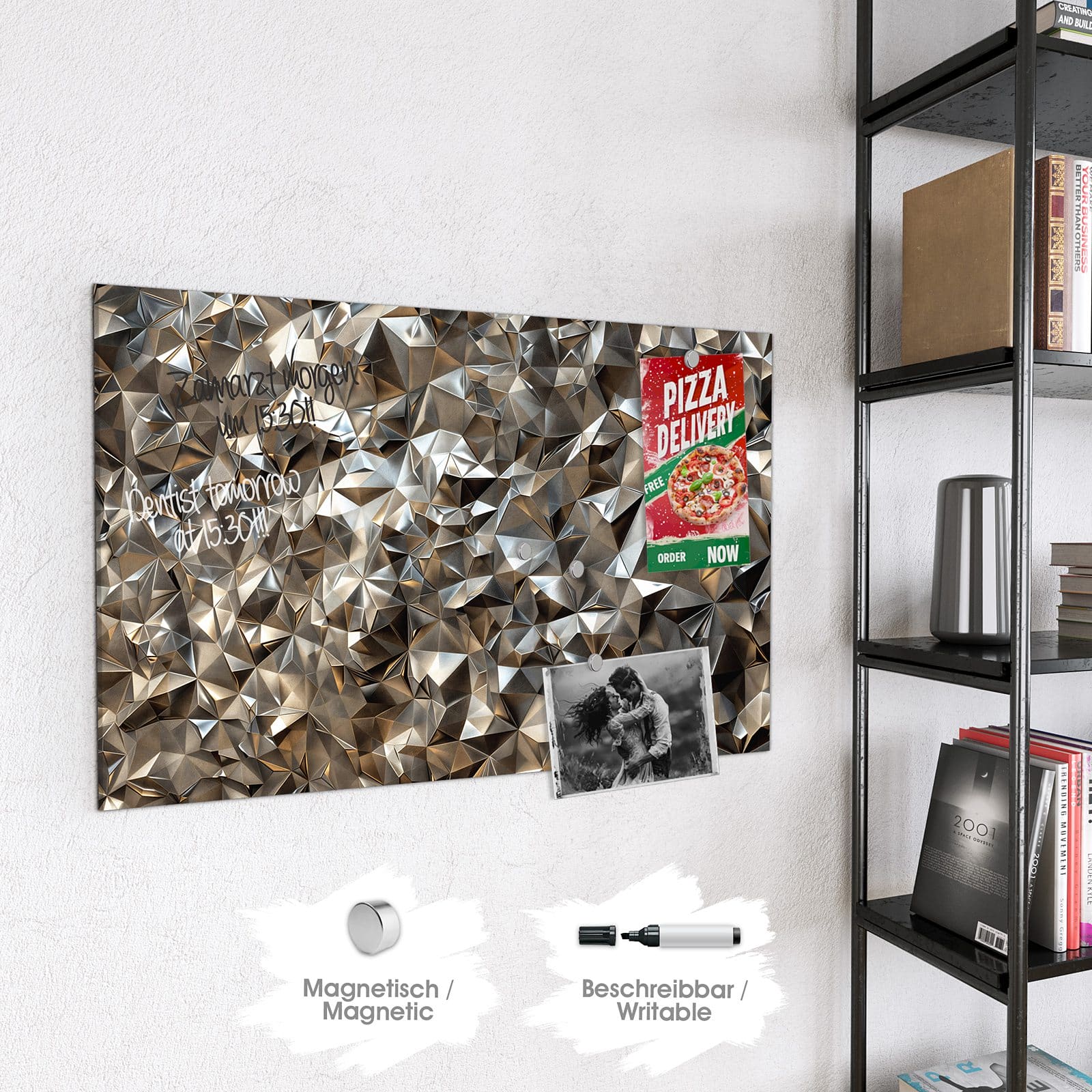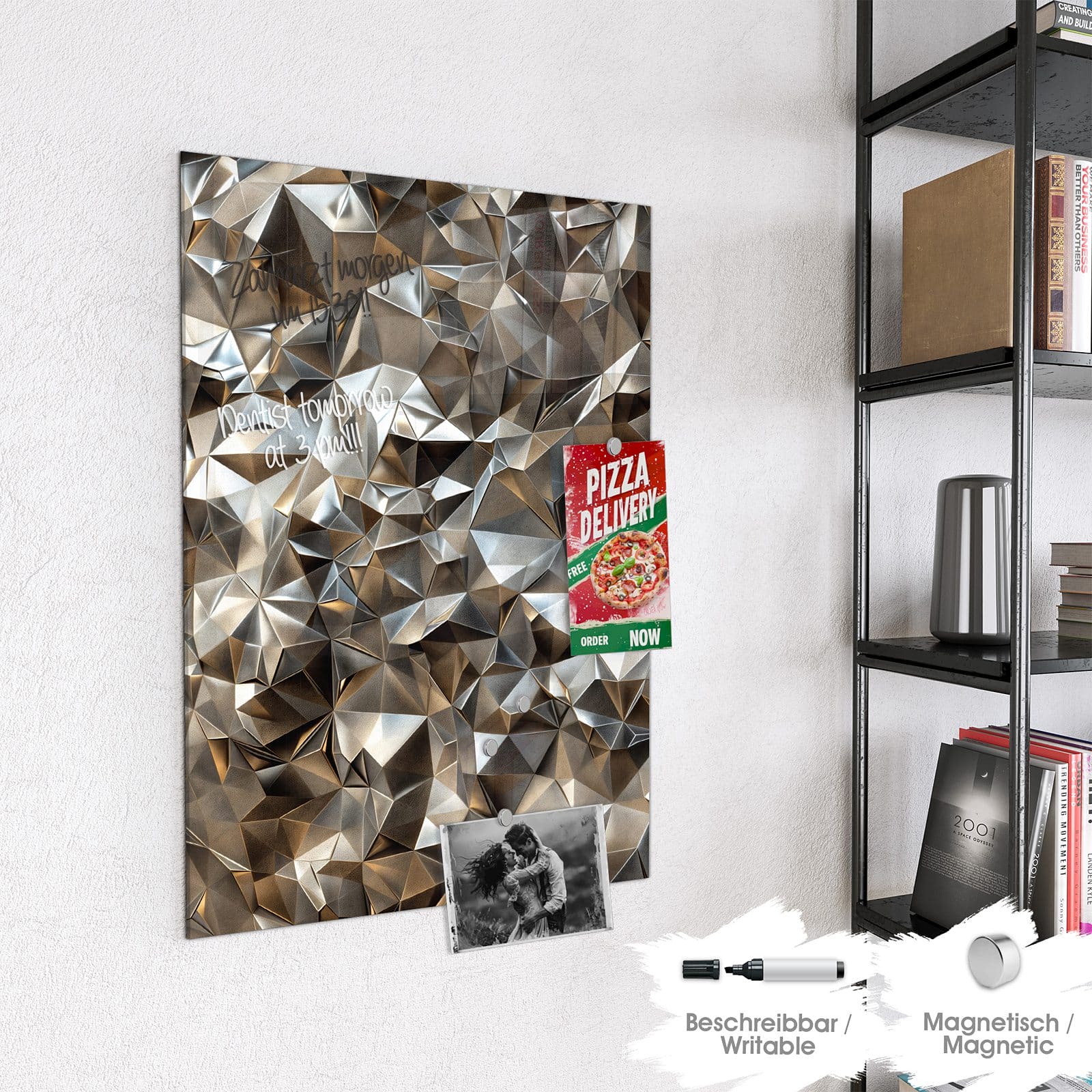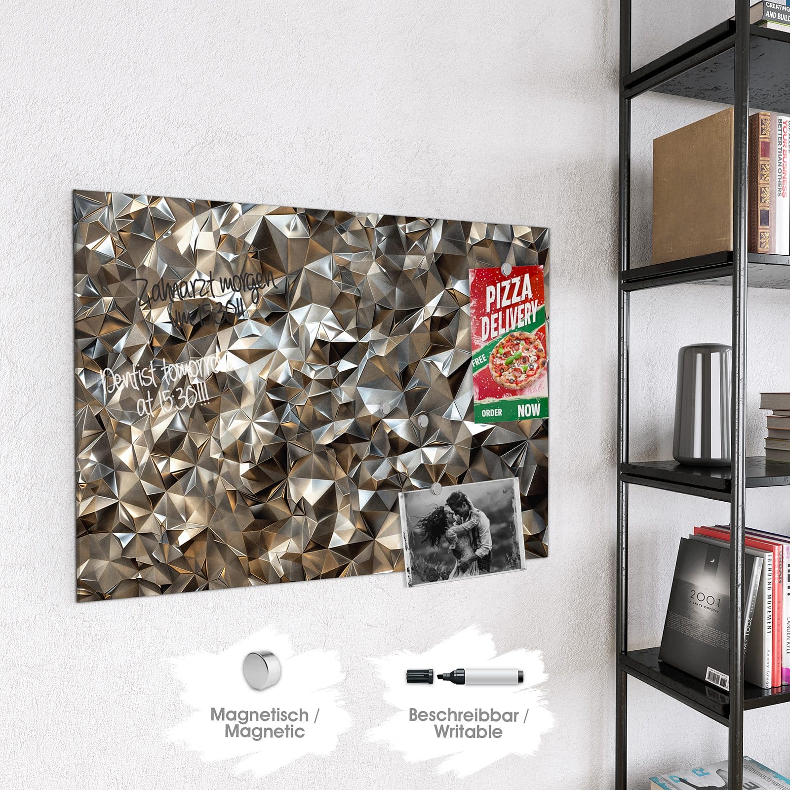Hinweis: An dieser Glas-Magnettafel haften ausschließlich starke Magnete wie die mitgelieferten Neodym-Magnete. Gewöhnliche Kühlschrankmagnete sind nicht ausreichend stark.