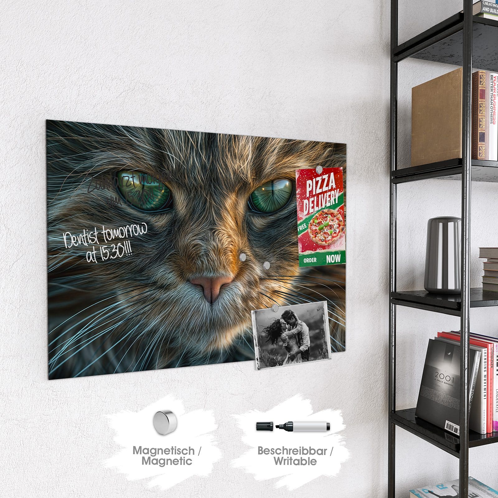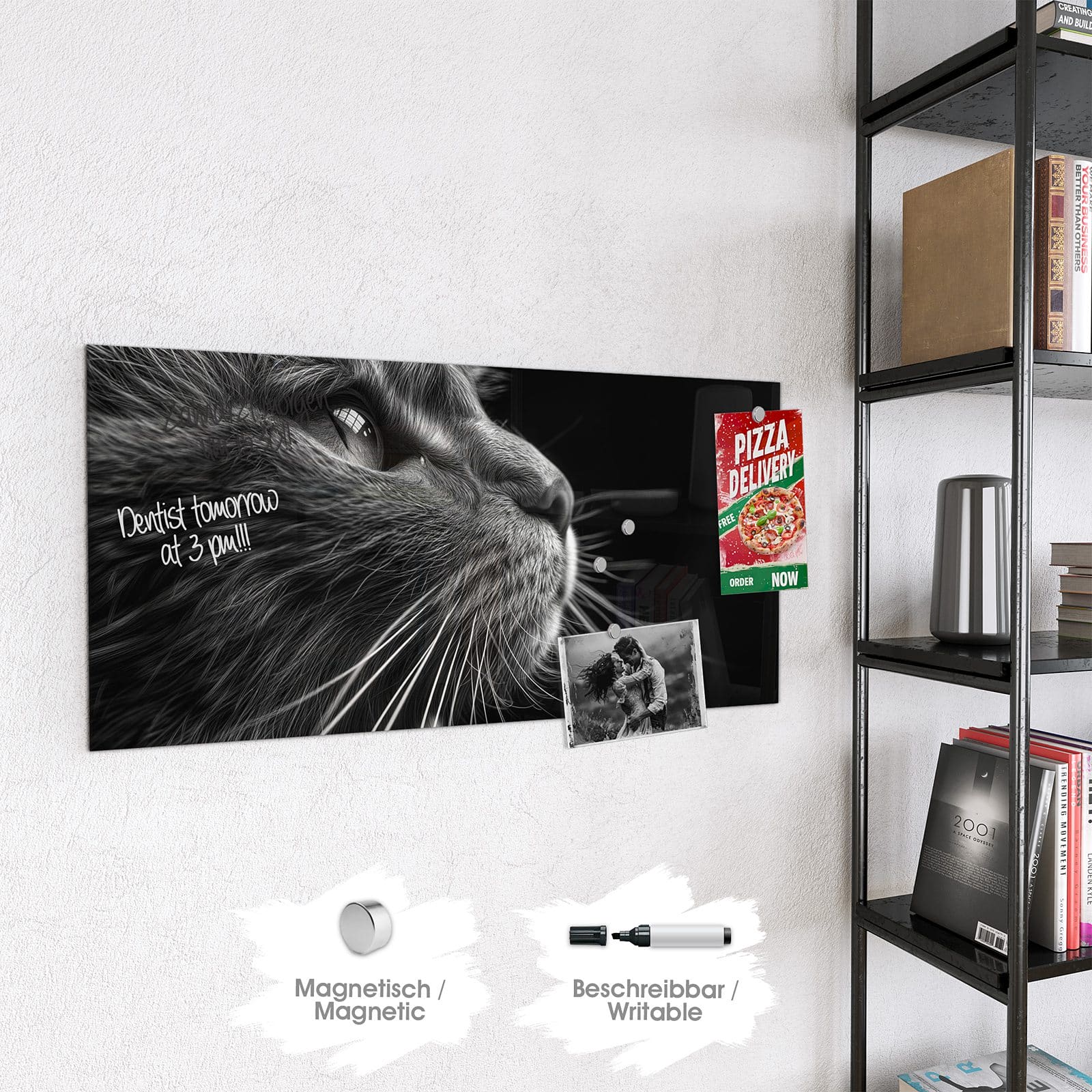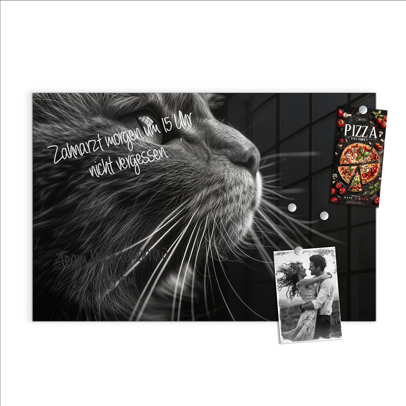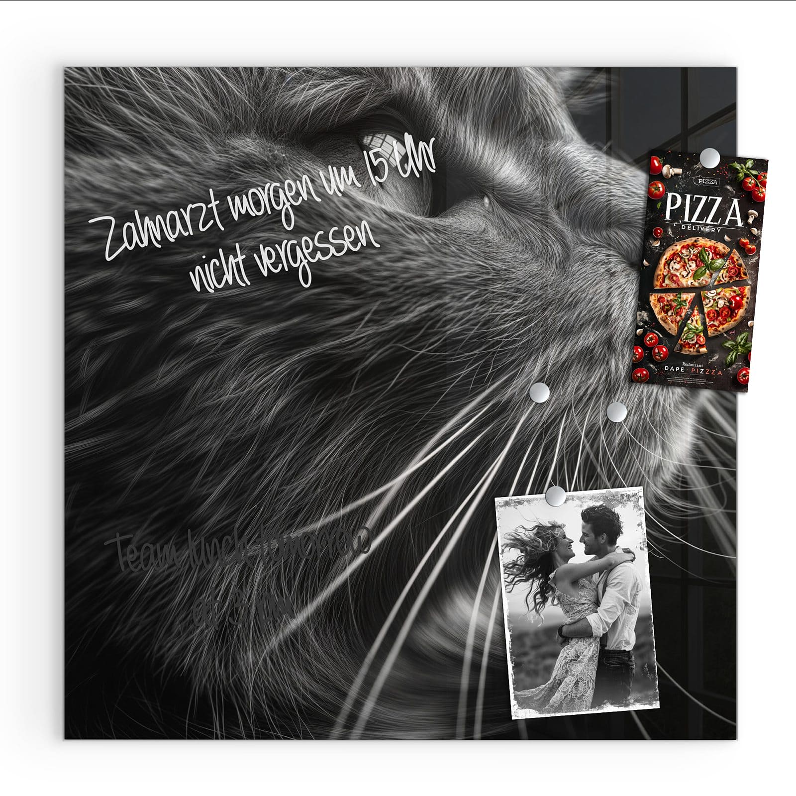 Hinweis: An dieser Glas-Magnettafel haften ausschließlich starke Magnete wie die mitgelieferten Neodym-Magnete. Gewöhnliche Kühlschrankmagnete sind nicht ausreichend stark.
