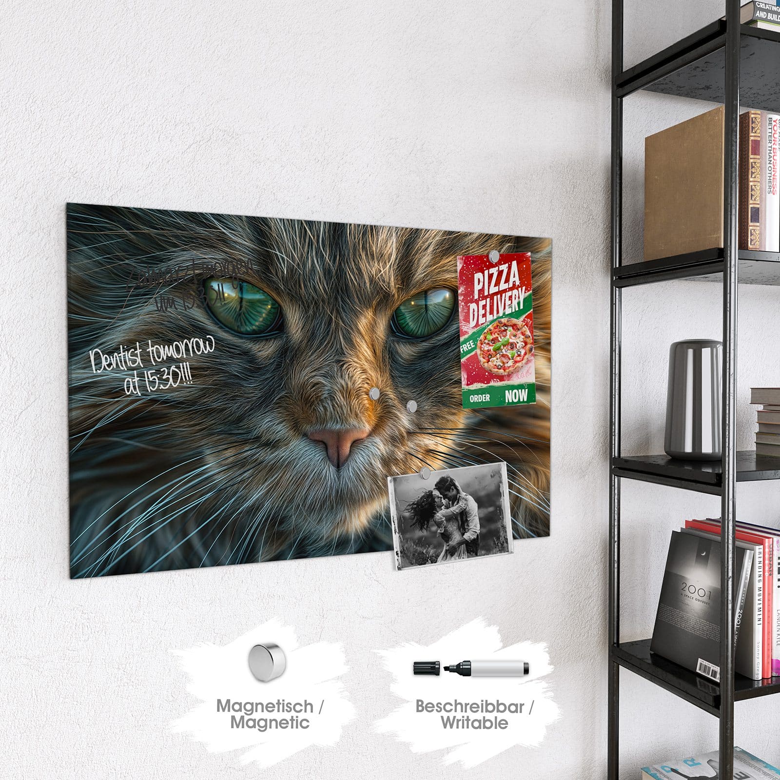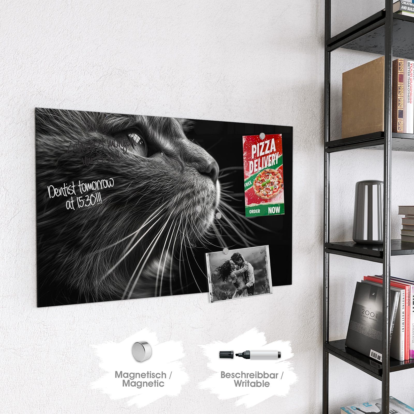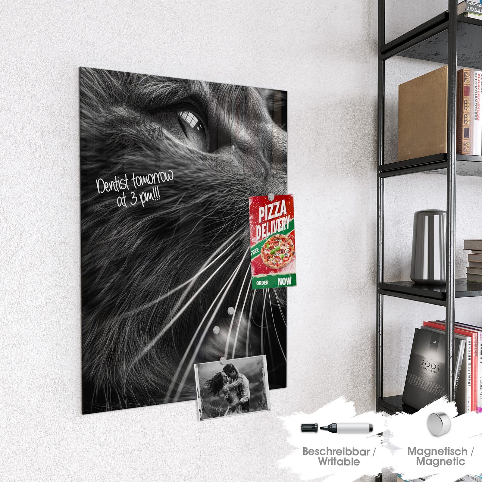 Hinweis: An dieser Glas-Magnettafel haften ausschließlich starke Magnete wie die mitgelieferten Neodym-Magnete. Gewöhnliche Kühlschrankmagnete sind nicht ausreichend stark.