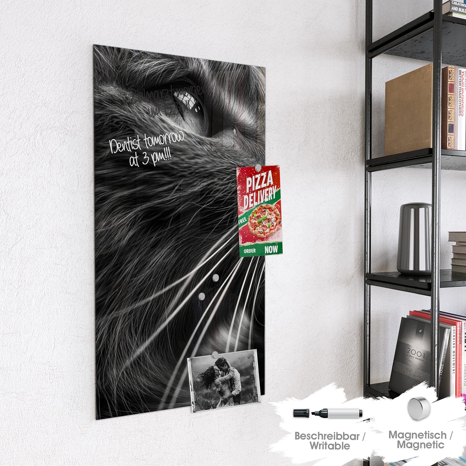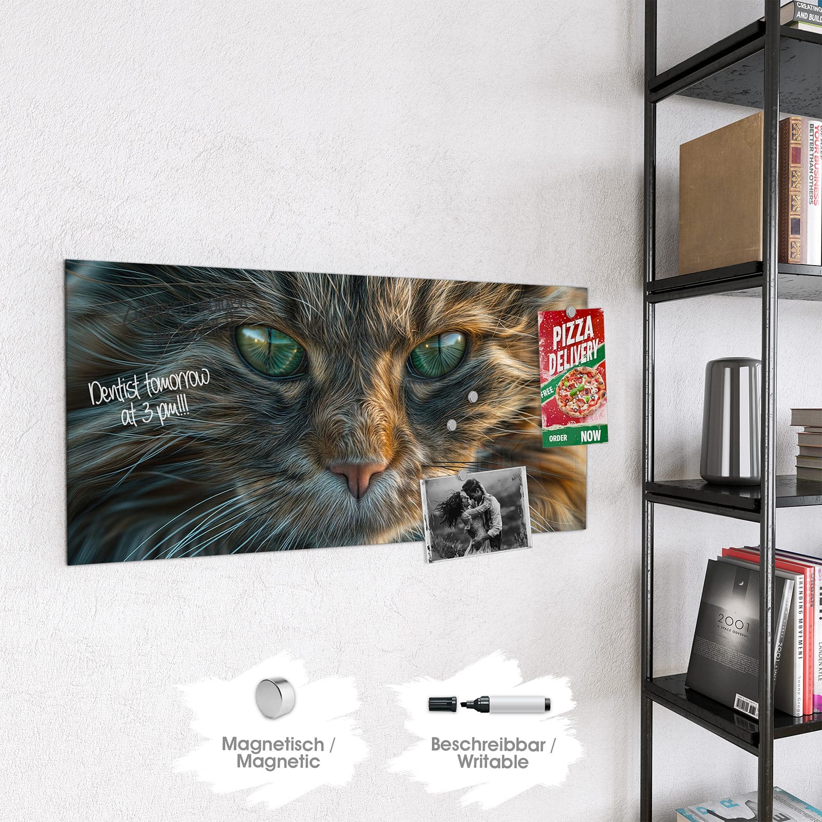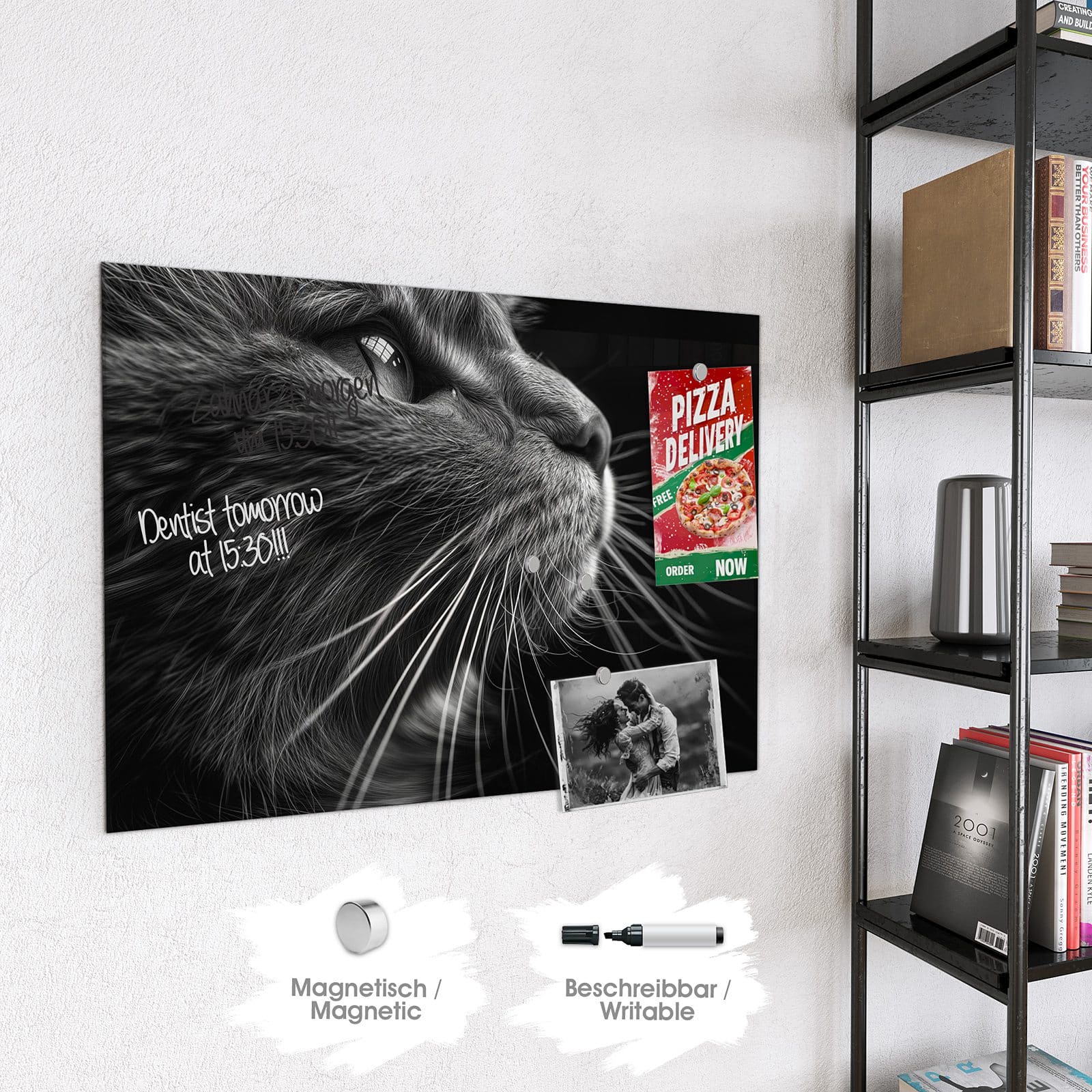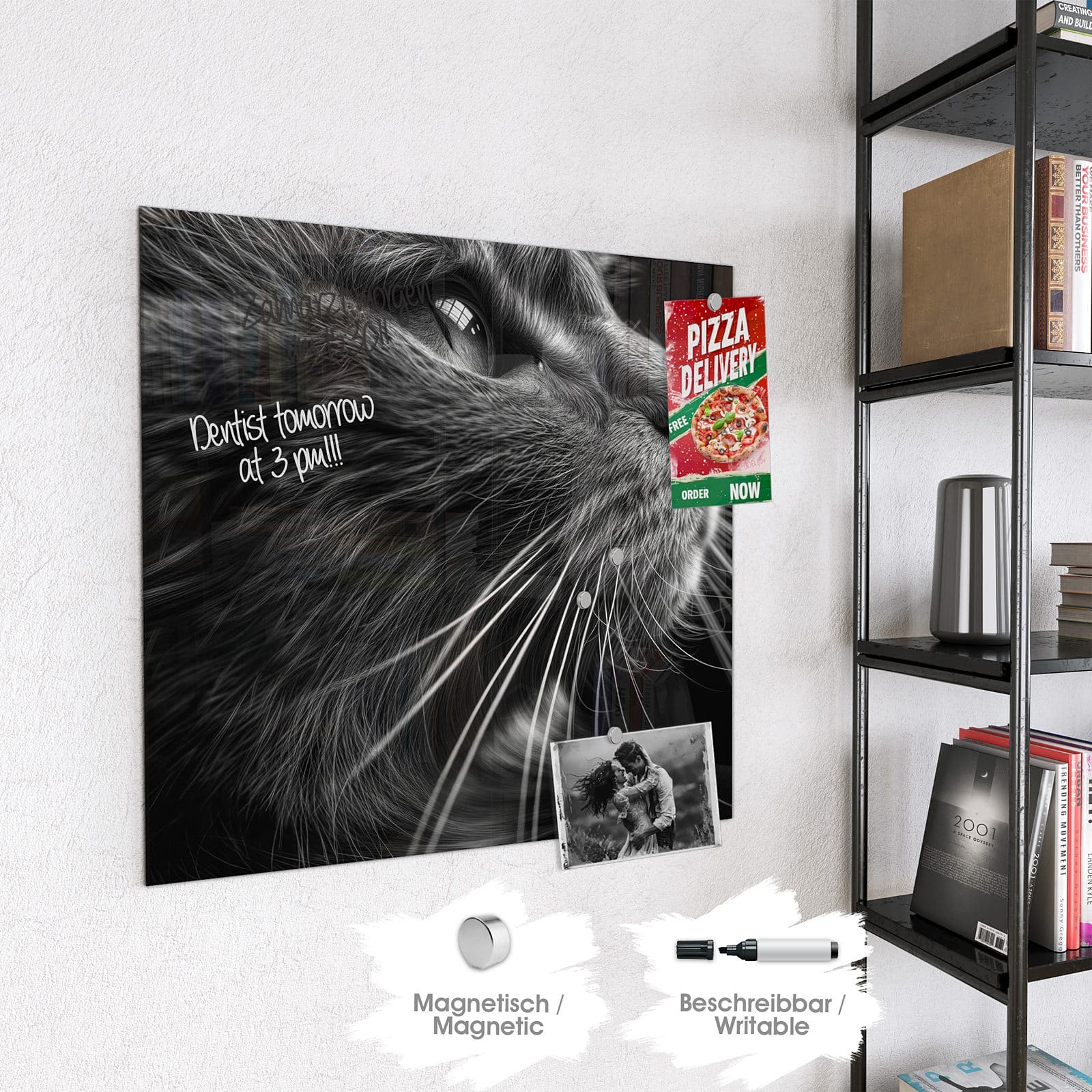 Hinweis: An dieser Glas-Magnettafel haften ausschließlich starke Magnete wie die mitgelieferten Neodym-Magnete. Gewöhnliche Kühlschrankmagnete sind nicht ausreichend stark.