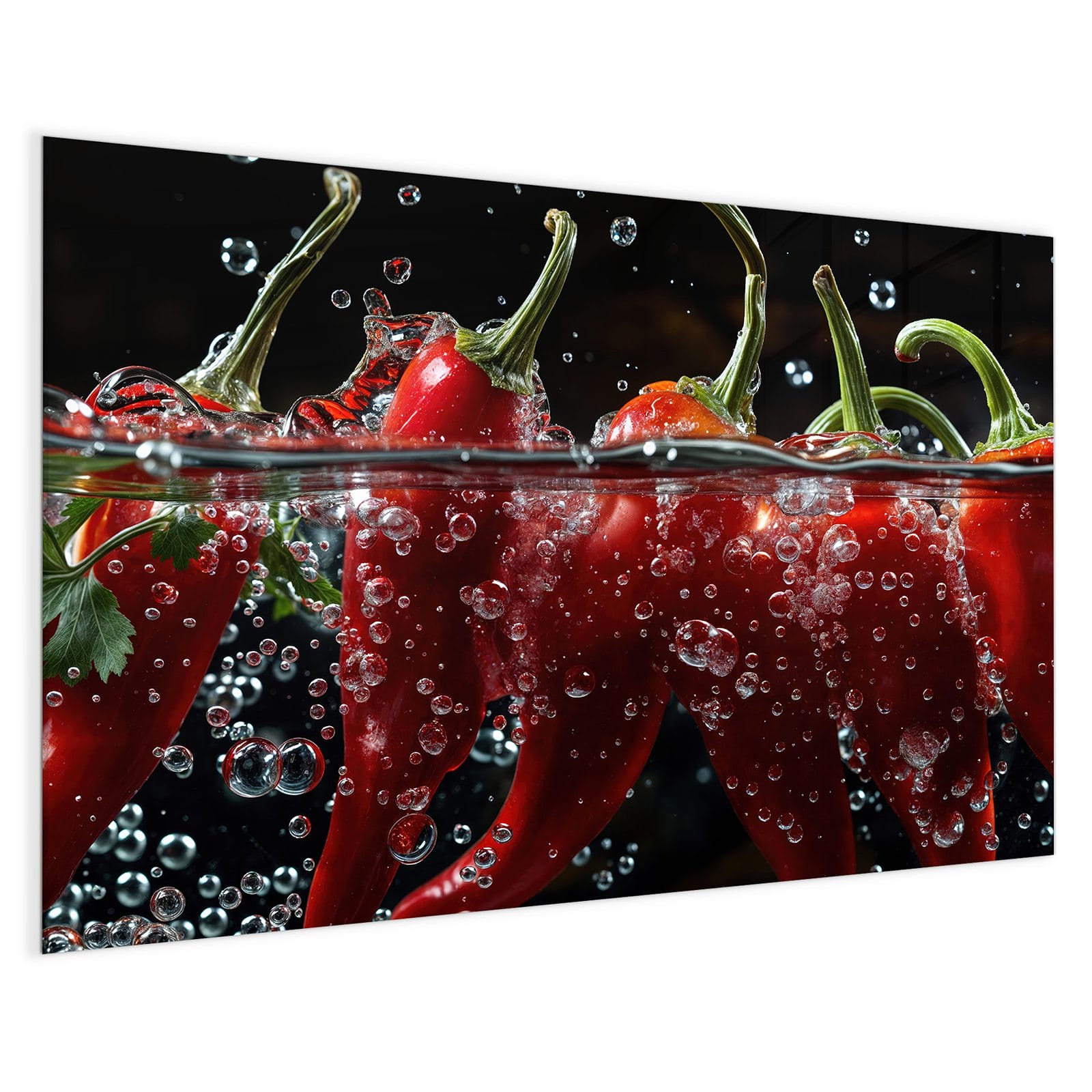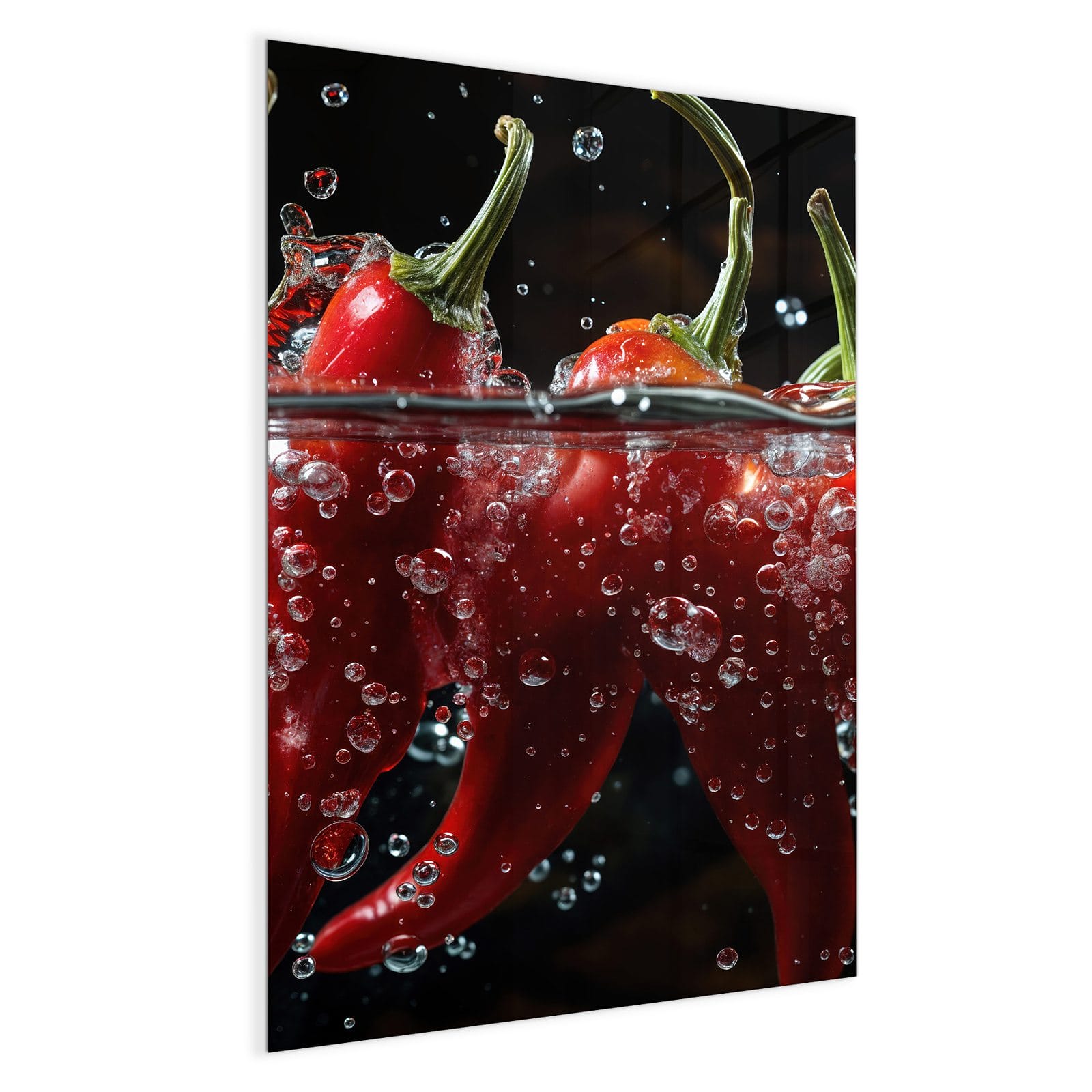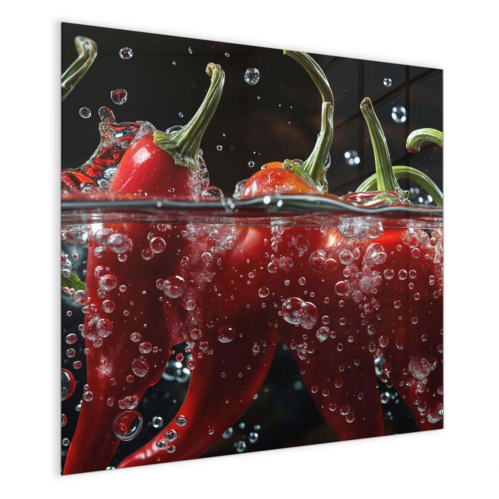 Mit einer Dicke von 4 mm besteht die Tafel aus gehärtetem Einscheibensicherheitsglas (ESG), das robust, kratzfest und UV-beständig ist. Das Motiv Paprika im Wasser wird in hoher Auflösung und mit präzisen Details auf das Glas gedruckt, was eine lebendige und dauerhafte Farbbrillanz garantiert. Die polierten Kanten sorgen für ein hochwertiges Erscheinungsbild und minimieren das Verletzungsrisiko.
