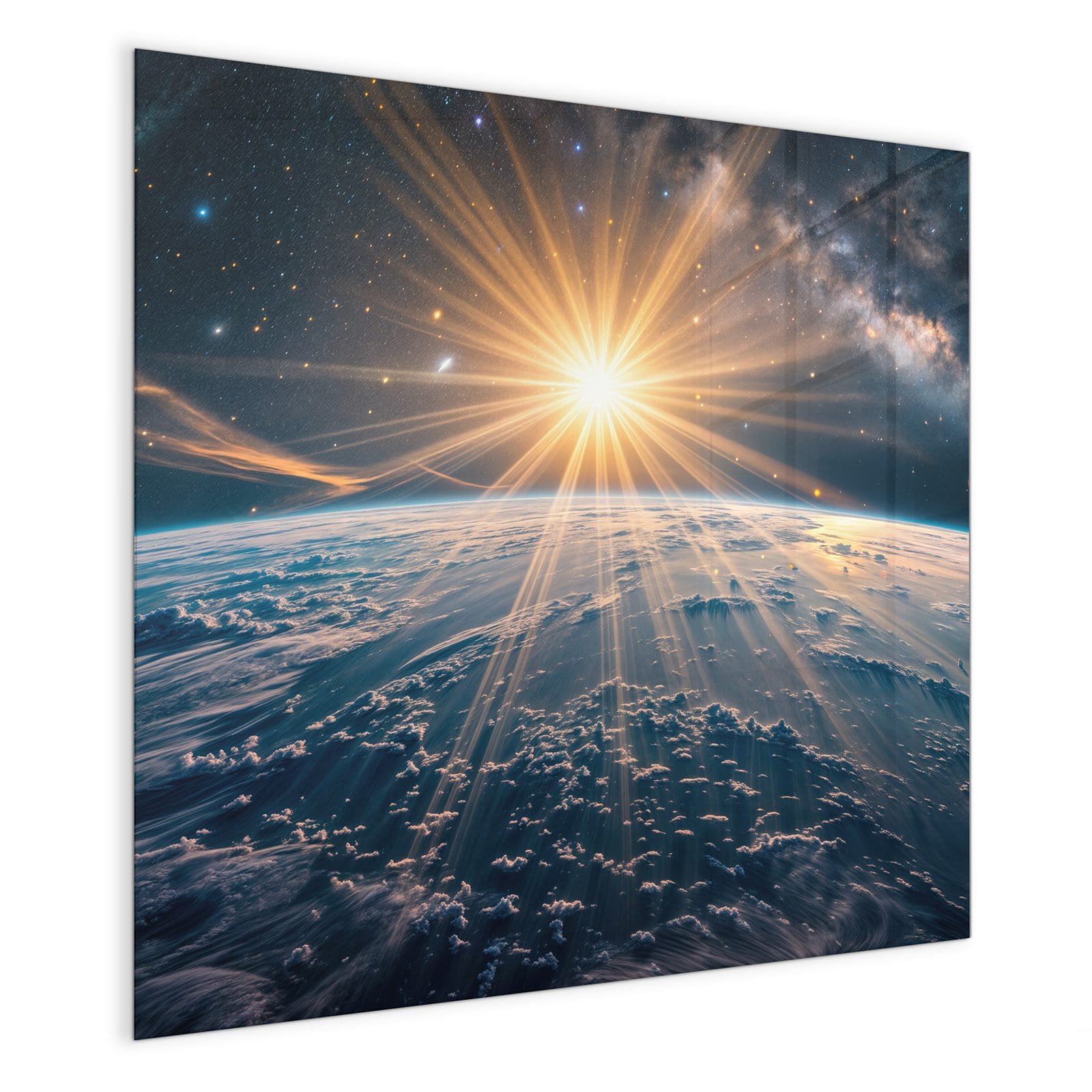Mit einer Dicke von 4 mm besteht die Tafel aus gehärtetem Einscheibensicherheitsglas (ESG), das robust, kratzfest und UV-beständig ist. Das Motiv Sonnenaufgang über Erde wird in hoher Auflösung und mit präzisen Details auf das Glas gedruckt, was eine lebendige und dauerhafte Farbbrillanz garantiert. Die polierten Kanten sorgen für ein hochwertiges Erscheinungsbild und minimieren das Verletzungsrisiko.