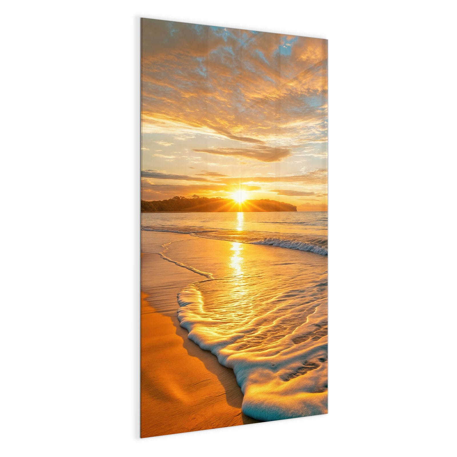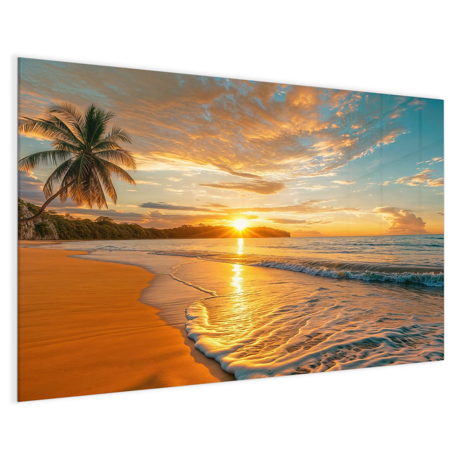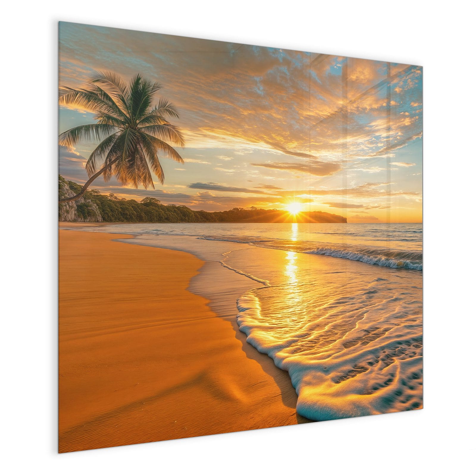 Mit einer Dicke von 4 mm besteht die Tafel aus gehärtetem Einscheibensicherheitsglas (ESG), das robust, kratzfest und UV-beständig ist. Das Motiv Sonnenuntergang am Strand wird in hoher Auflösung und mit präzisen Details auf das Glas gedruckt, was eine lebendige und dauerhafte Farbbrillanz garantiert. Die polierten Kanten sorgen für ein hochwertiges Erscheinungsbild und minimieren das Verletzungsrisiko.