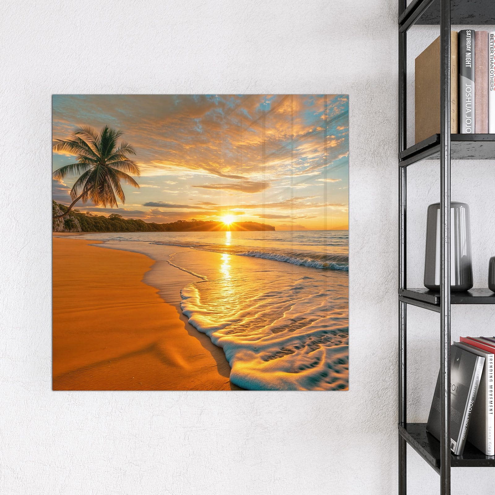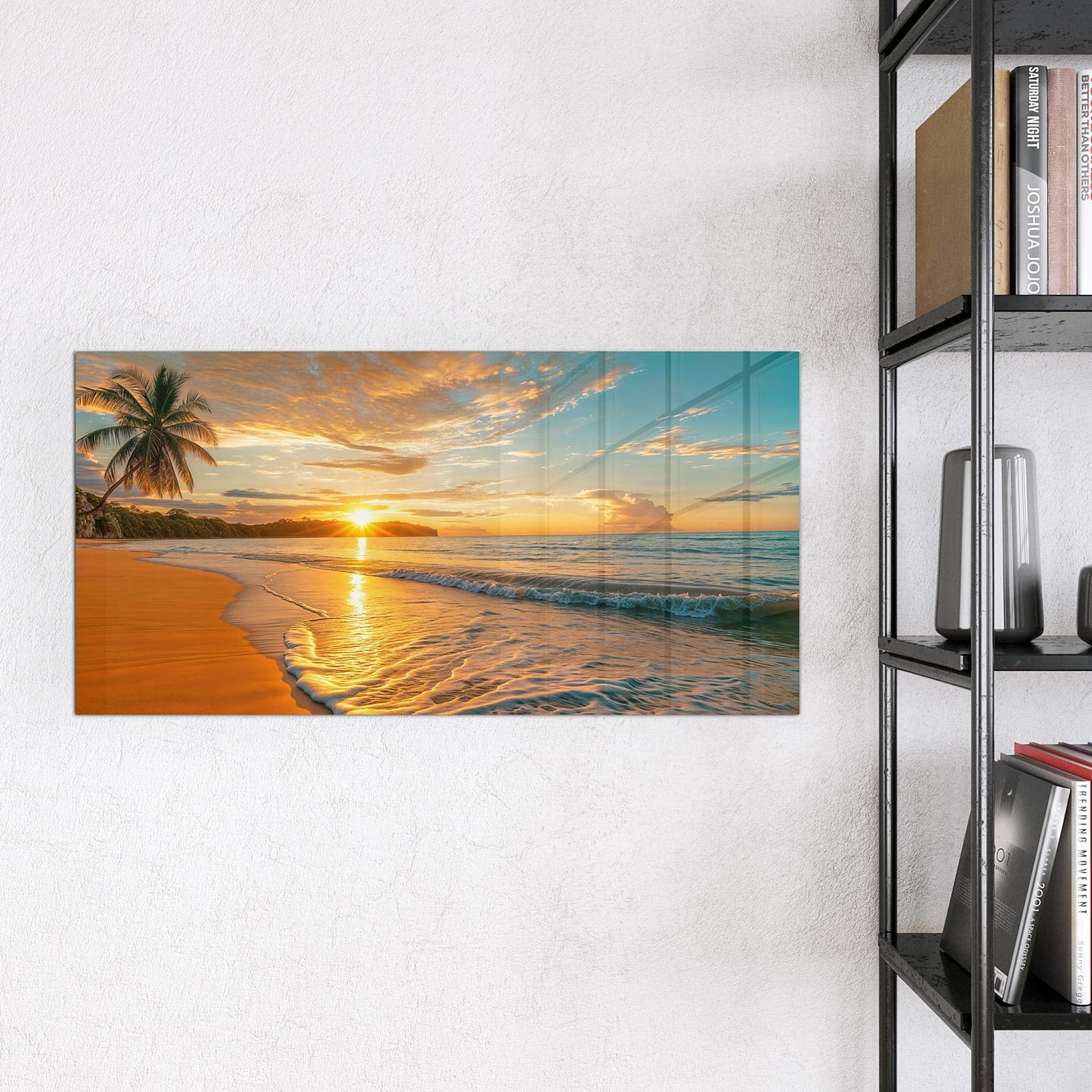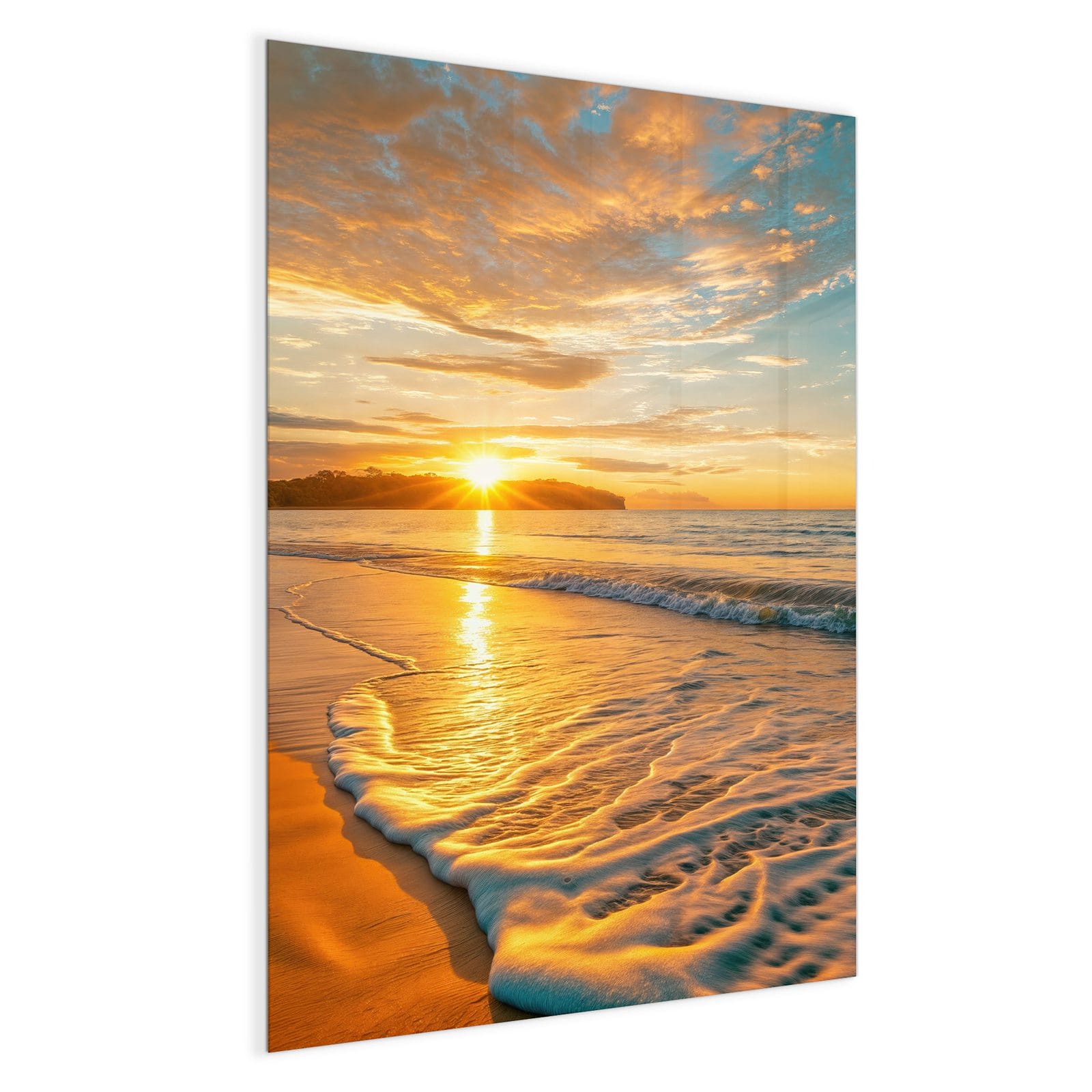Mit einer Dicke von 4 mm besteht die Tafel aus gehärtetem Einscheibensicherheitsglas (ESG), das robust, kratzfest und UV-beständig ist. Das Motiv Sonnenuntergang am Strand wird in hoher Auflösung und mit präzisen Details auf das Glas gedruckt, was eine lebendige und dauerhafte Farbbrillanz garantiert. Die polierten Kanten sorgen für ein hochwertiges Erscheinungsbild und minimieren das Verletzungsrisiko.