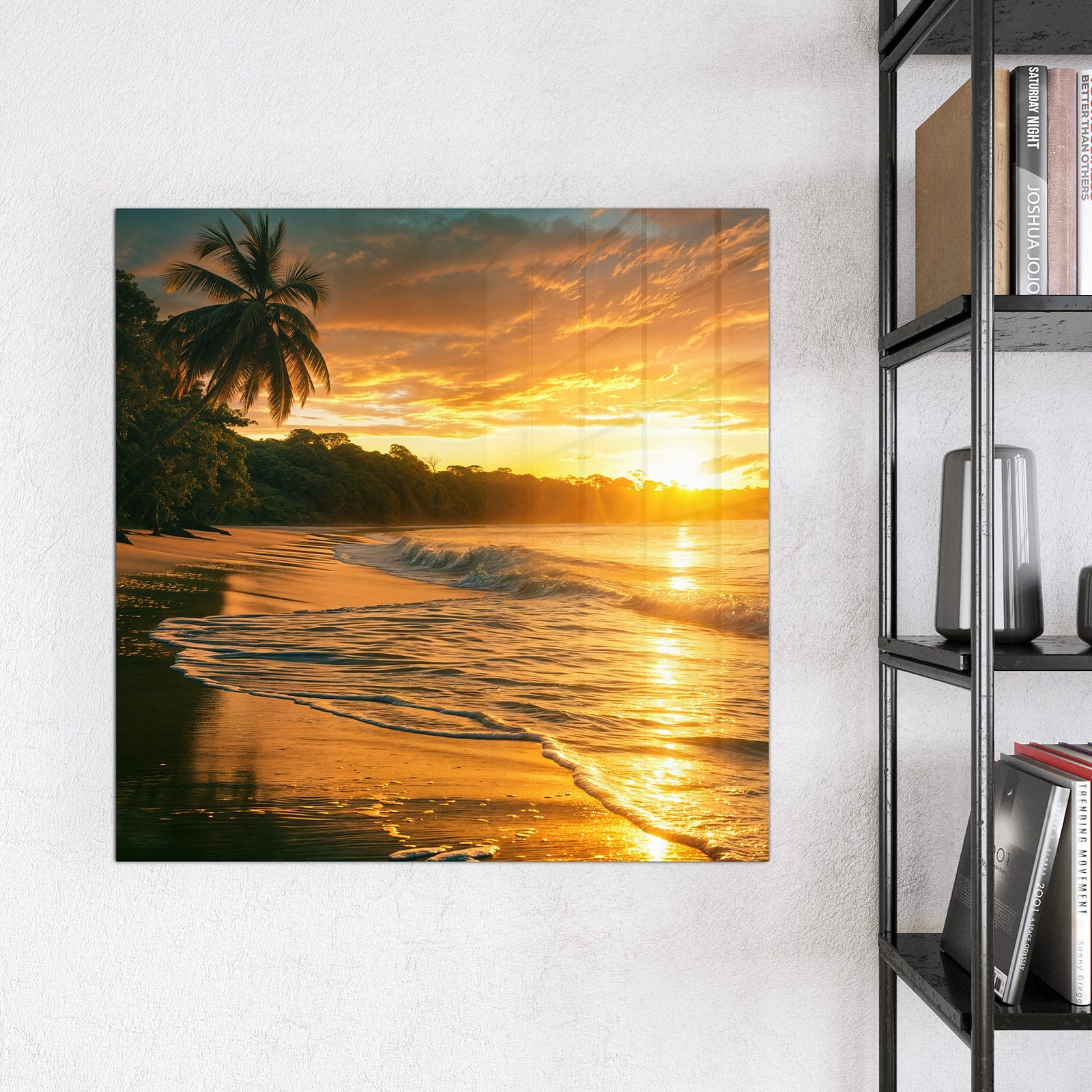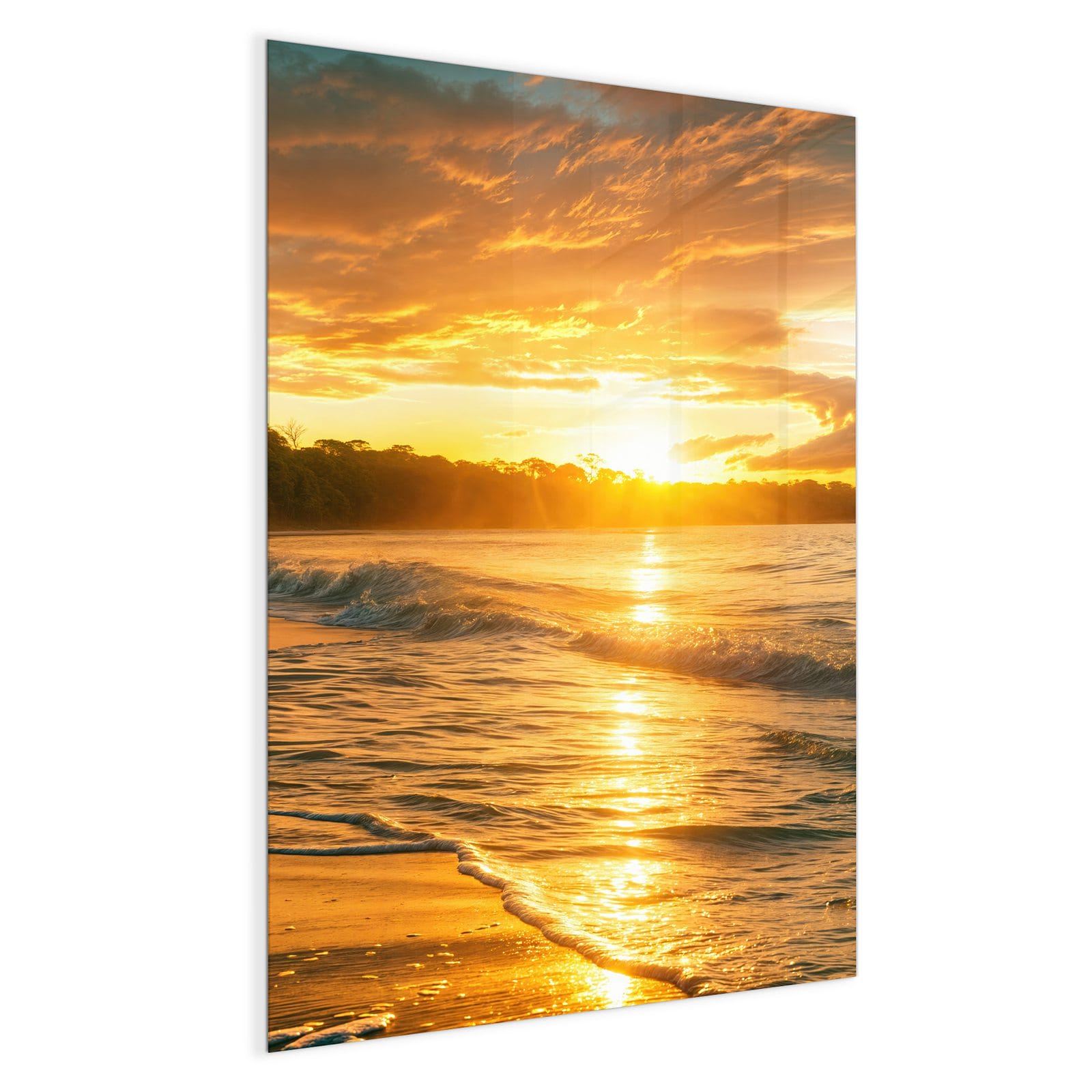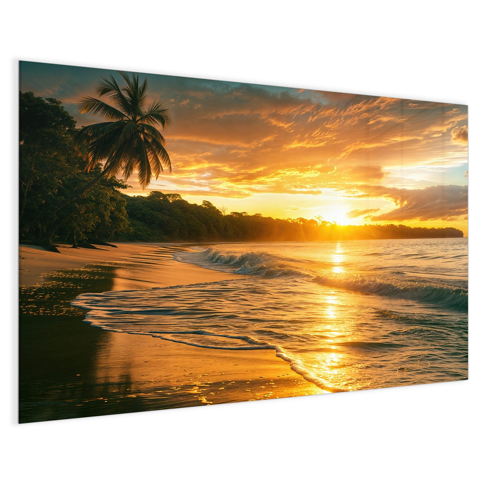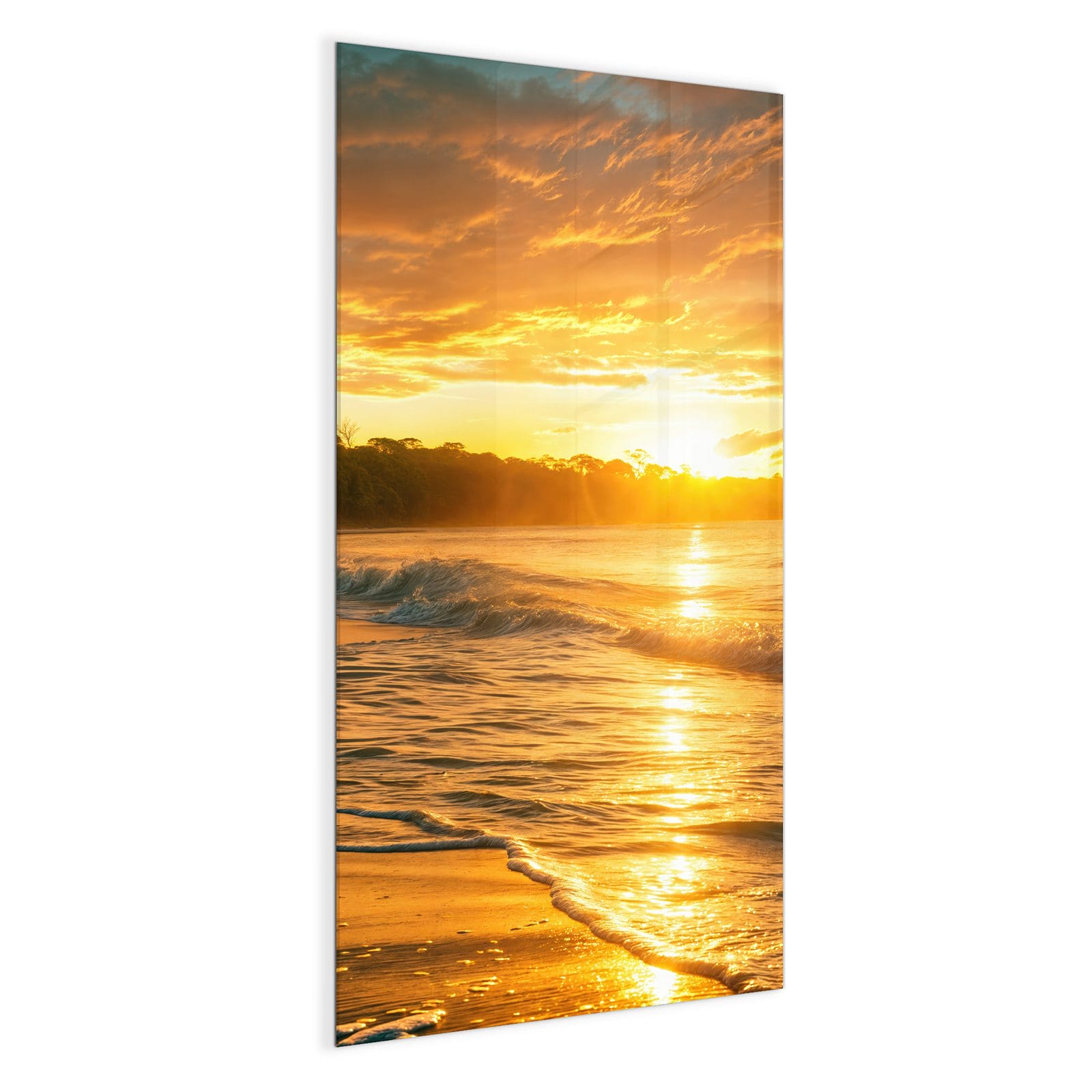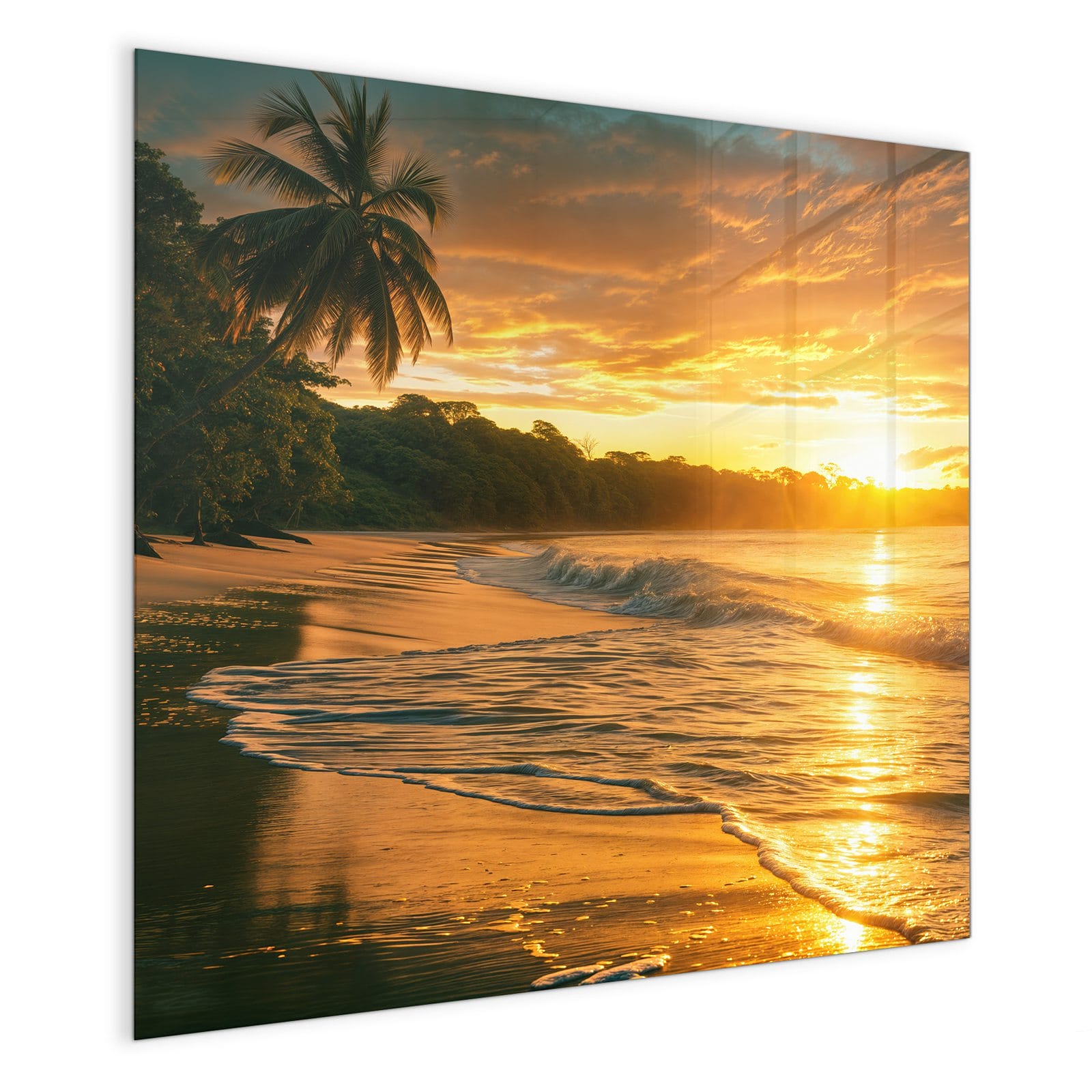 Mit einer Dicke von 4 mm besteht die Tafel aus gehärtetem Einscheibensicherheitsglas (ESG), das robust, kratzfest und UV-beständig ist. Das Motiv Sonnenuntergang Strand wird in hoher Auflösung und mit präzisen Details auf das Glas gedruckt, was eine lebendige und dauerhafte Farbbrillanz garantiert. Die polierten Kanten sorgen für ein hochwertiges Erscheinungsbild und minimieren das Verletzungsrisiko.
