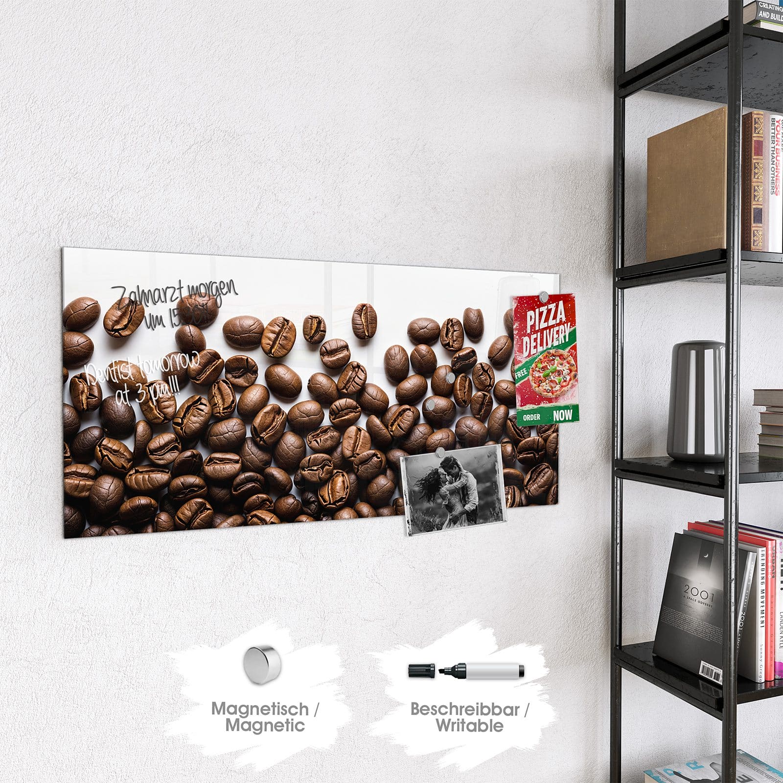 Hinweis: An dieser Glas-Magnettafel haften ausschließlich starke Magnete wie die mitgelieferten Neodym-Magnete. Gewöhnliche Kühlschrankmagnete sind nicht ausreichend stark.