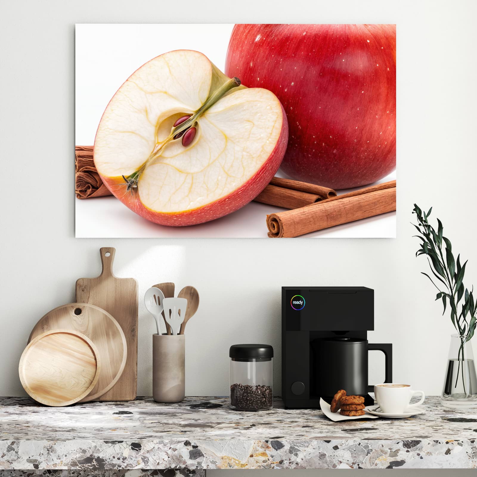 Die Magnettafel besteht aus hochwertigem, pulverbeschichtetem Stahlblech, das für seine robuste und langlebige Natur bekannt ist. Diese Beschaffenheit macht es beständig gegen UV-Strahlen und Feuchtigkeit. Die glatte Metalloberfläche bietet eine beeindruckende Farbbrillanz und Tiefe. Das Motiv Apfel mit Zimt wird in hoher Auflösung und mit präzisen Details auf das Metall gedruckt, was eine lebendige und dauerhafte Darstellung sicherstellt.