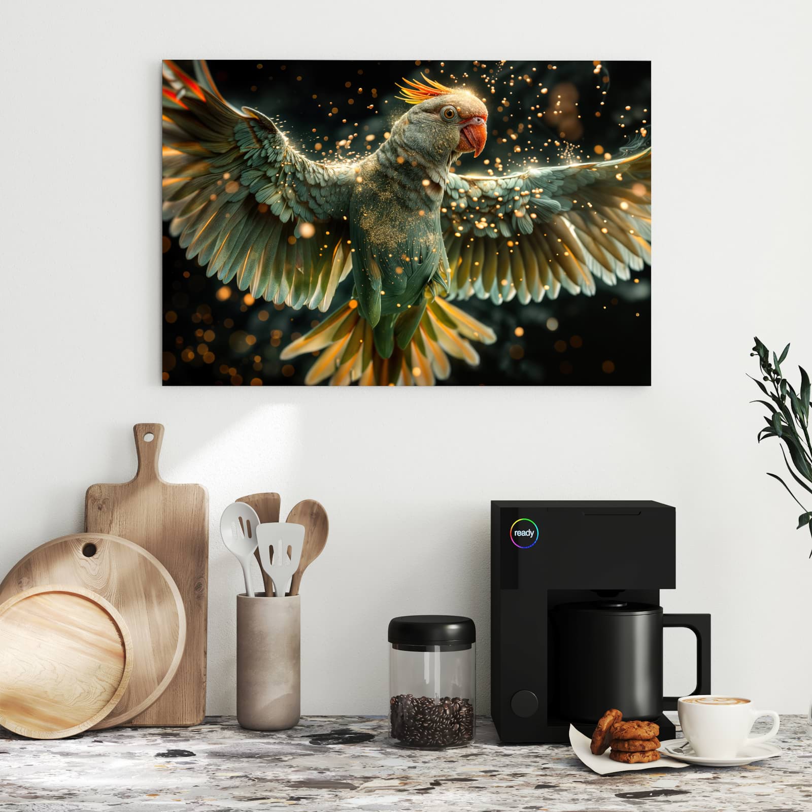 Die Magnettafel besteht aus hochwertigem, pulverbeschichtetem Stahlblech, das für seine robuste und langlebige Natur bekannt ist. Diese Beschaffenheit macht es beständig gegen UV-Strahlen und Feuchtigkeit. Die glatte Metalloberfläche bietet eine beeindruckende Farbbrillanz und Tiefe. Das Motiv Fliegender Papagei wird in hoher Auflösung und mit präzisen Details auf das Metall gedruckt, was eine lebendige und dauerhafte Darstellung sicherstellt.
