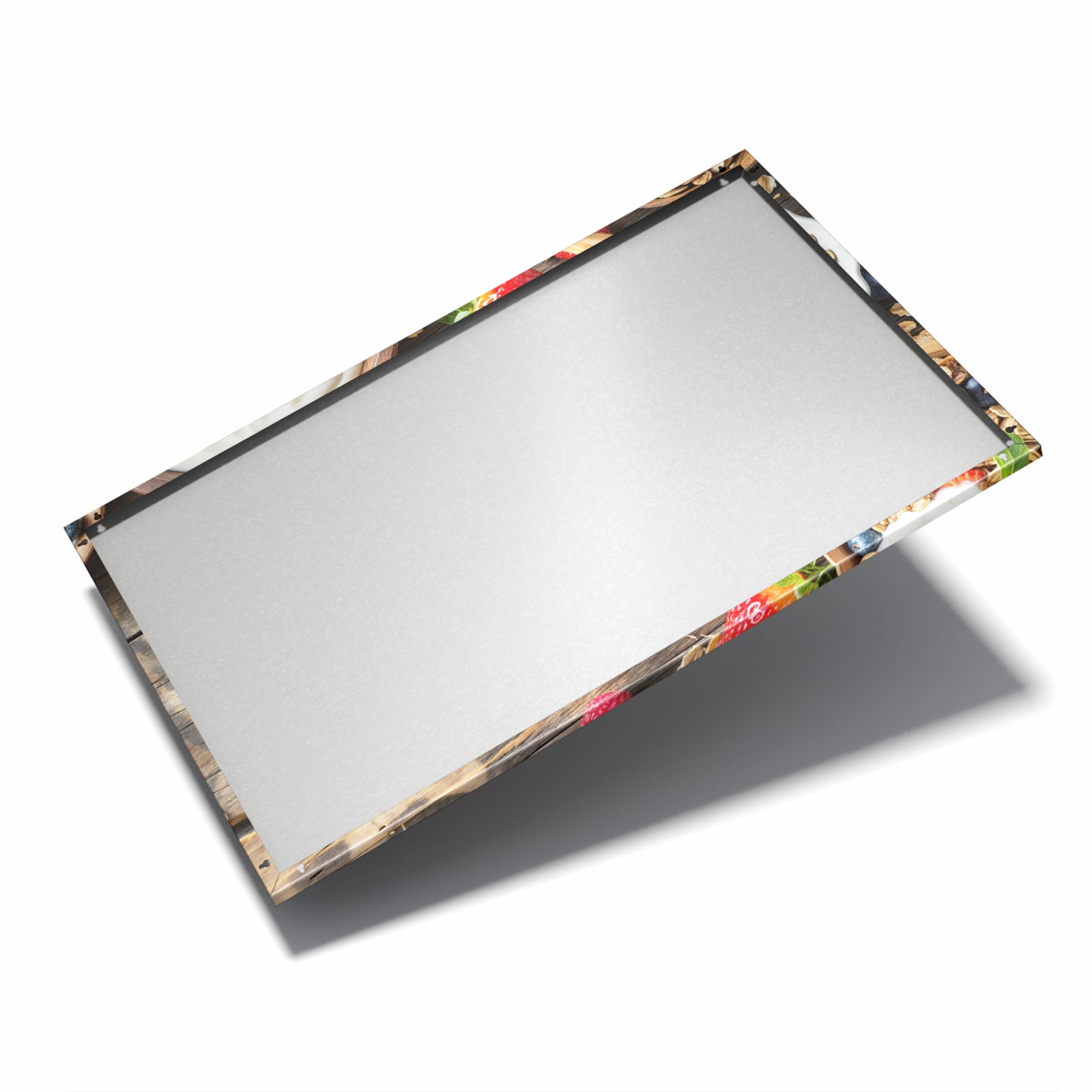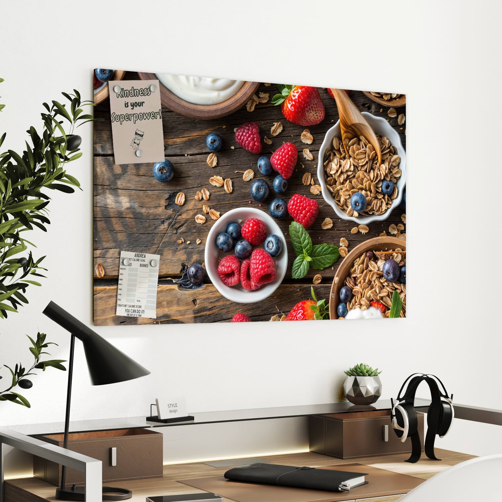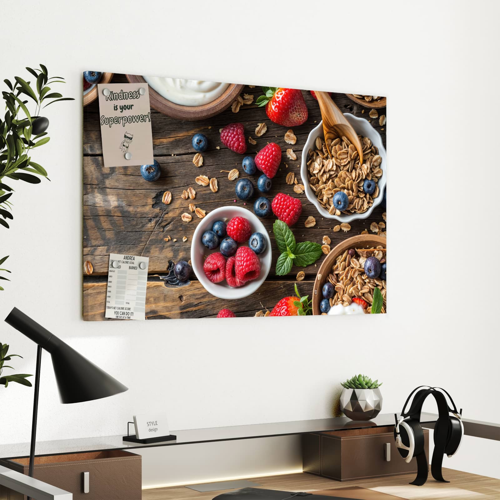 Die Magnettafel besteht aus hochwertigem, pulverbeschichtetem Stahlblech, das für seine robuste und langlebige Natur bekannt ist. Diese Beschaffenheit macht es beständig gegen UV-Strahlen und Feuchtigkeit. Die glatte Metalloberfläche bietet eine beeindruckende Farbbrillanz und Tiefe. Das Motiv Frühstück Müsli wird in hoher Auflösung und mit präzisen Details auf das Metall gedruckt, was eine lebendige und dauerhafte Darstellung sicherstellt.