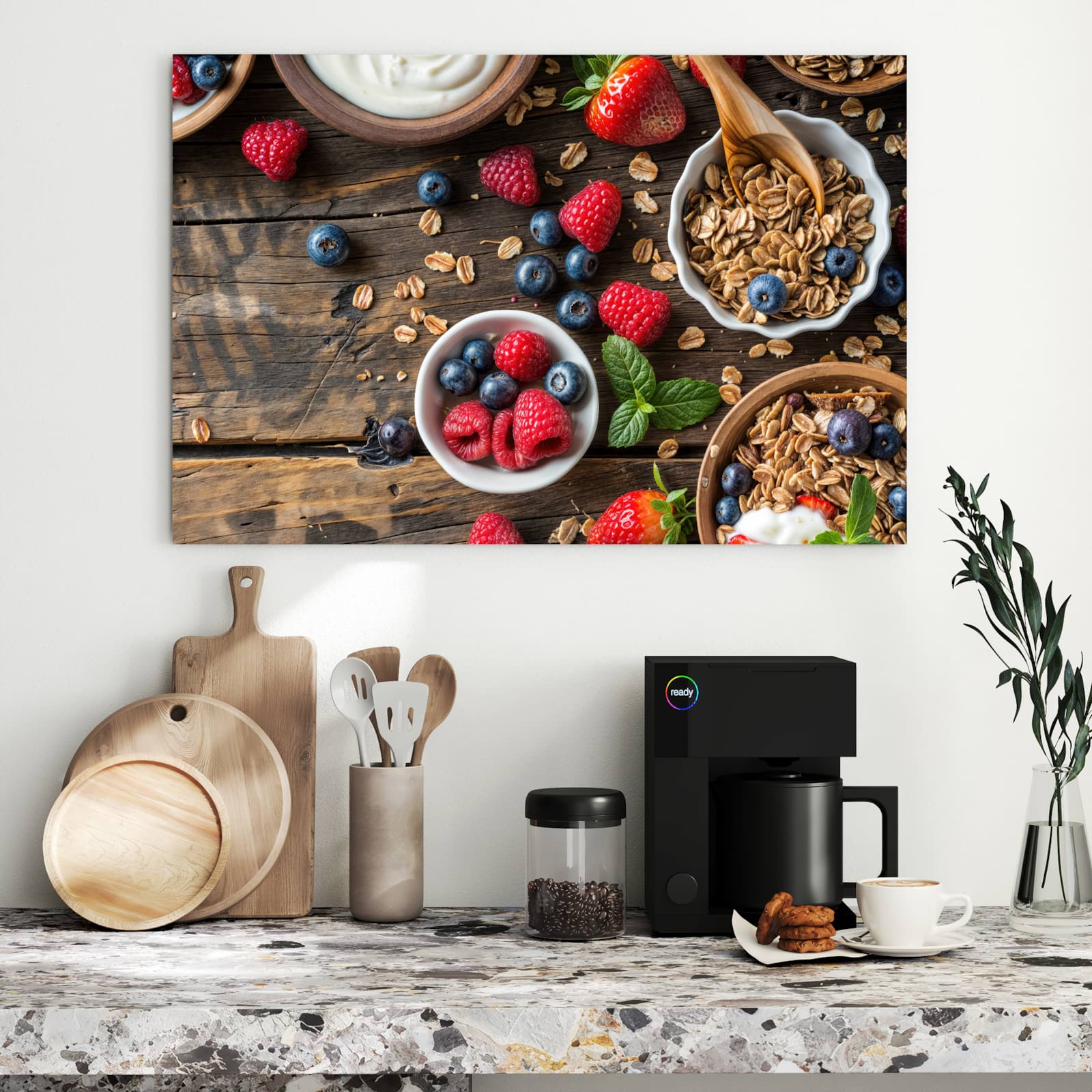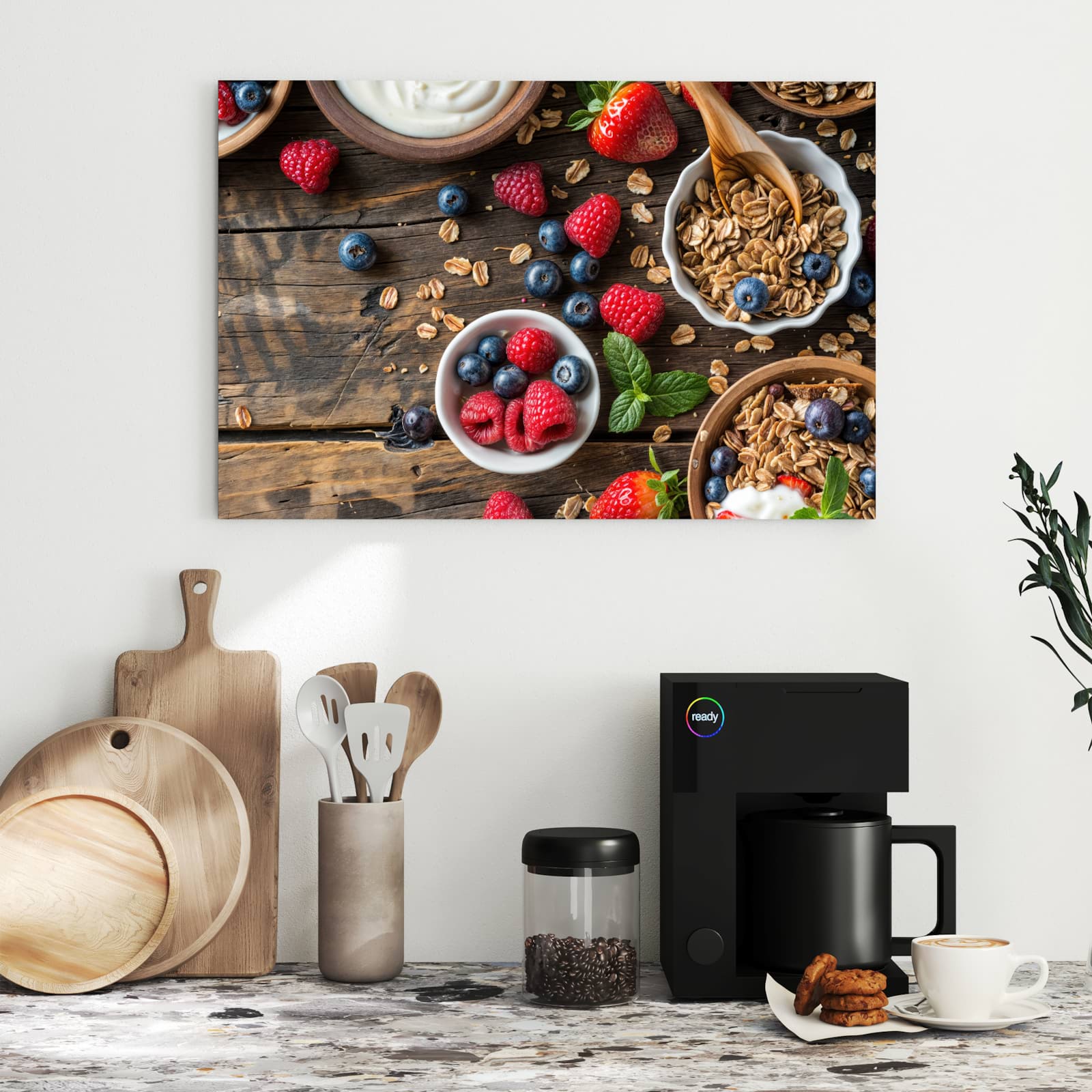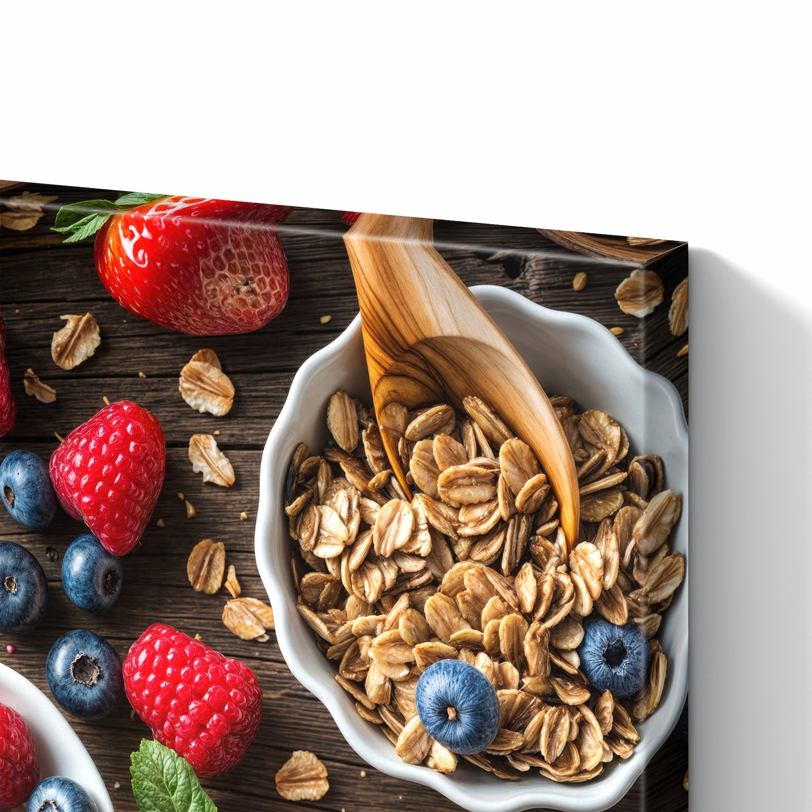 Die Magnettafel besteht aus hochwertigem, pulverbeschichtetem Stahlblech, das für seine robuste und langlebige Natur bekannt ist. Diese Beschaffenheit macht es beständig gegen UV-Strahlen und Feuchtigkeit. Die glatte Metalloberfläche bietet eine beeindruckende Farbbrillanz und Tiefe. Das Motiv Frühstück Müsli wird in hoher Auflösung und mit präzisen Details auf das Metall gedruckt, was eine lebendige und dauerhafte Darstellung sicherstellt.