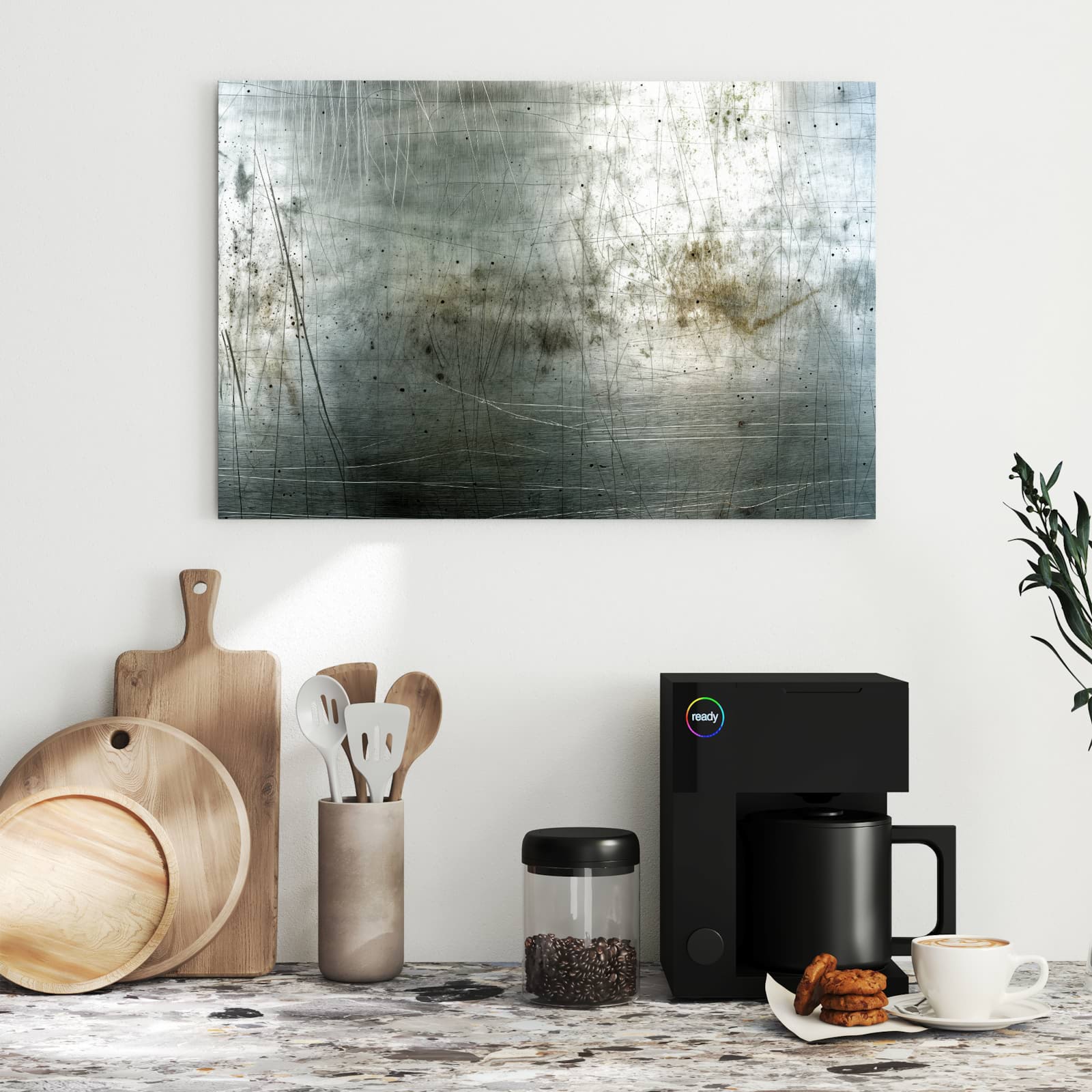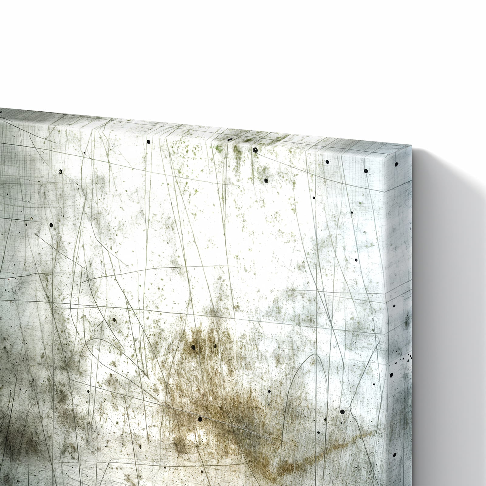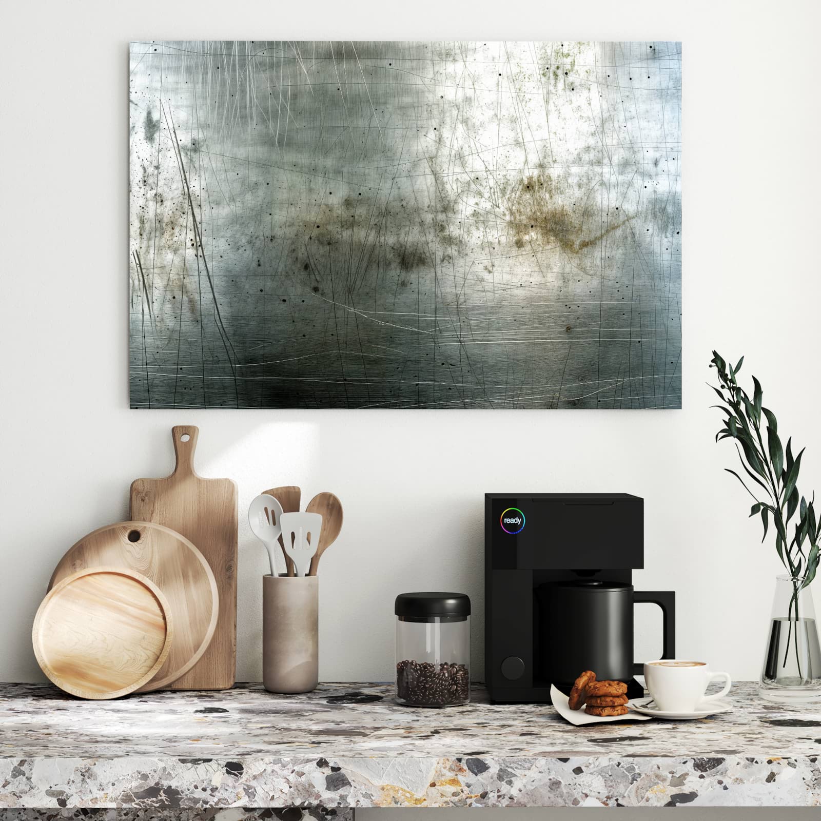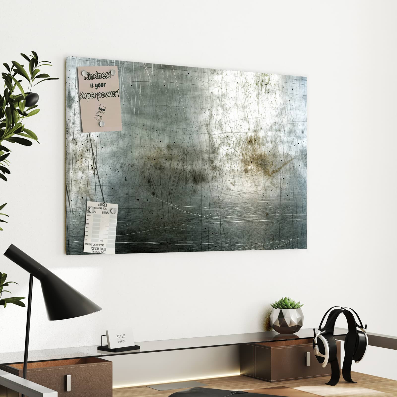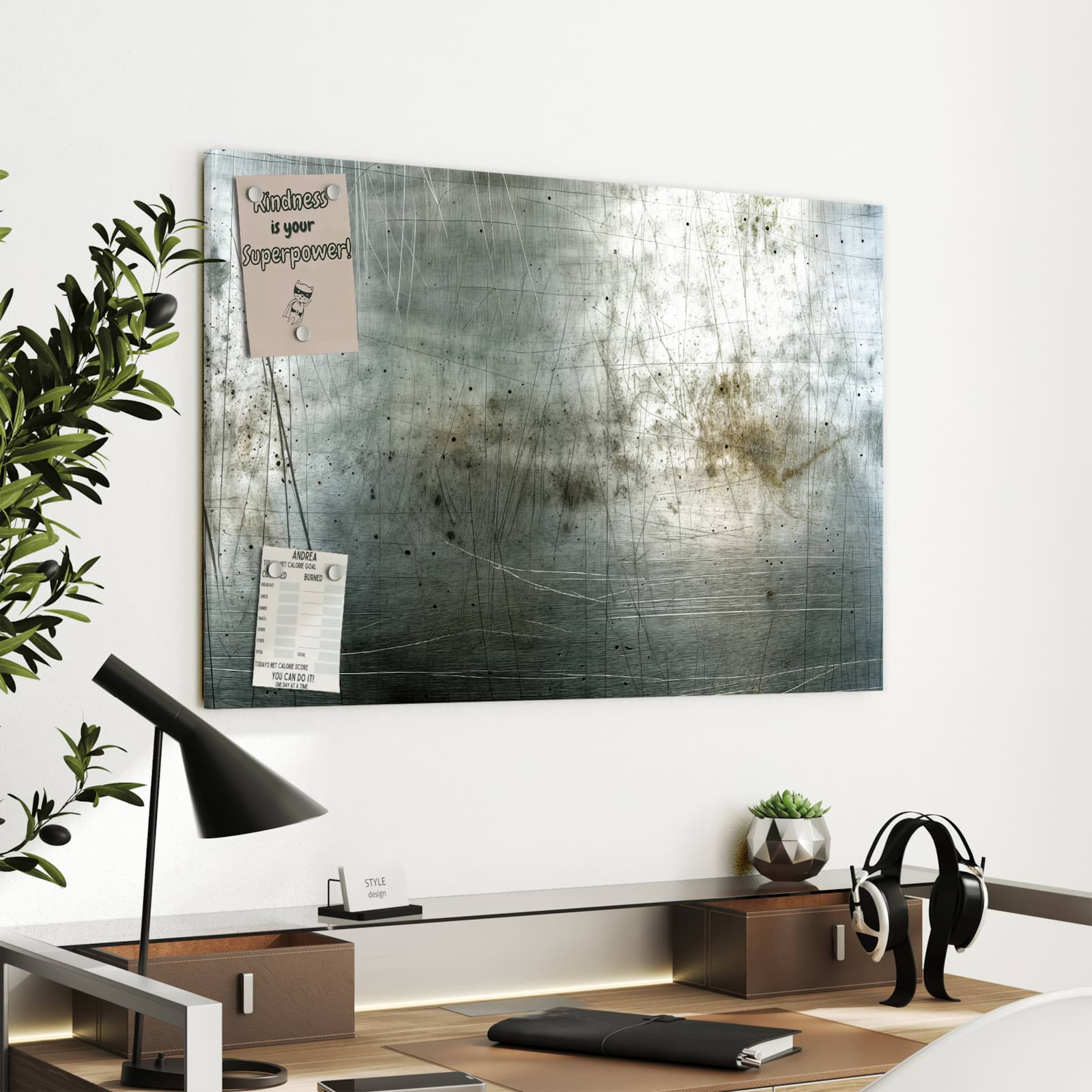 Kratzer und feine Linien zieren eine metallische Oberfläche in kühlen Grautönen mit vereinzelten rostfarbenen Flecken. Die industrielle Vintage-Ästhetik verleiht einem Whiteboard einen raumhaft-markanten Charakter, der Räume mit urbanem Charakter veredelt.