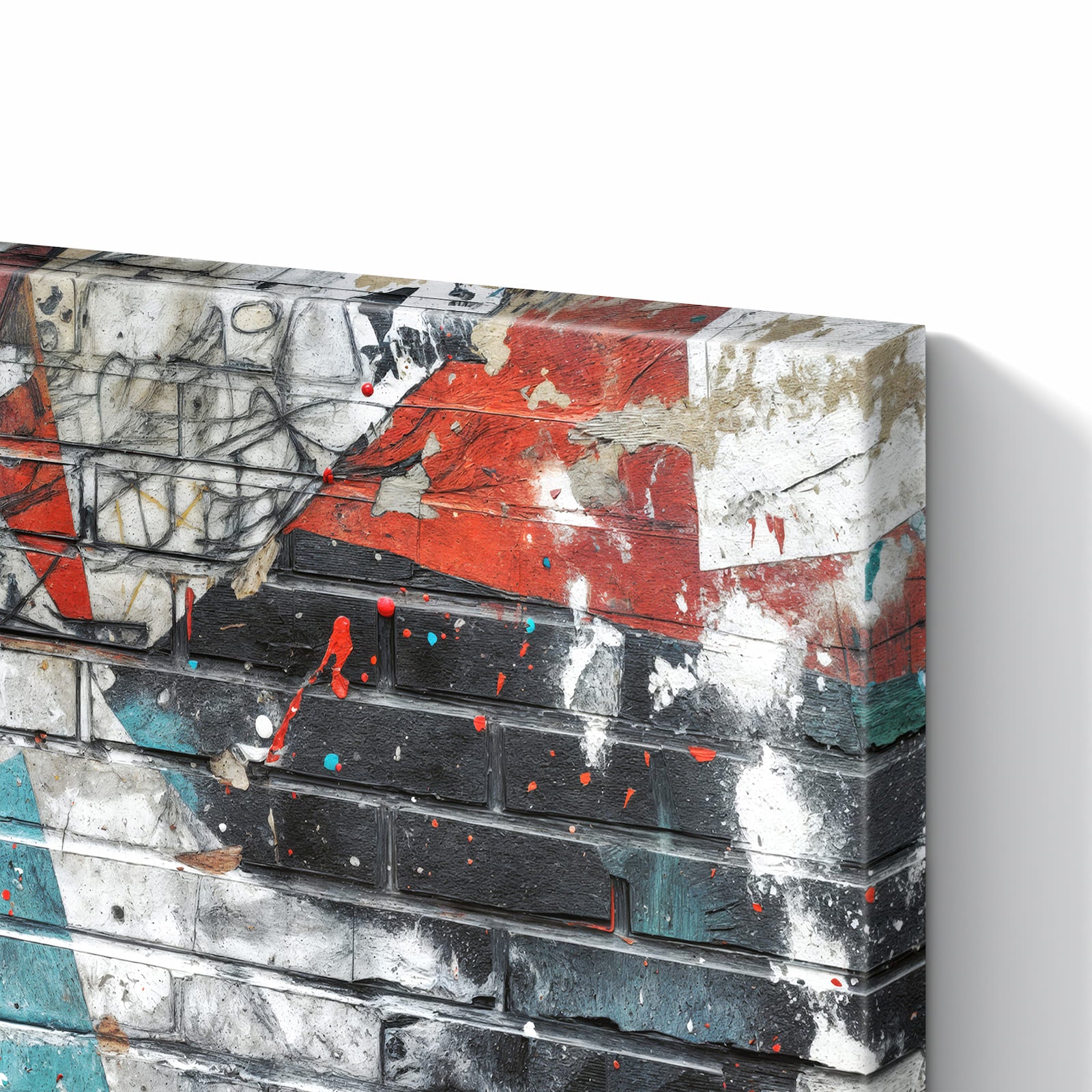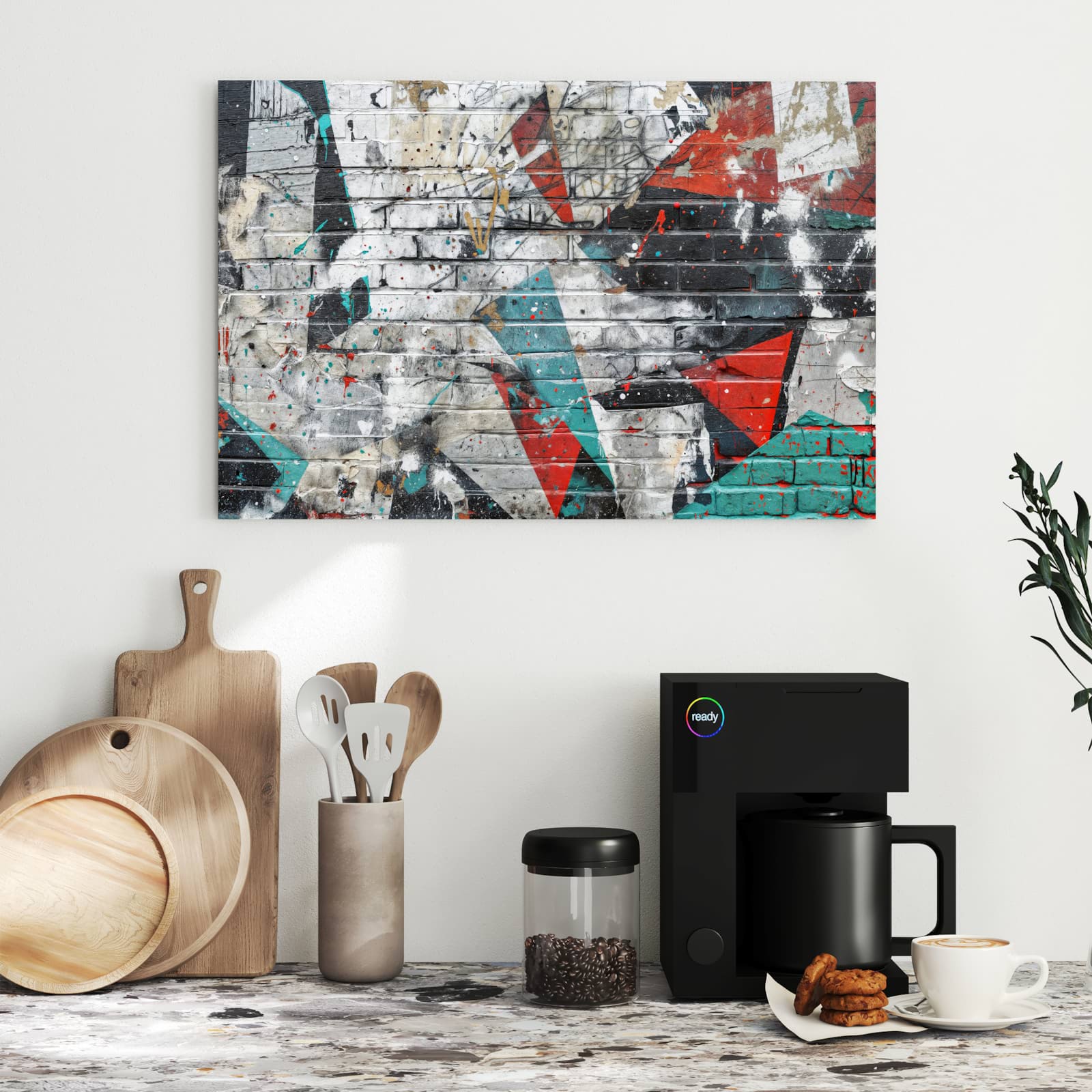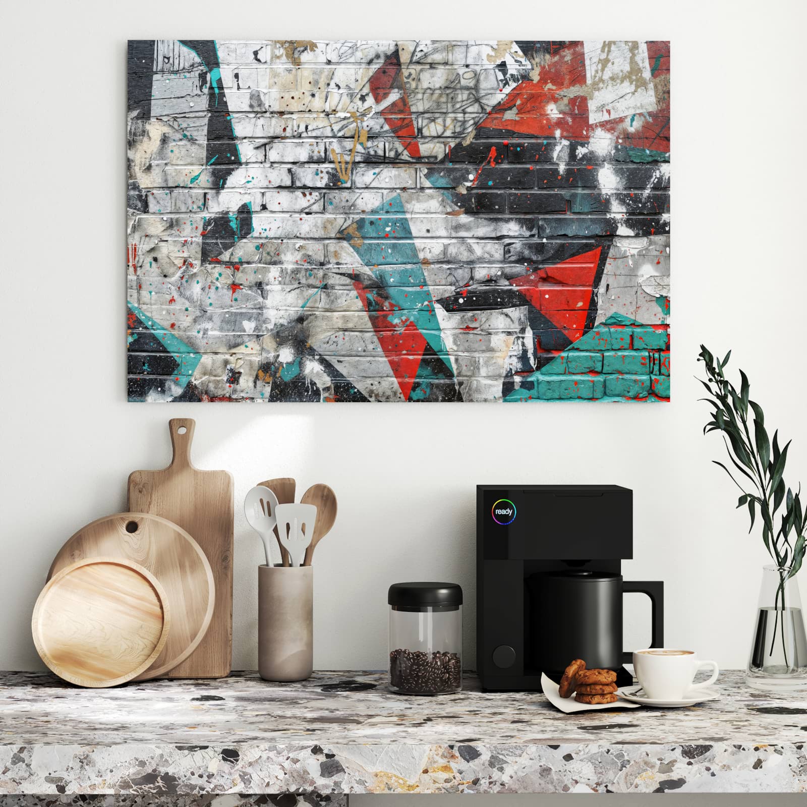 Kräftige Rottöne kontrastieren mit Schwarz, Weiß, Türkis und Beige in geometrischen Graffiti-Formen auf urbaner Mauer. Die coole Street-Art-Ästhetik verleiht einer Magnet-Pinnwand einen rebellisch-urbanen Charakter, der Räume mit Kiez-Attitüde schmückt.