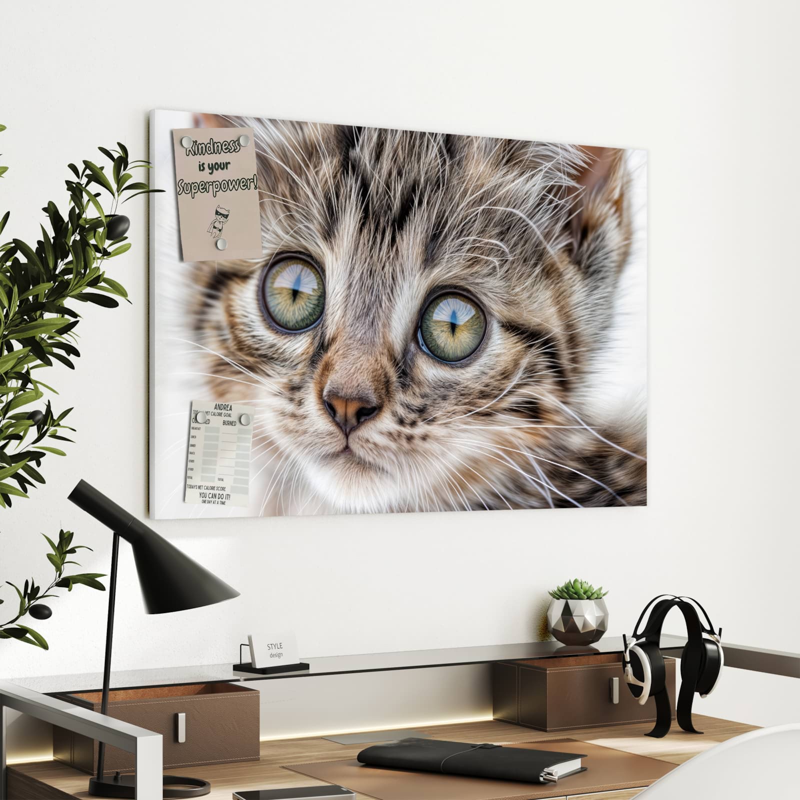 Die Magnettafel ist sehr pflegeleicht – die glatte Oberfläche kann problemlos mit einem feuchten Tuch gereinigt werden. Die vormontierte Wandhalterung ermöglicht eine sichere und elegante Aufhängung, sodass die Tafel schnell einsatzbereit ist. Diese Designmerkmale betonen nicht nur die hochwertige Verarbeitung, sondern auch die Sorgfalt, die in jedem Detail steckt.