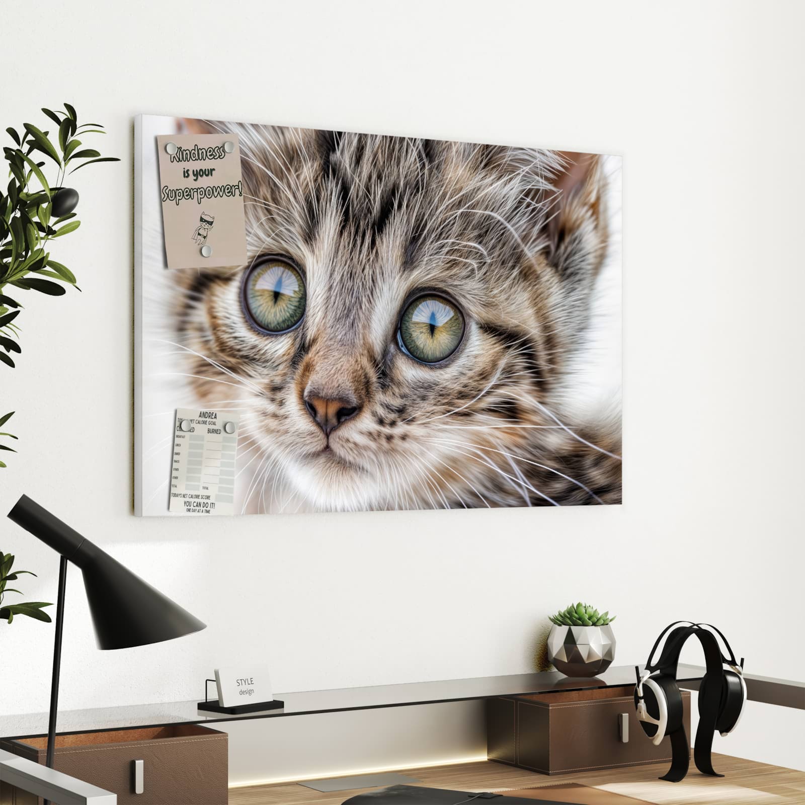 Die Metall-Magnettafel von Primedeco ist eine stilvolle und praktische Ergänzung für jede moderne Einrichtung. Sie vereint elegantes Design mit Funktionalität und wird so zum Blickfang in jedem Raum. Diese Tafel passt sich harmonisch an verschiedene Einrichtungsstile an und eignet sich hervorragend für Wohnzimmer, Büros und mehr.