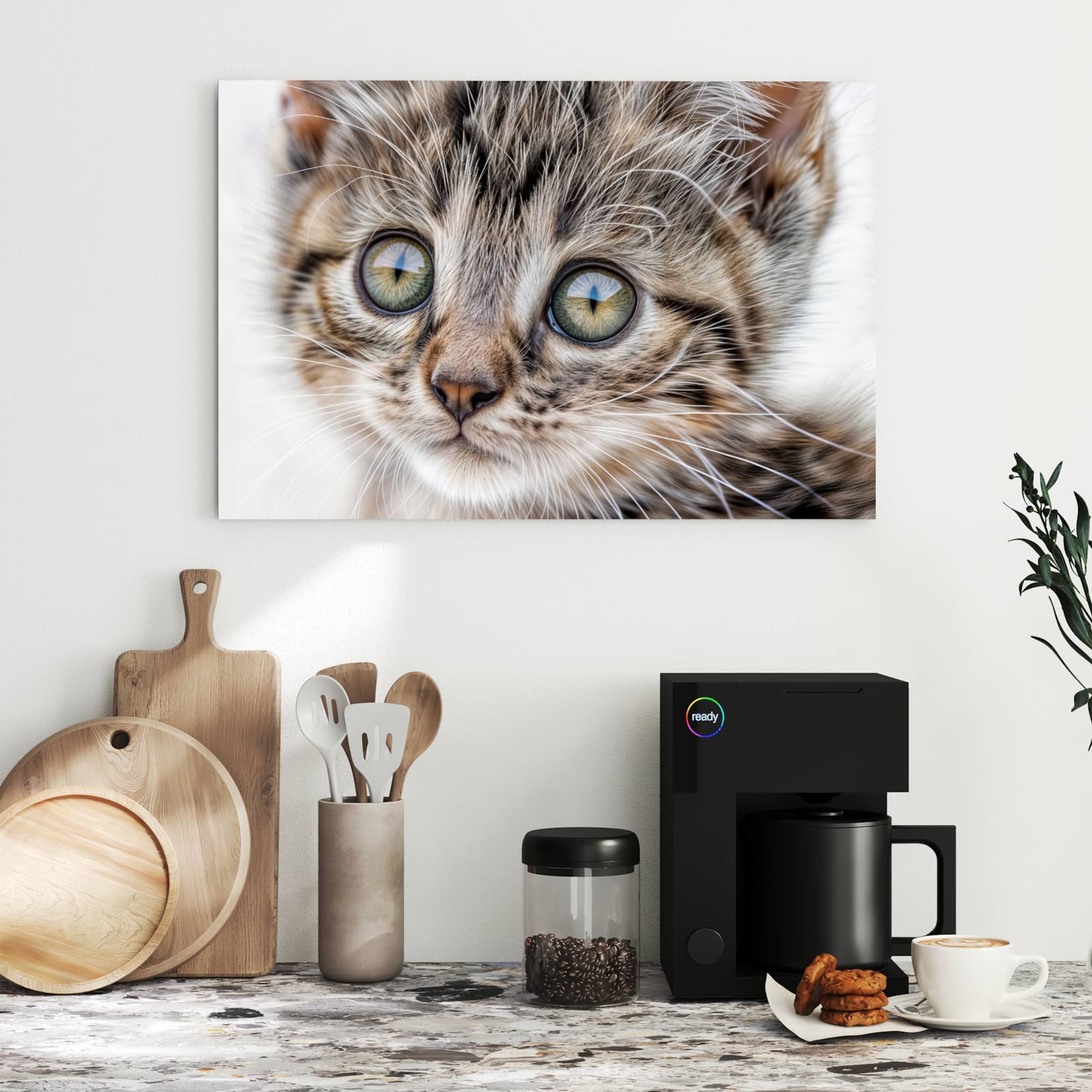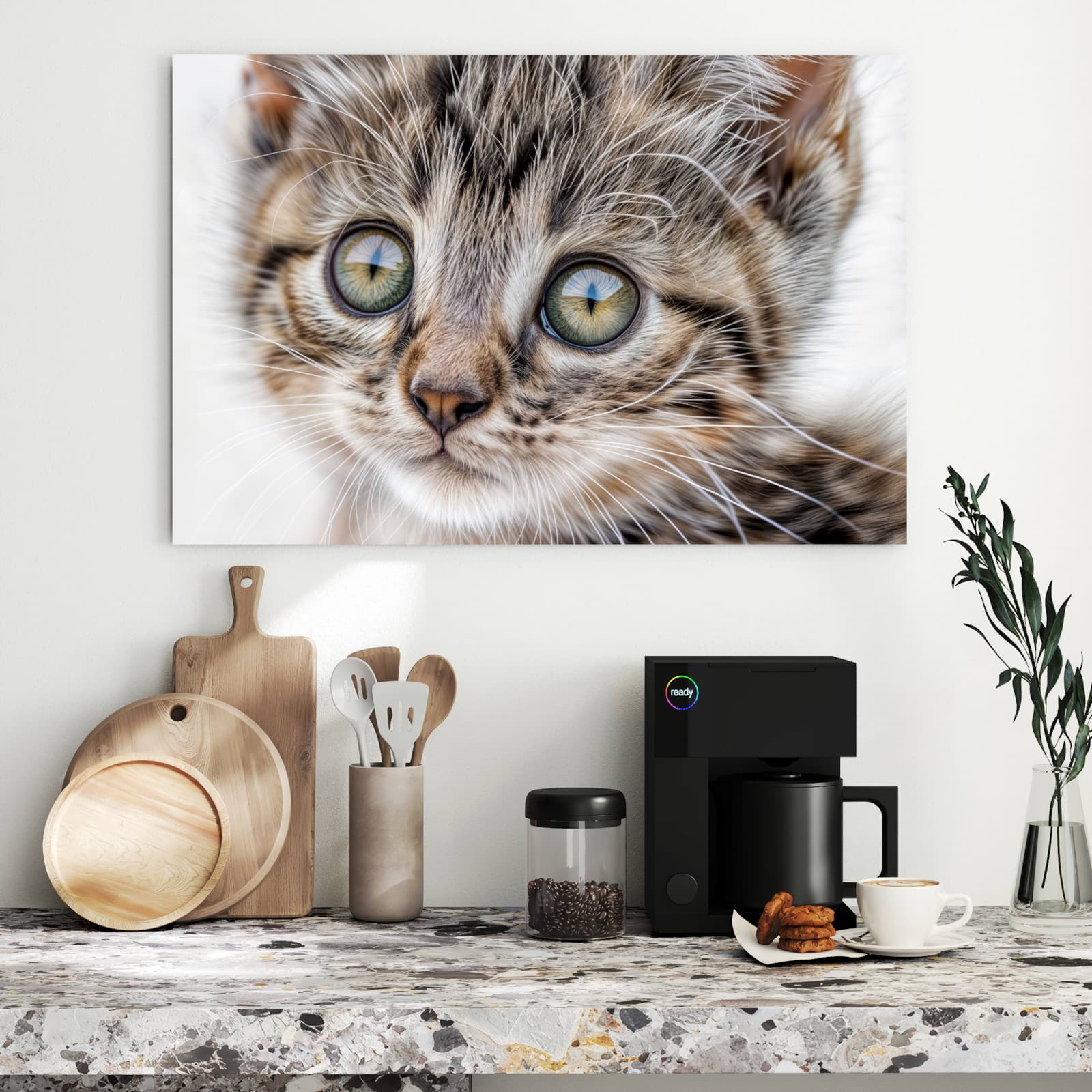 Die Magnettafel besteht aus hochwertigem, pulverbeschichtetem Stahlblech, das für seine robuste und langlebige Natur bekannt ist. Diese Beschaffenheit macht es beständig gegen UV-Strahlen und Feuchtigkeit. Die glatte Metalloberfläche bietet eine beeindruckende Farbbrillanz und Tiefe. Das Motiv Neugieriges Katzenjunges wird in hoher Auflösung und mit präzisen Details auf das Metall gedruckt, was eine lebendige und dauerhafte Darstellung sicherstellt.
