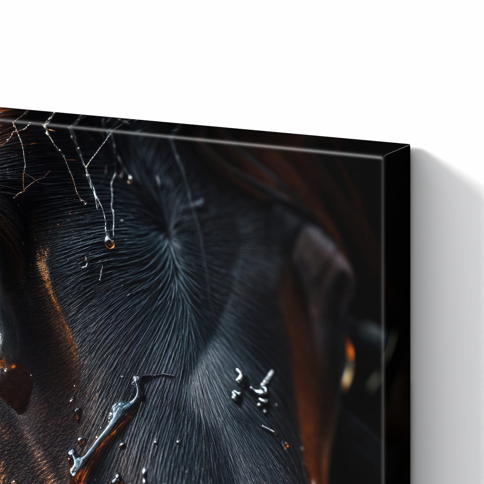 Die Magnettafel besteht aus hochwertigem, pulverbeschichtetem Stahlblech, das für seine robuste und langlebige Natur bekannt ist. Diese Beschaffenheit macht es beständig gegen UV-Strahlen und Feuchtigkeit. Die glatte Metalloberfläche bietet eine beeindruckende Farbbrillanz und Tiefe. Das Motiv Pferdeauge im Regen wird in hoher Auflösung und mit präzisen Details auf das Metall gedruckt, was eine lebendige und dauerhafte Darstellung sicherstellt.