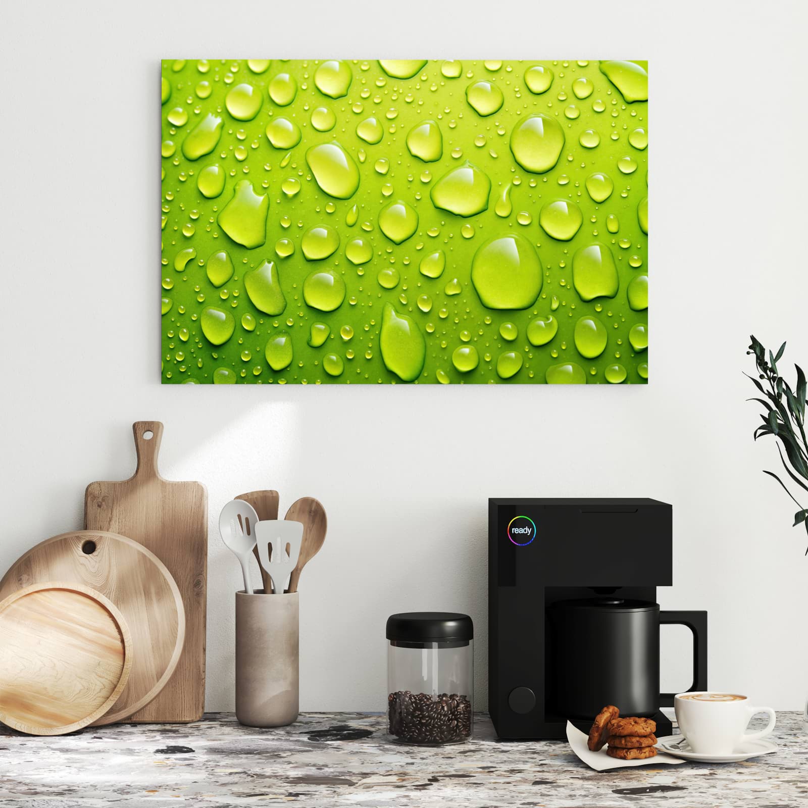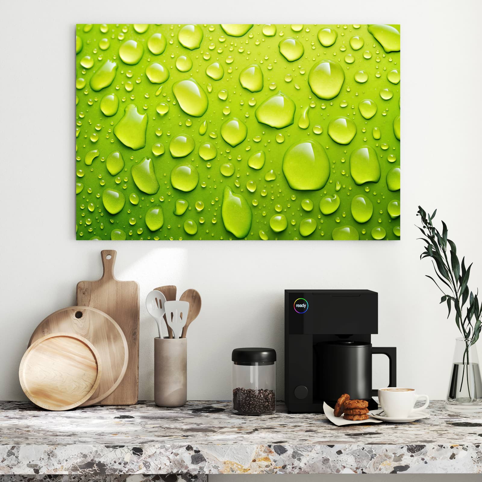 Die Magnettafel besteht aus hochwertigem, pulverbeschichtetem Stahlblech, das für seine robuste und langlebige Natur bekannt ist. Diese Beschaffenheit macht es beständig gegen UV-Strahlen und Feuchtigkeit. Die glatte Metalloberfläche bietet eine beeindruckende Farbbrillanz und Tiefe. Das Motiv Sanfte Wassertropfen wird in hoher Auflösung und mit präzisen Details auf das Metall gedruckt, was eine lebendige und dauerhafte Darstellung sicherstellt.