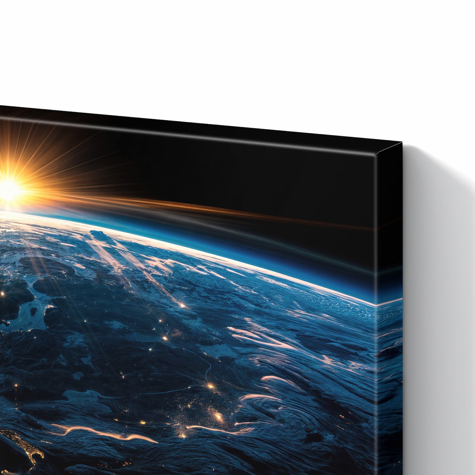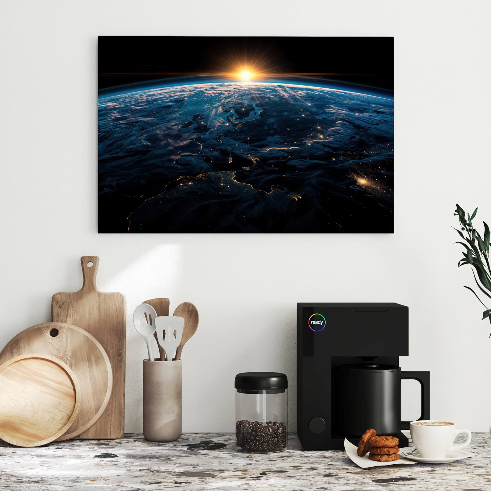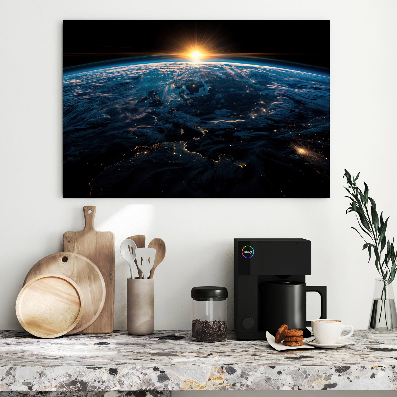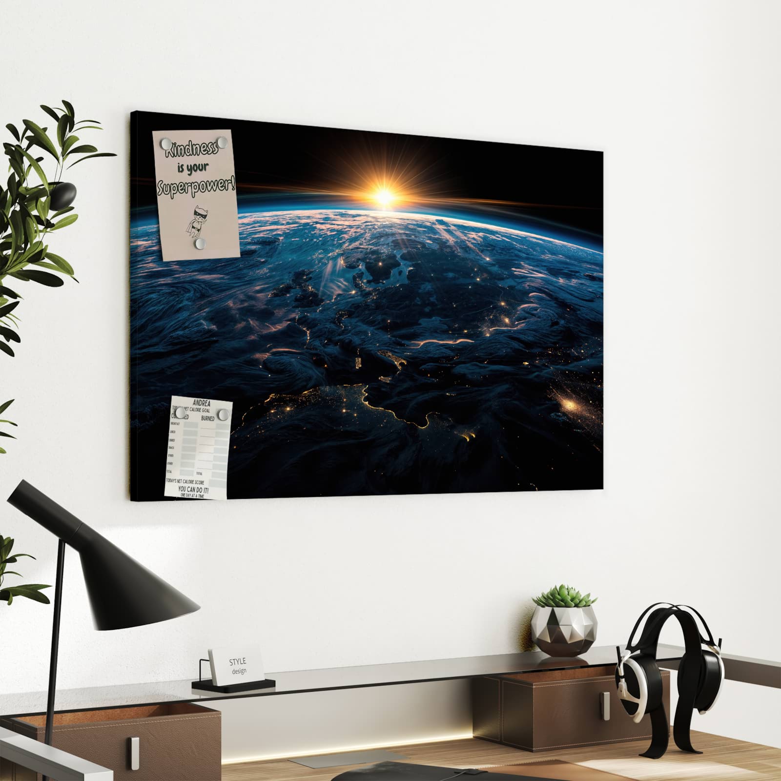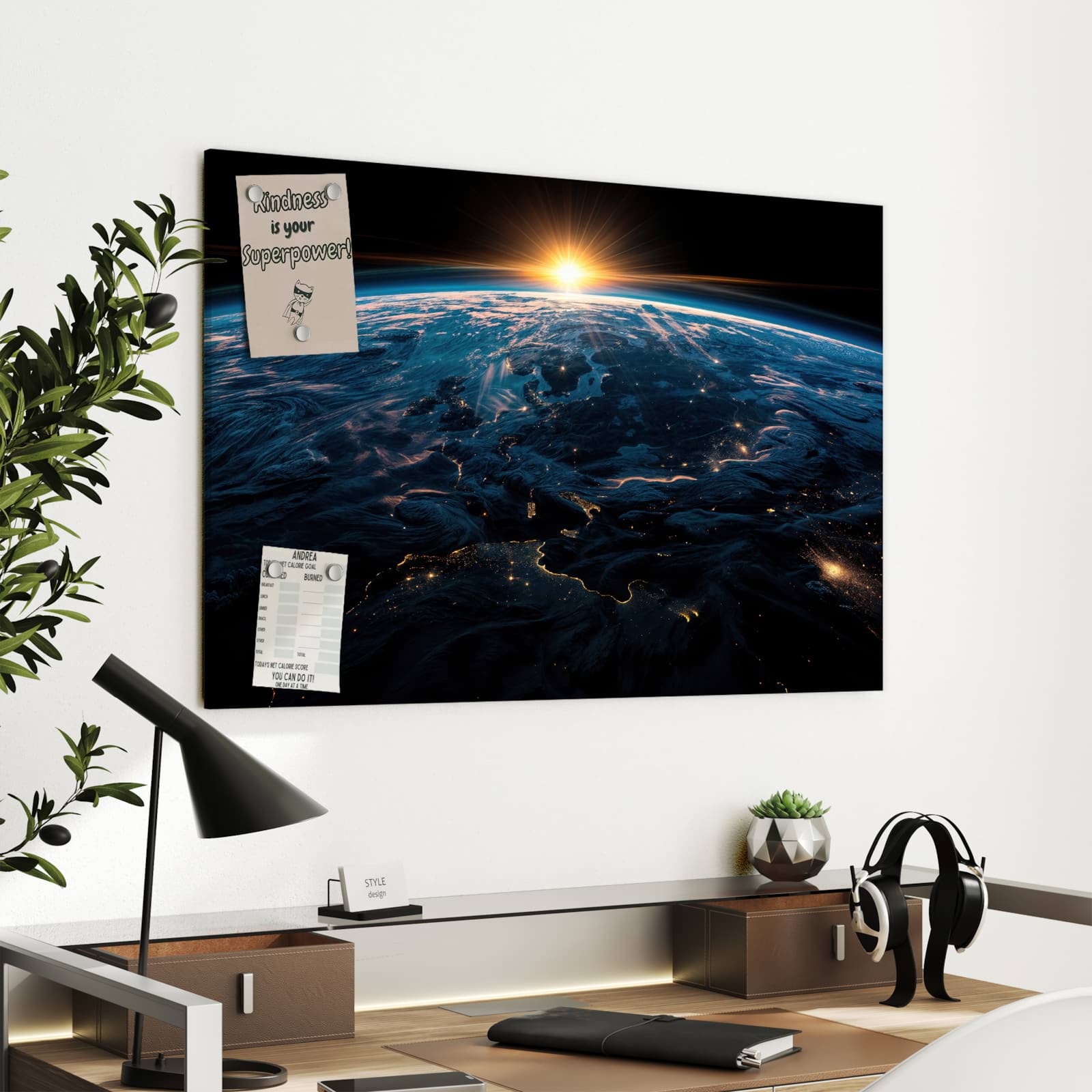 Goldgelbe Strahlen eines Sonnenaufgangs kriechen über den Horizont der Erde, während unter einem satten Schwarz erleuchtete Städte wie Juwelen glitzern. Dieser atemberaubende Panoramablick verwandelt eine Magnetwand in eine inspirierende Weltbühne, die große Gedanken jeden Morgen anregt.