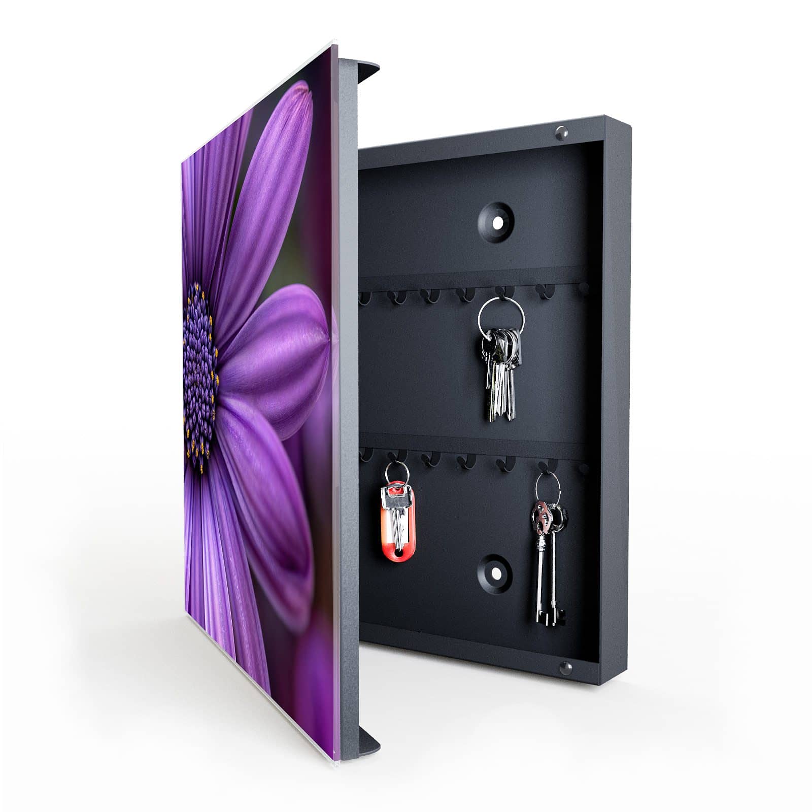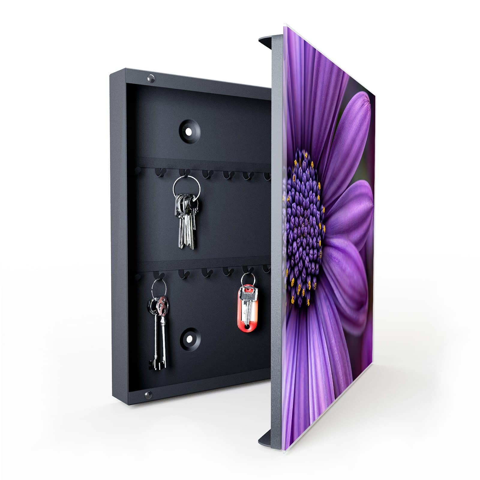 Mit dem Schlüsselkasten von Primedeco gehört das lästige Suchen nach Schlüsseln der Vergangenheit an. Egal ob Hausschlüssel, Autoschlüssel oder Ersatzschlüssel – in diesem stilvollen Kasten aus beschichtetem Stahl und gehärtetem Glas finden alle Schlüssel einen übersichtlichen und platzsparenden Aufbewahrungsort. Dank der 5 Hakenreihen mit insgesamt 50 Plätzen bietet er genügend Raum für Familien, Büros oder kleine Unternehmen.