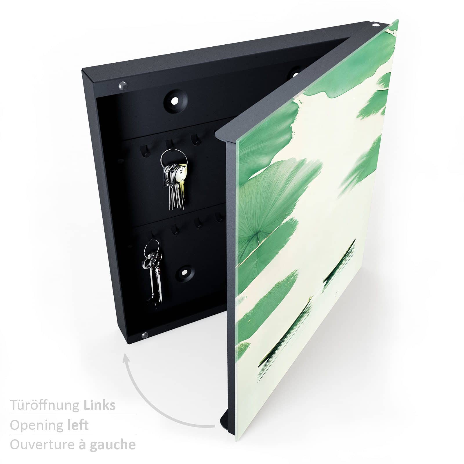 Der Schlüsselkasten ist nicht nur ein praktischer Organizer, sondern auch ein dekoratives Highlight. Die Glasfront ist magnetisch und kann mit den beigelegten Magnetpins individuell gestaltet werden. Ob wichtige Notizen, To-Do-Listen oder Fotos – der Schlüsselkasten wird zur multifunktionalen Pinnwand. Zudem ist die Glastür beschreibbar und bietet so zusätzlichen Platz für kreative Ideen oder Erinnerungen.