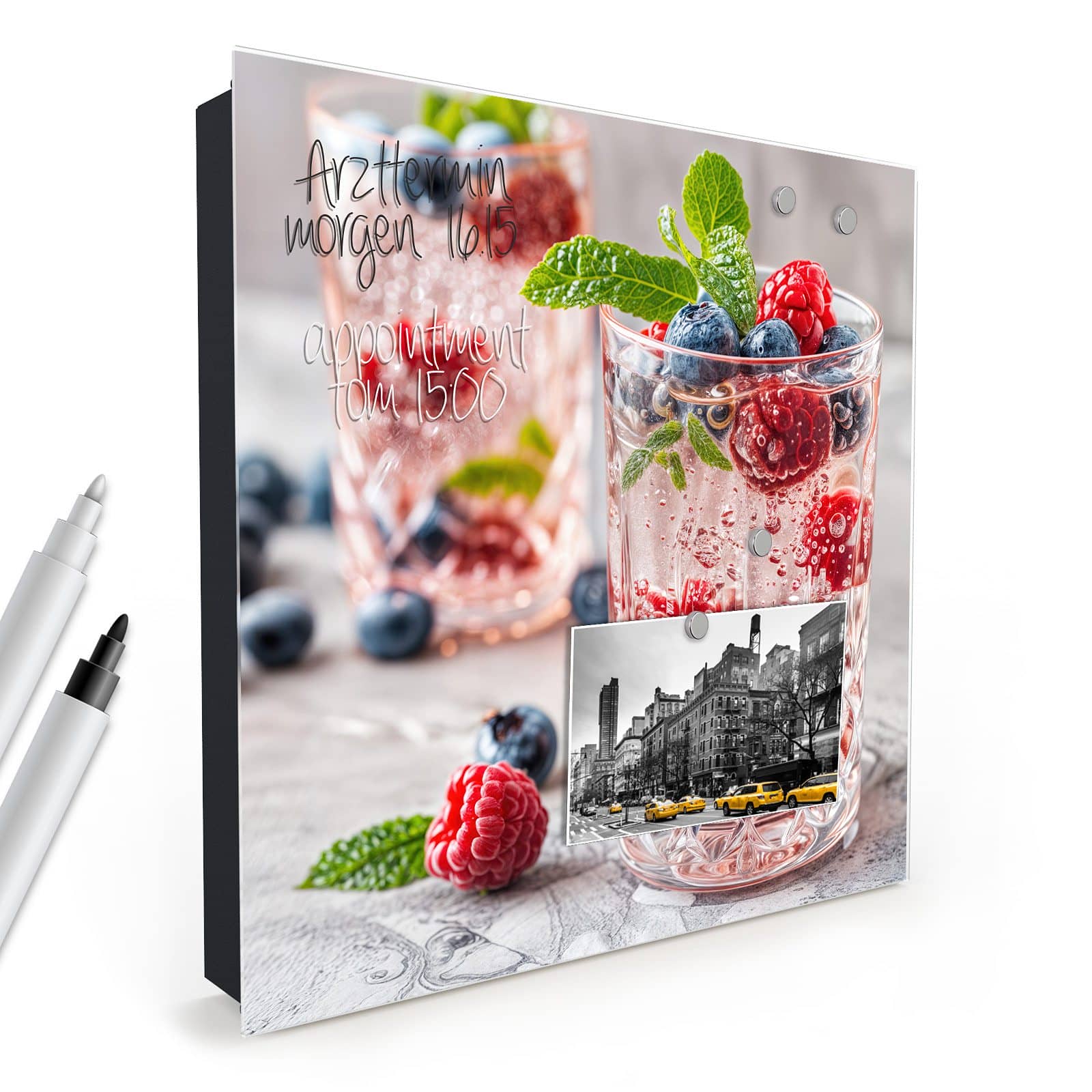 - Glasfront magnetisch und mit Hilfe von mitgelieferten Magnetpins frei dekorierbar
