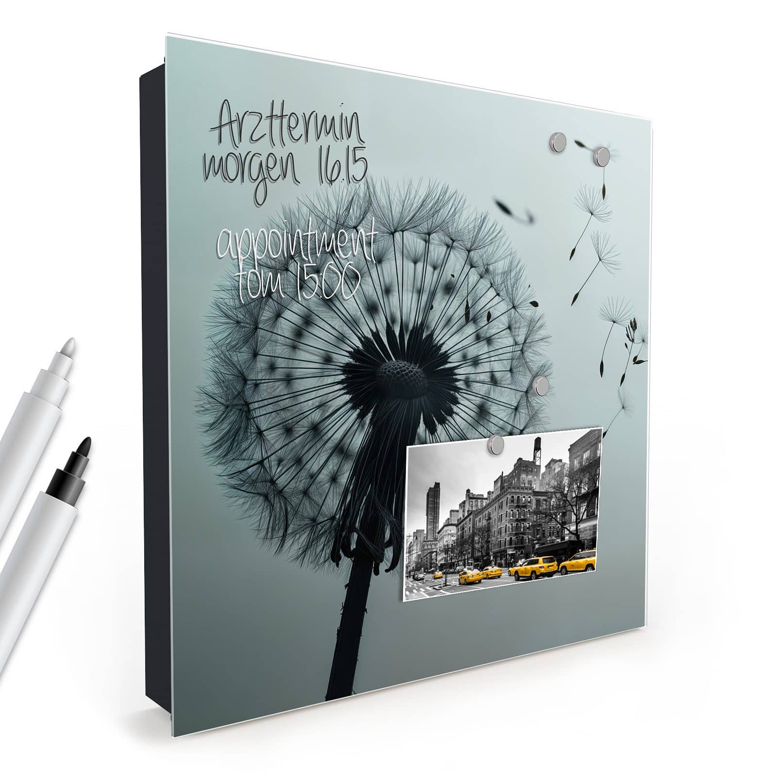 Der Schlüsselkasten ist nicht nur ein praktischer Organizer, sondern auch ein dekoratives Highlight. Die Glasfront ist magnetisch und kann mit den beigelegten Magnetpins individuell gestaltet werden. Ob wichtige Notizen, To-Do-Listen oder Fotos – der Schlüsselkasten wird zur multifunktionalen Pinnwand. Zudem ist die Glastür beschreibbar und bietet so zusätzlichen Platz für kreative Ideen oder Erinnerungen.