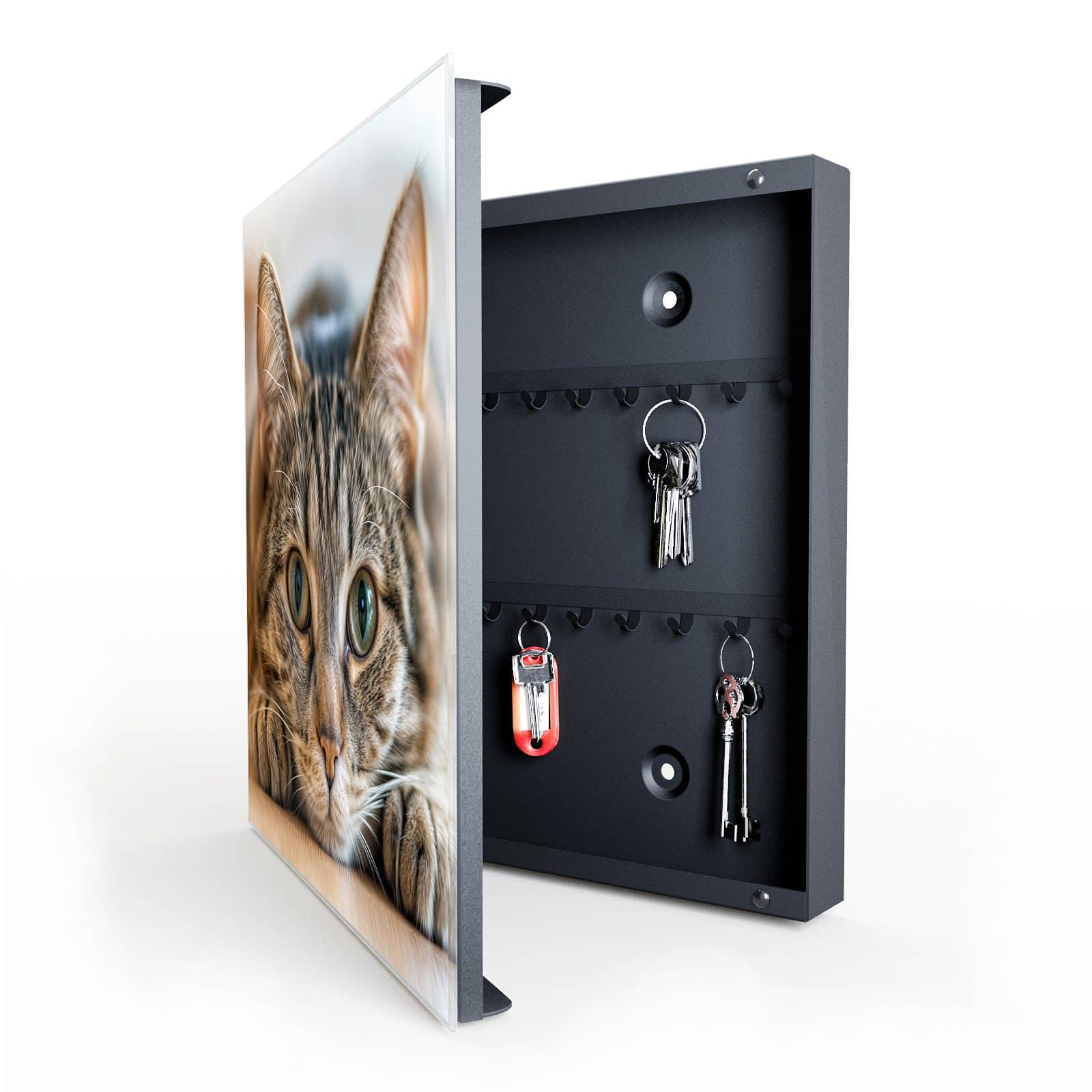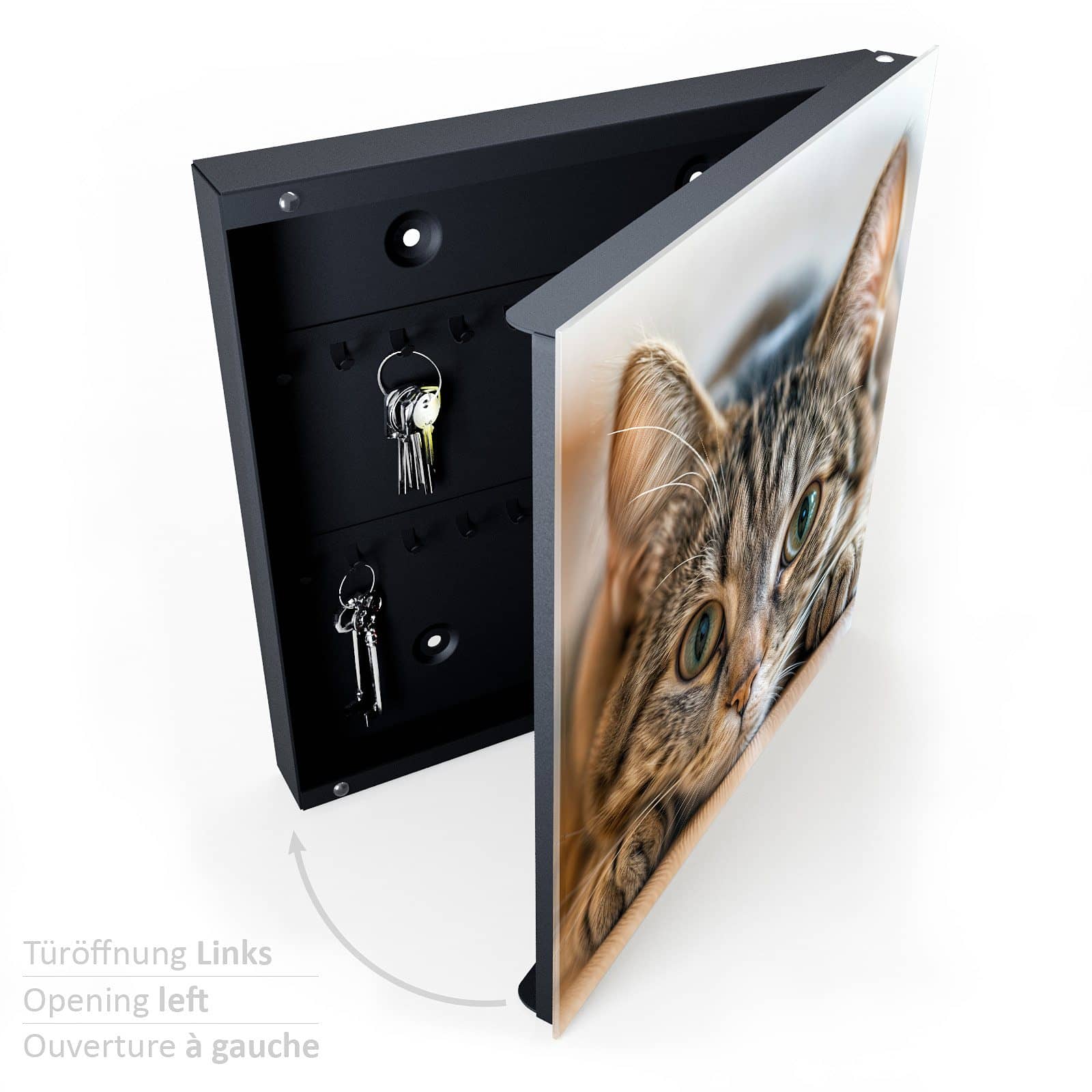 Der Schlüsselkasten ist nicht nur ein praktischer Organizer, sondern auch ein dekoratives Highlight. Die Glasfront ist magnetisch und kann mit den beigelegten Magnetpins individuell gestaltet werden. Ob wichtige Notizen, To-Do-Listen oder Fotos – der Schlüsselkasten wird zur multifunktionalen Pinnwand. Zudem ist die Glastür beschreibbar und bietet so zusätzlichen Platz für kreative Ideen oder Erinnerungen.