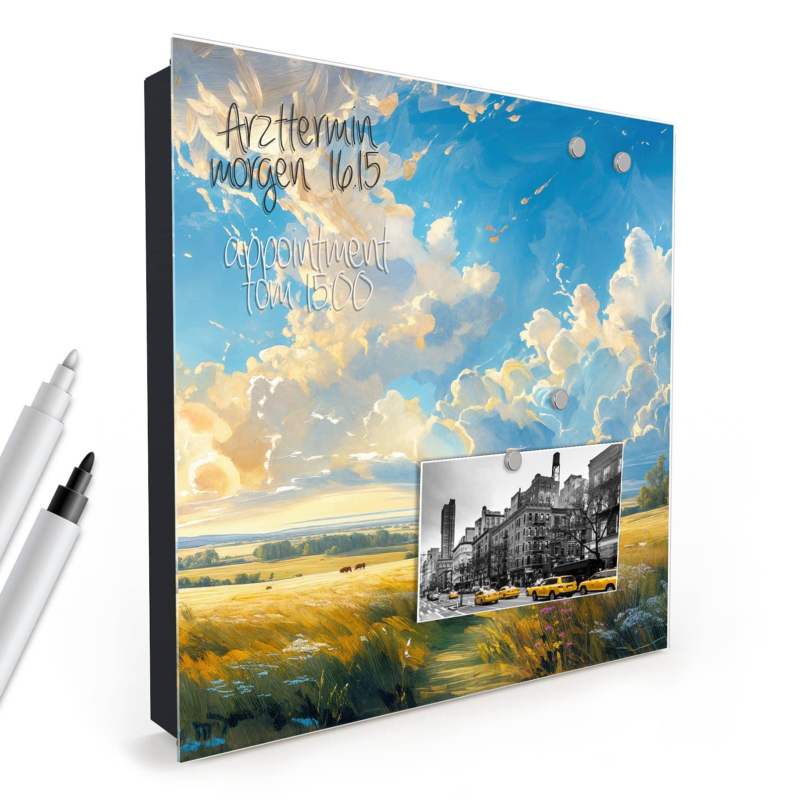 Der Schlüsselkasten ist nicht nur ein praktischer Organizer, sondern auch ein dekoratives Highlight. Die Glasfront ist magnetisch und kann mit den beigelegten Magnetpins individuell gestaltet werden. Ob wichtige Notizen, To-Do-Listen oder Fotos – der Schlüsselkasten wird zur multifunktionalen Pinnwand. Zudem ist die Glastür beschreibbar und bietet so zusätzlichen Platz für kreative Ideen oder Erinnerungen.