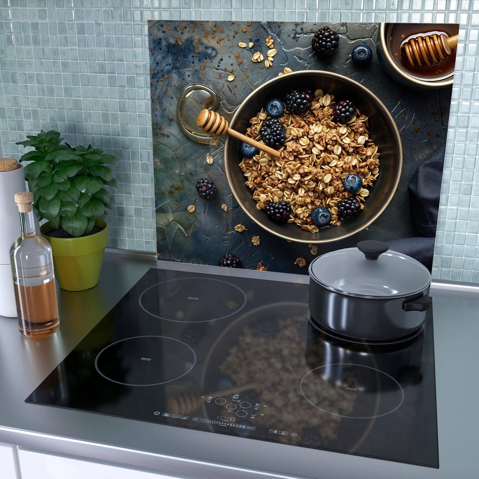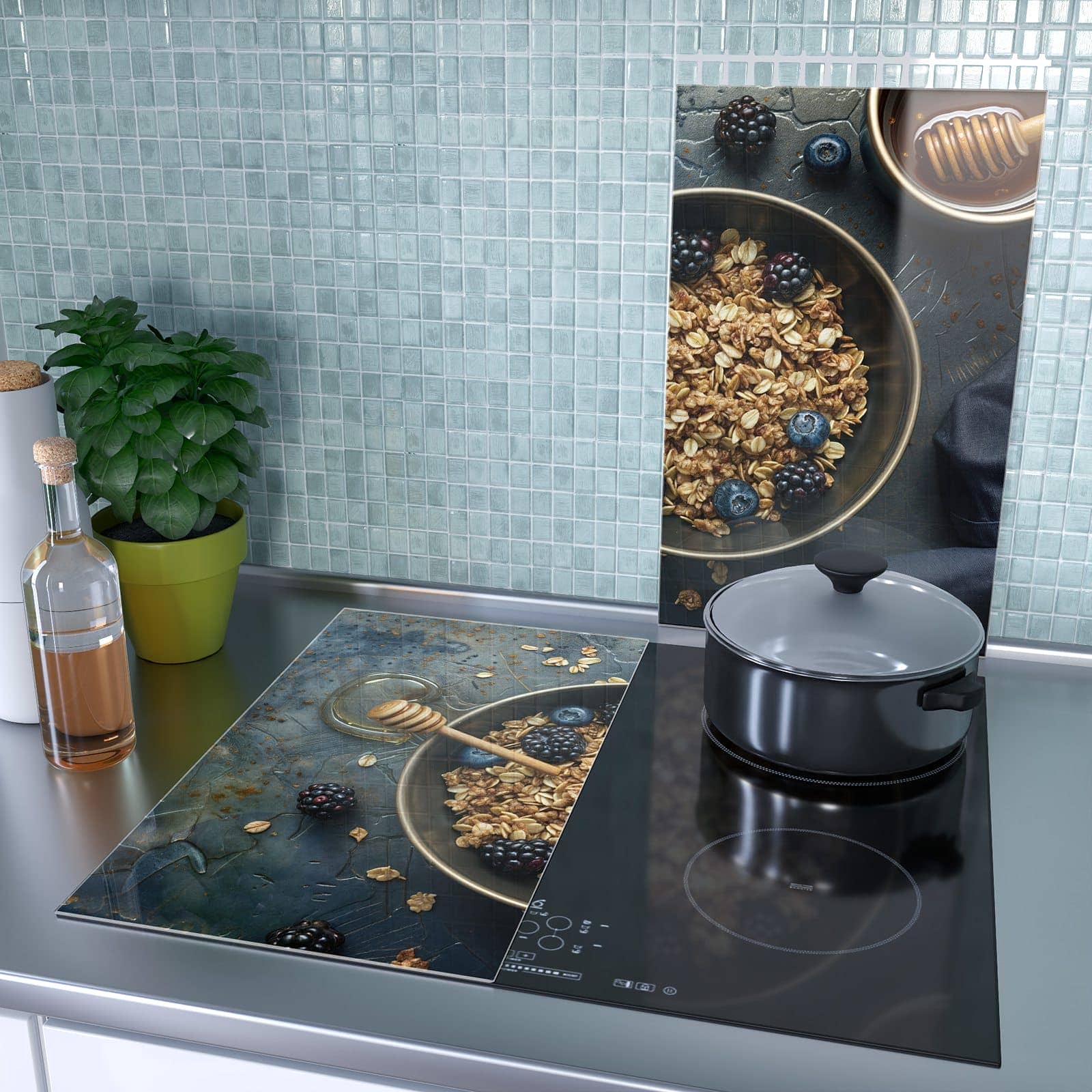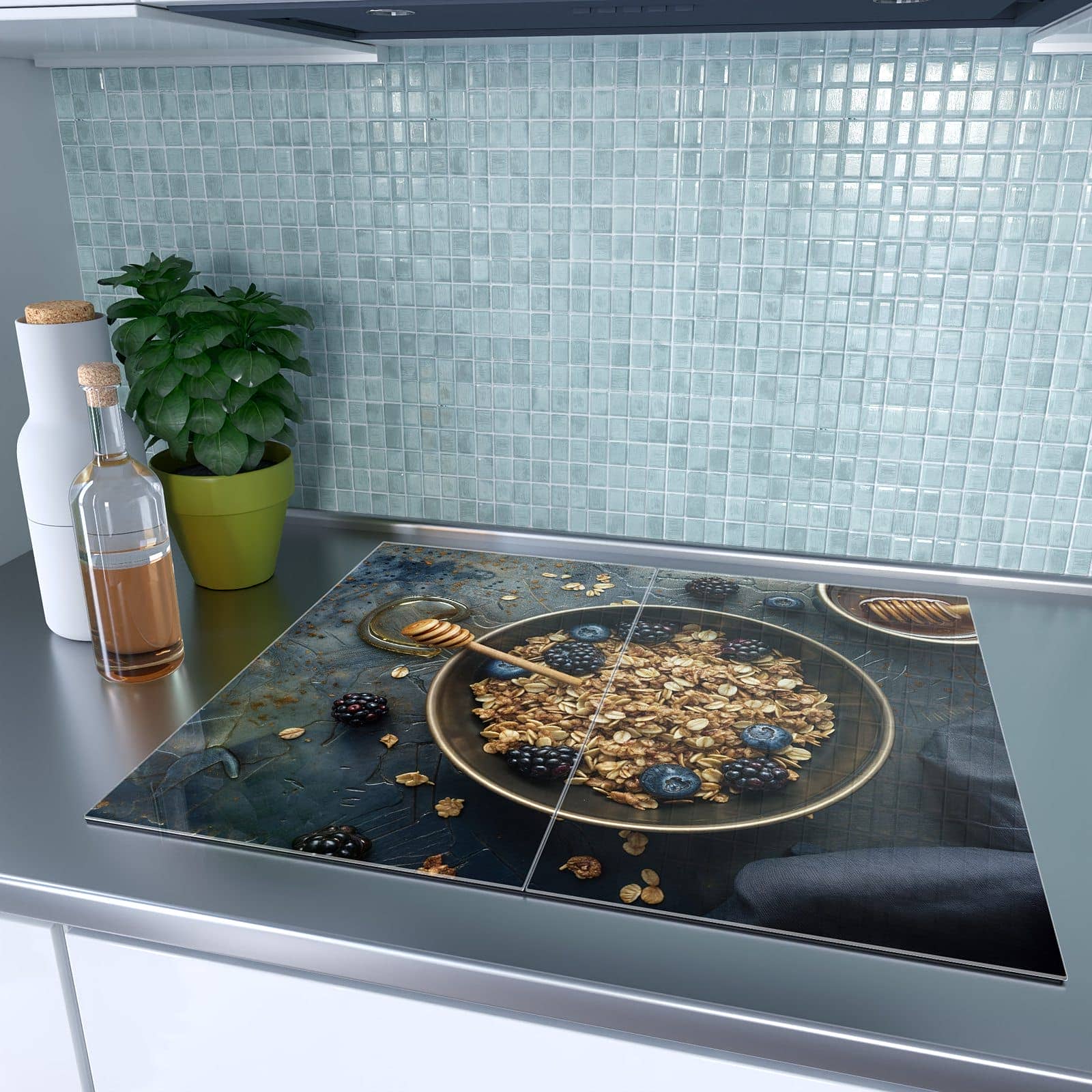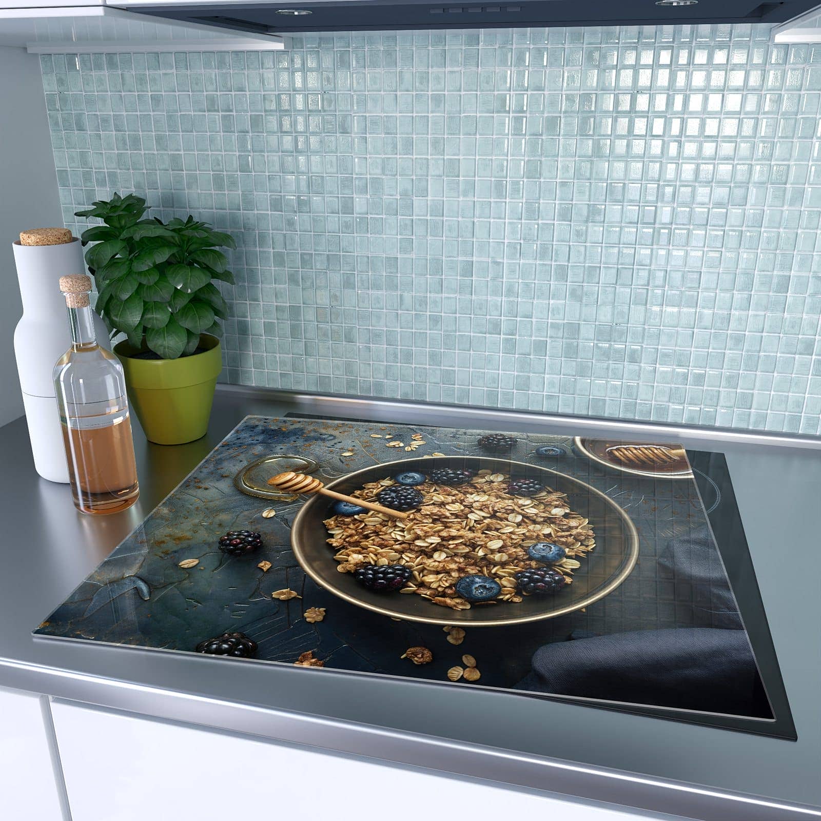 Mit einer Dicke von 4 mm besteht die Platte aus gehärtetem Glas, das sich durch seine robuste Beschaffenheit auszeichnet. Dies macht sie widerstandsfähig gegen Schnitte, Kratzer und Stöße. Die Oberfläche der Abdeckplatte ist zudem mit einer speziellen Folie versehen, die für beeindruckende Farbbrillanz und Farbtiefe sorgt. Das Motiv Müsli mit Beeren wird detailreich auf das Glas gedruckt.