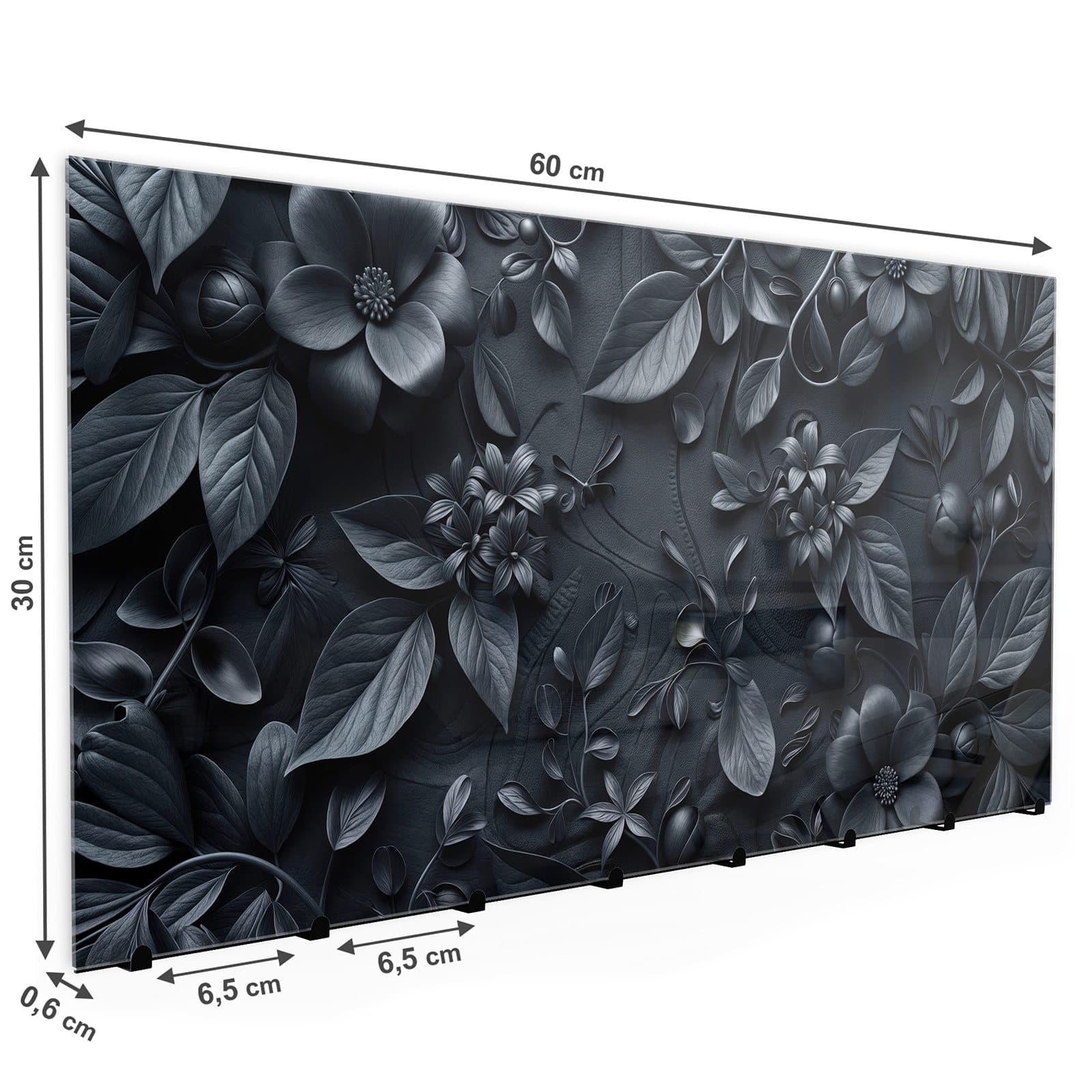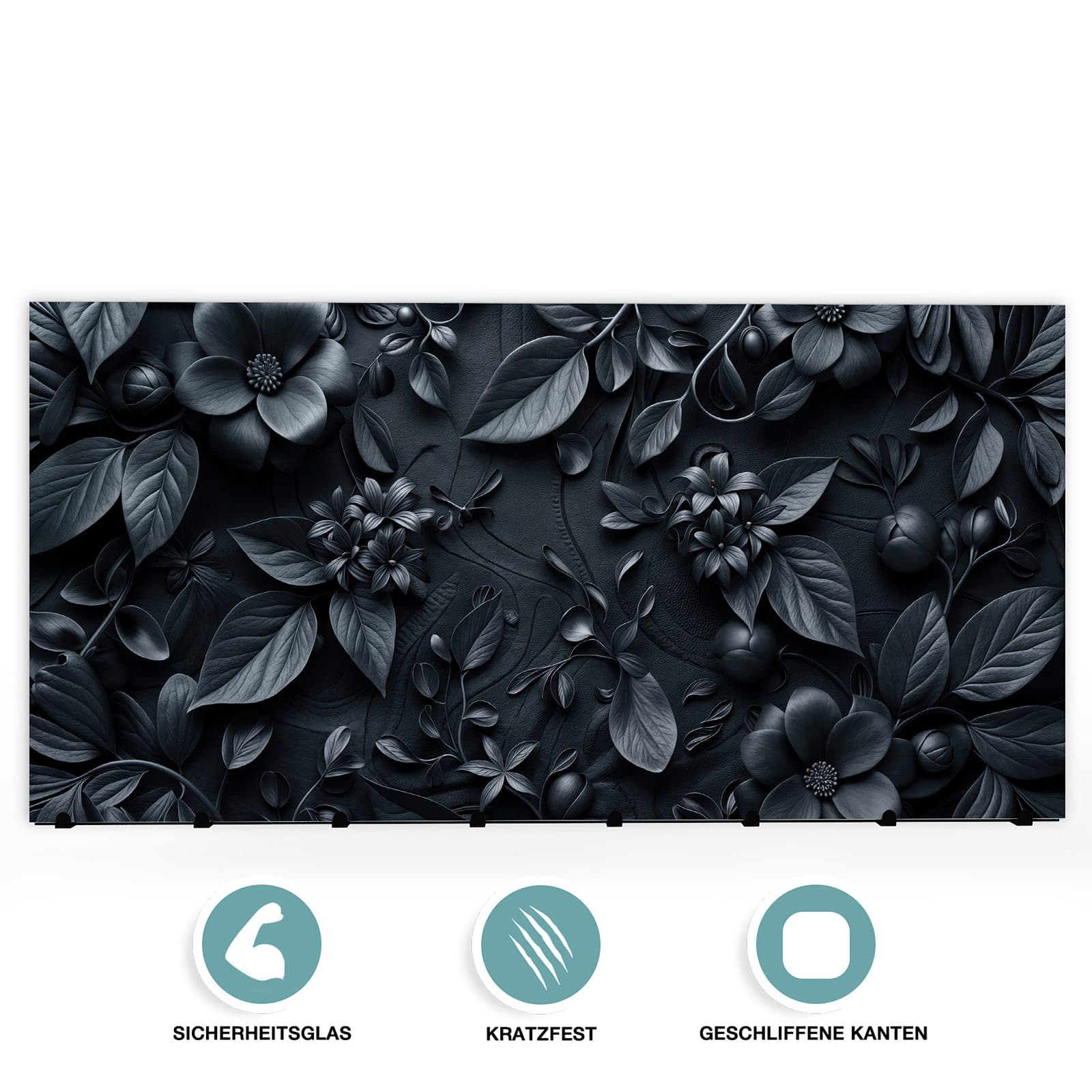 Bei der Herstellung der Wandgarderobe wird besonderer Wert auf Qualität und Langlebigkeit gelegt. Die Vorderseite besteht aus 4 mm dickem gehärtetem Sicherheitsglas, das nicht nur robust ist, sondern auch durch seinen hochwertigen und farbbrillanten Druck besticht. Dieser Druck verleiht der Garderobe mit dem Motiv [MOTIVNAME] ein lebendiges und attraktives Aussehen. Die Rückseite ist aus schwarz lackiertem, rostfreiem Edelstahl gefertigt, was die Kombination sowohl ästhetisch ansprechend als auch besonders langlebig und robust macht.