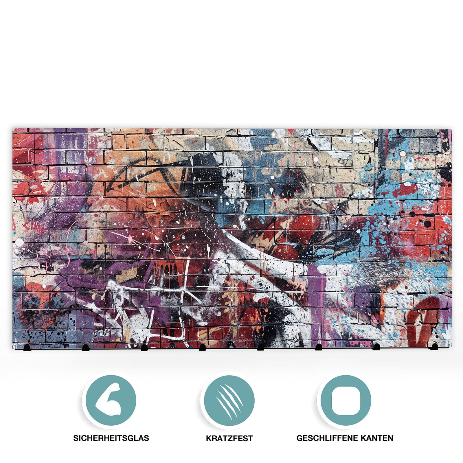 Bei der Herstellung der Wandgarderobe wird besonderer Wert auf Qualität und Langlebigkeit gelegt. Die Vorderseite besteht aus 4 mm dickem gehärtetem Sicherheitsglas, das nicht nur robust ist, sondern auch durch seinen hochwertigen und farbbrillanten Druck besticht. Dieser Druck verleiht der Garderobe mit dem Motiv [MOTIVNAME] ein lebendiges und attraktives Aussehen. Die Rückseite ist aus schwarz lackiertem, rostfreiem Edelstahl gefertigt, was die Kombination sowohl ästhetisch ansprechend als auch besonders langlebig und robust macht.