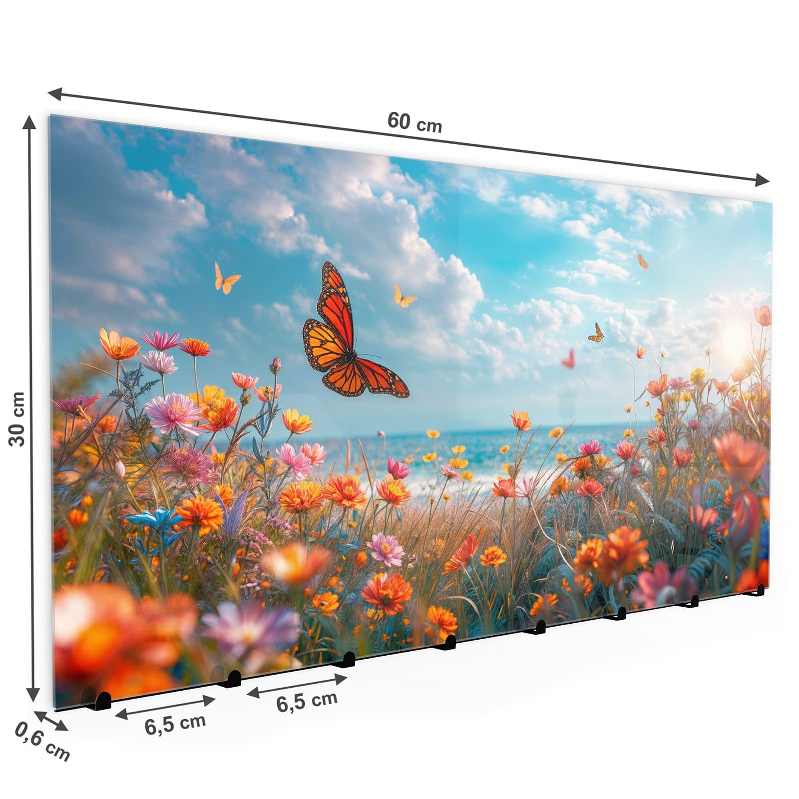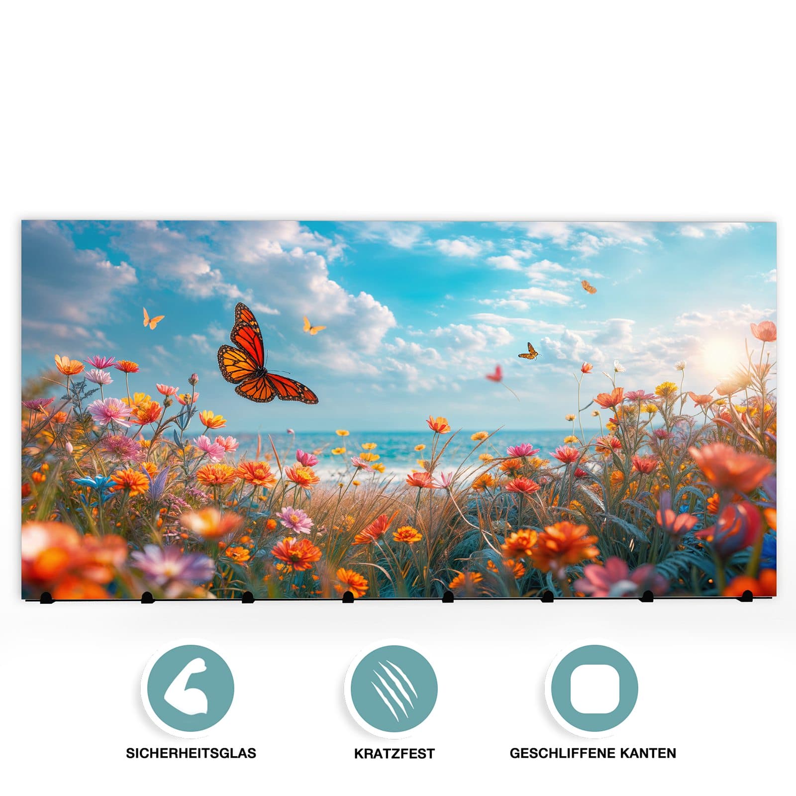 Bei der Herstellung der Wandgarderobe wird besonderer Wert auf Qualität und Langlebigkeit gelegt. Die Vorderseite besteht aus 4 mm dickem gehärtetem Sicherheitsglas, das nicht nur robust ist, sondern auch durch seinen hochwertigen und farbbrillanten Druck besticht. Dieser Druck verleiht der Garderobe mit dem Motiv [MOTIVNAME] ein lebendiges und attraktives Aussehen. Die Rückseite ist aus schwarz lackiertem, rostfreiem Edelstahl gefertigt, was die Kombination sowohl ästhetisch ansprechend als auch besonders langlebig und robust macht.