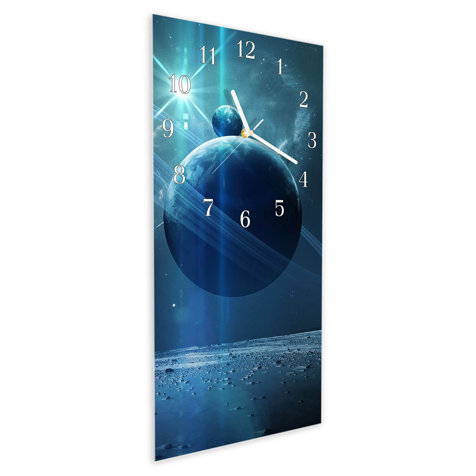 Mit einer Stärke von 4 mm besteht die Uhr aus gehärtetem Glas, das sich durch seine robuste und langlebige Beschaffenheit auszeichnet. Dies macht sie widerstandsfähig gegen alltägliche Beanspruchungen. Die glasüberzogene Oberfläche sorgt für eine beeindruckende Farbbrillanz und Tiefe. Das Motiv Planeten im Raum mit Nebel wird detailreich und mit hochauflösender Qualität auf das Glas gedruckt.