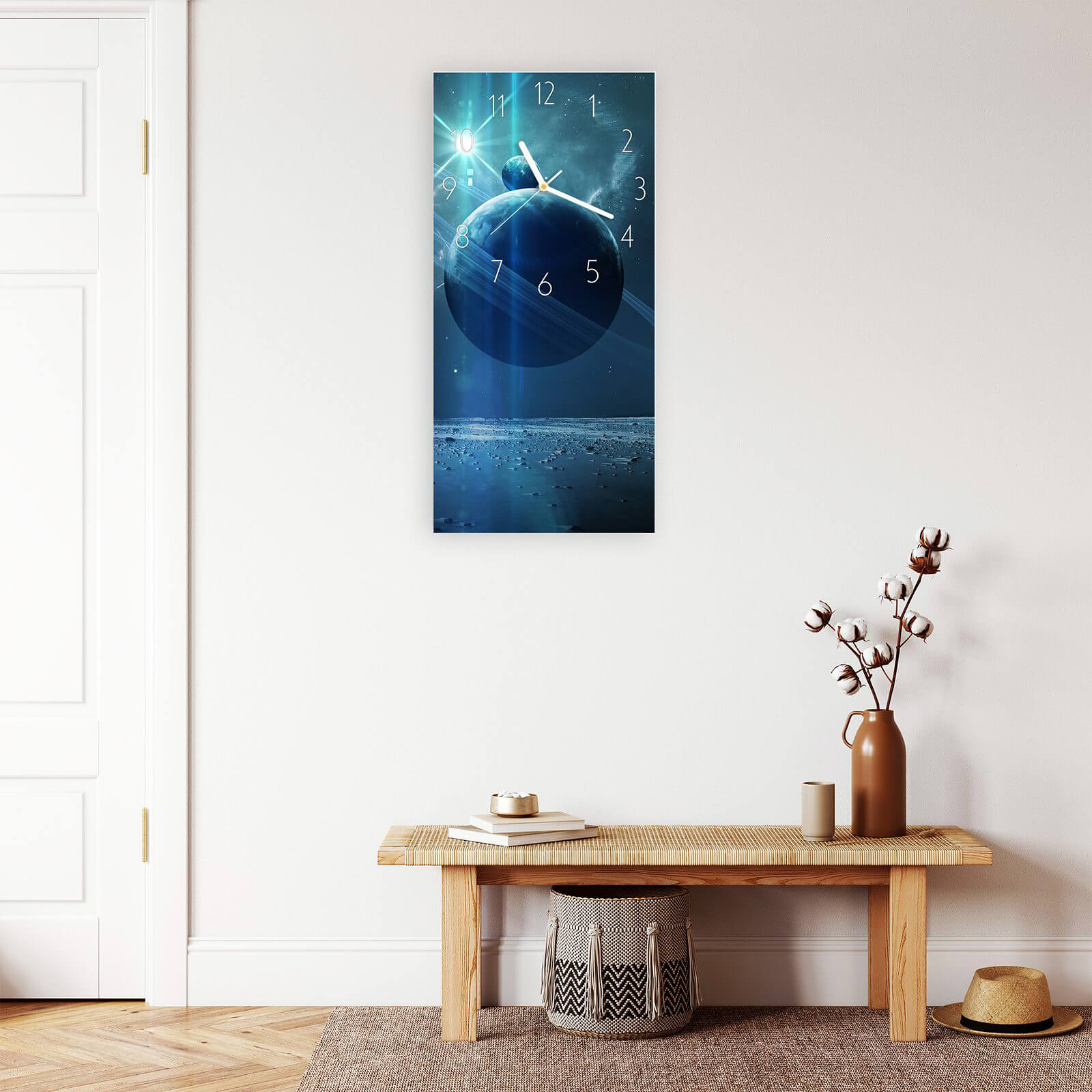 Wanduhr Hochformat - Planeten im Raum mit Nebel