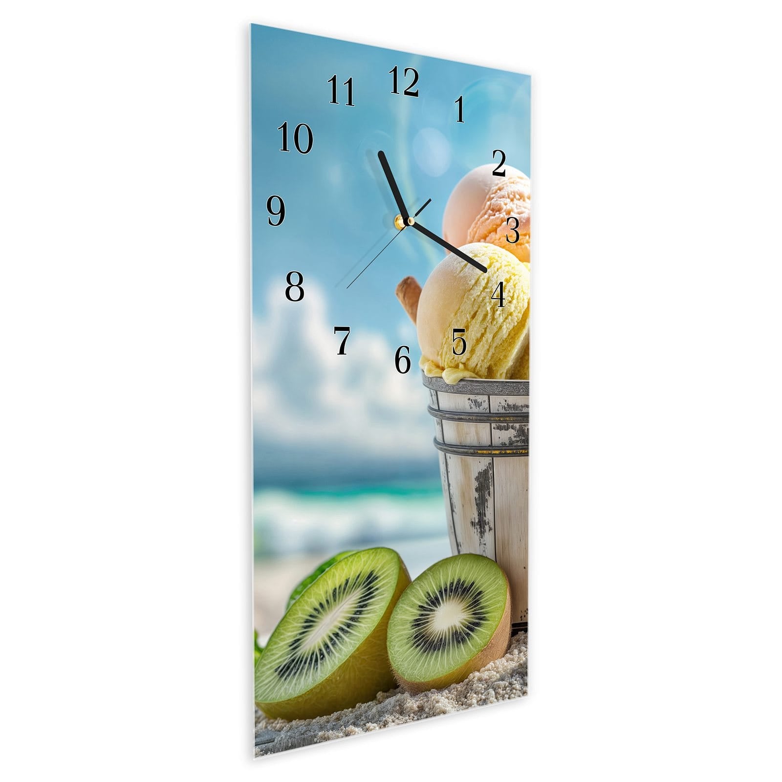 Mit einer Stärke von 4 mm besteht die Uhr aus gehärtetem Glas, das sich durch seine robuste und langlebige Beschaffenheit auszeichnet. Dies macht sie widerstandsfähig gegen alltägliche Beanspruchungen. Die glasüberzogene Oberfläche sorgt für eine beeindruckende Farbbrillanz und Tiefe. Das Motiv Sommerliches Eis wird detailreich und mit hochauflösender Qualität auf das Glas gedruckt.