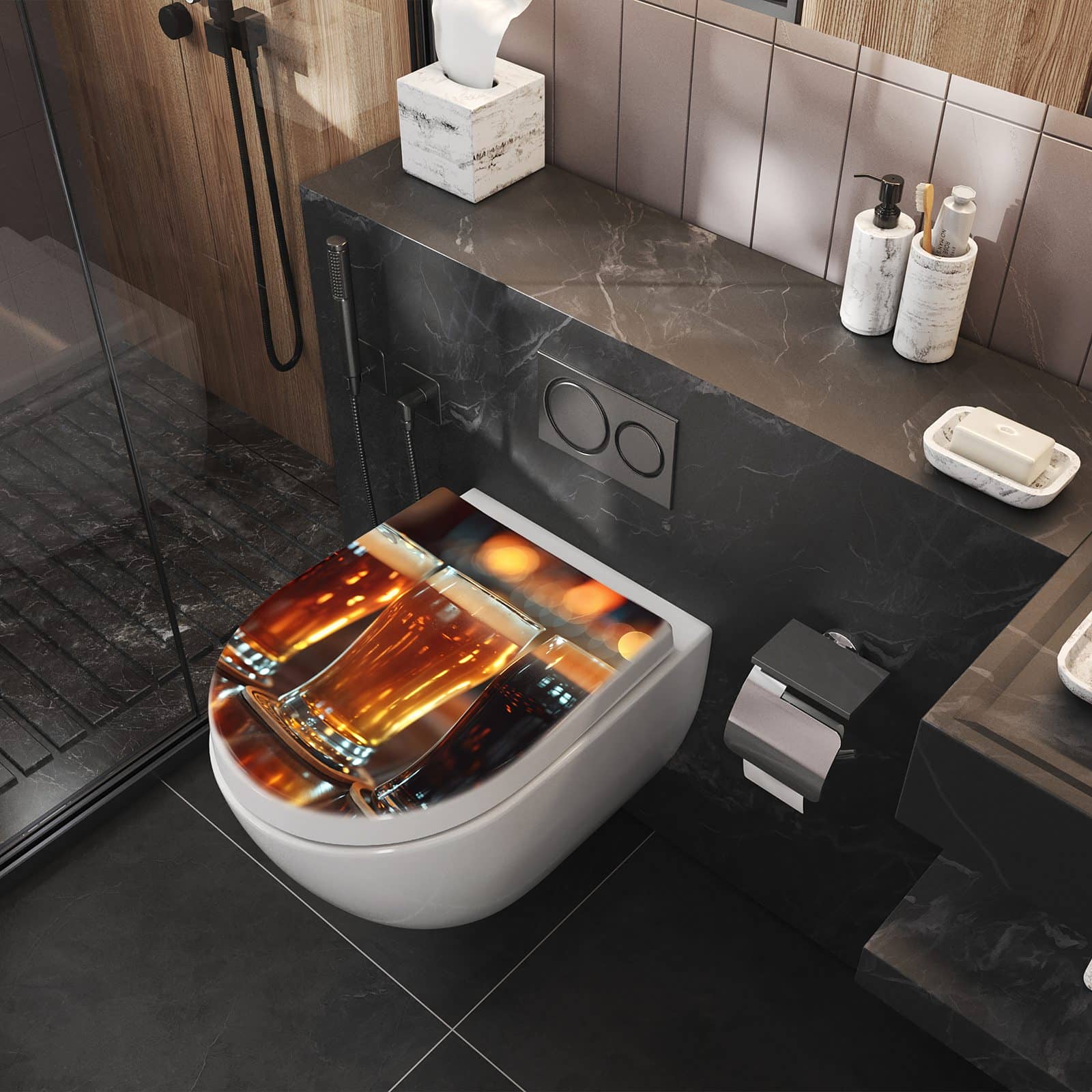 Der Toilettensitz mit dem Motiv Drei Biergläser Bar überzeugt nicht nur durch sein Design, sondern auch durch durchdachte Funktionen. Die Soft-Close-Technik sorgt für ein leises Schließen von Deckel und Brille – ohne Zuschlagen. Die glatte Oberfläche aus Duroplast ist widerstandsfähig, pflegeleicht und hygienisch. Das verstellbare Scharnier mit rostfreiem Edelstahleinsatz ermöglicht eine einfache und passgenaue Montage an handelsüblichen WC-Becken.