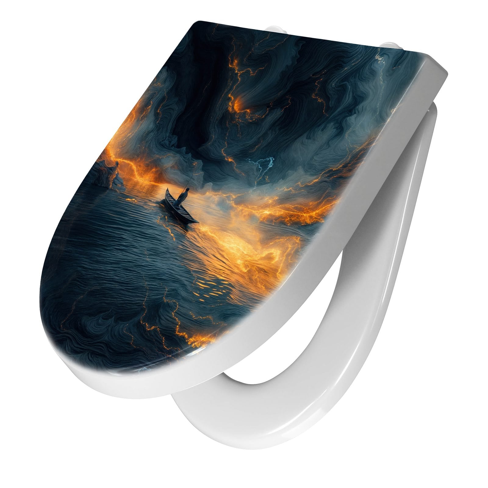 Der Toilettensitz mit dem Motiv Feuer und Wasser überzeugt nicht nur durch sein Design, sondern auch durch durchdachte Funktionen. Die Soft-Close-Technik sorgt für ein leises Schließen von Deckel und Brille – ohne Zuschlagen. Die glatte Oberfläche aus Duroplast ist widerstandsfähig, pflegeleicht und hygienisch. Das verstellbare Scharnier mit rostfreiem Edelstahleinsatz ermöglicht eine einfache und passgenaue Montage an handelsüblichen WC-Becken.